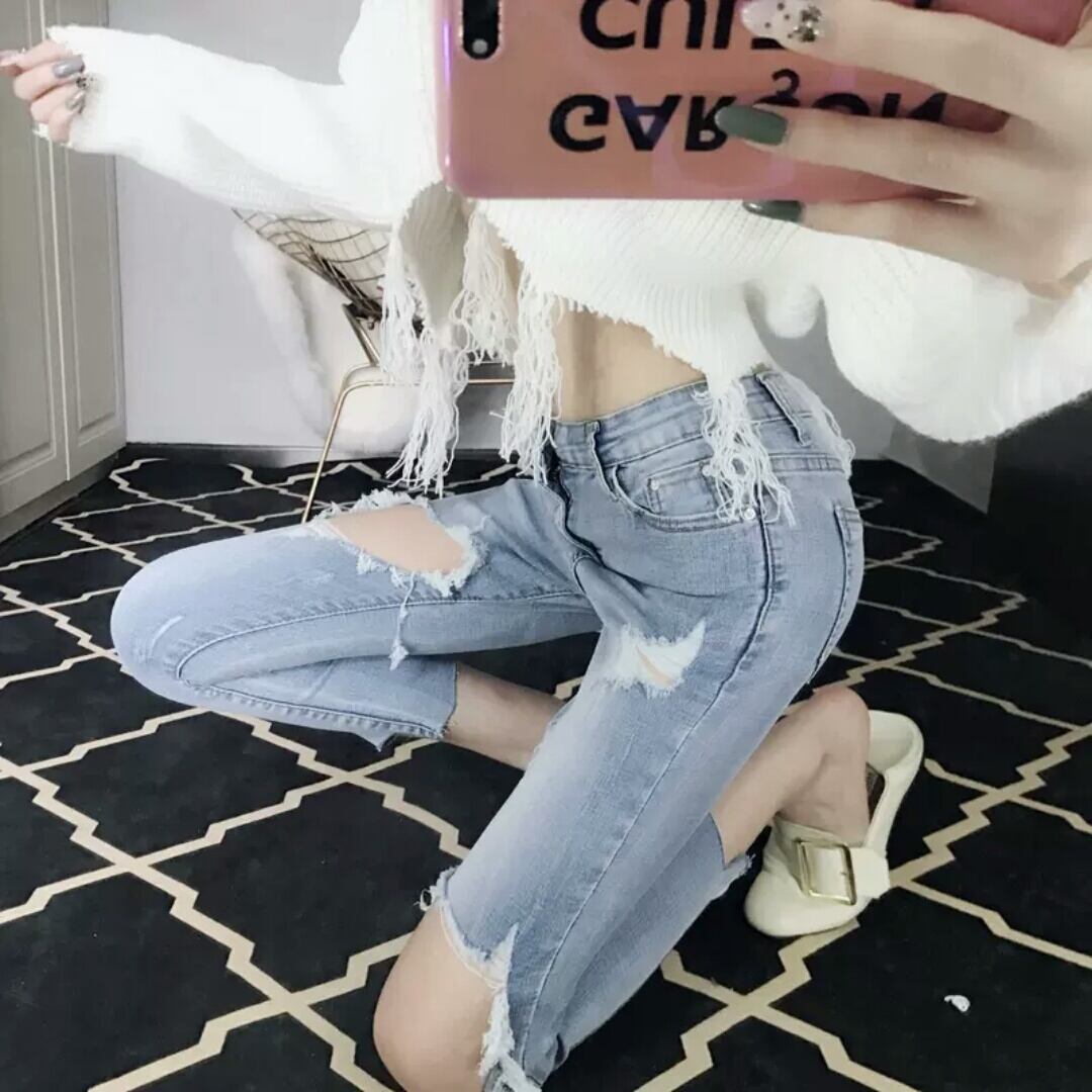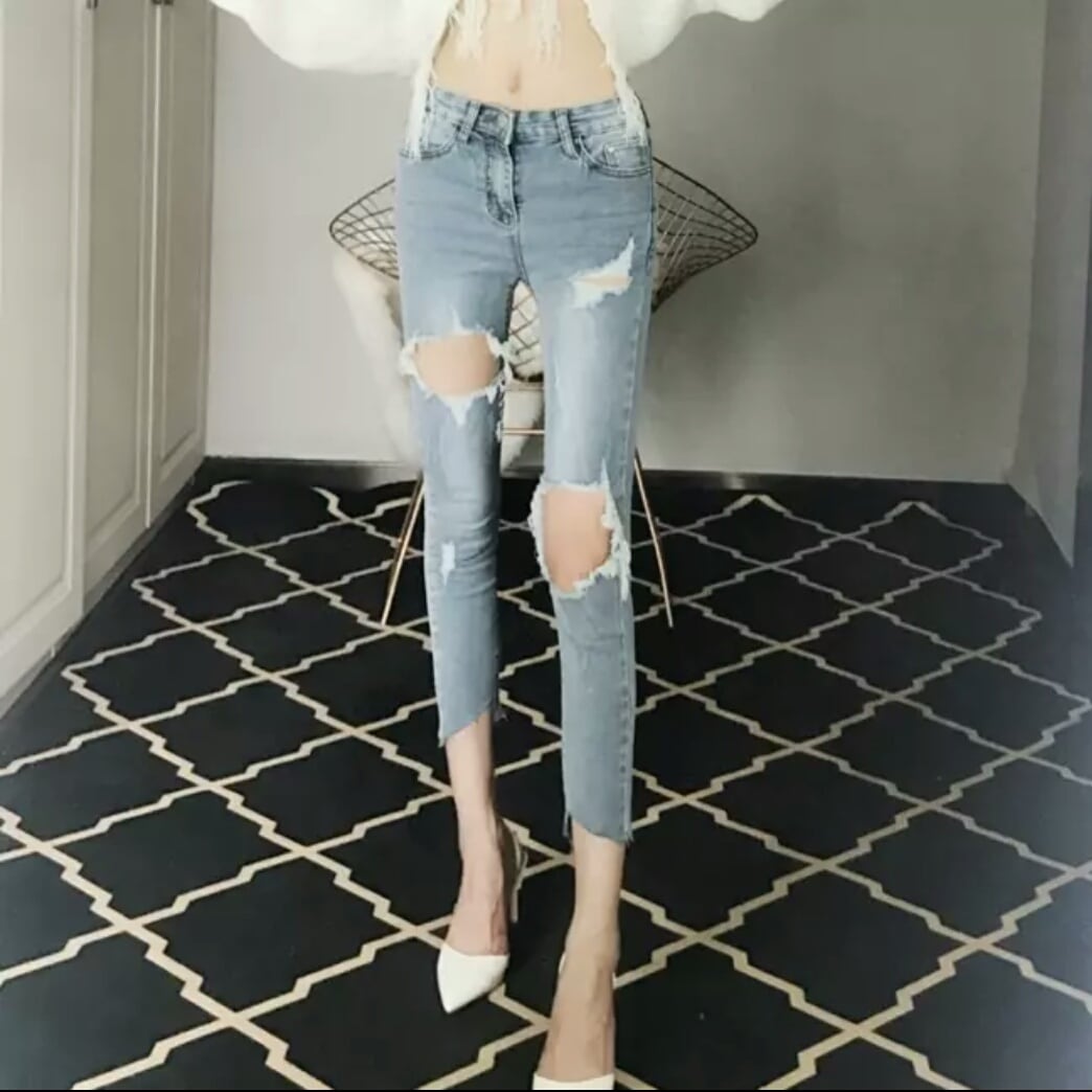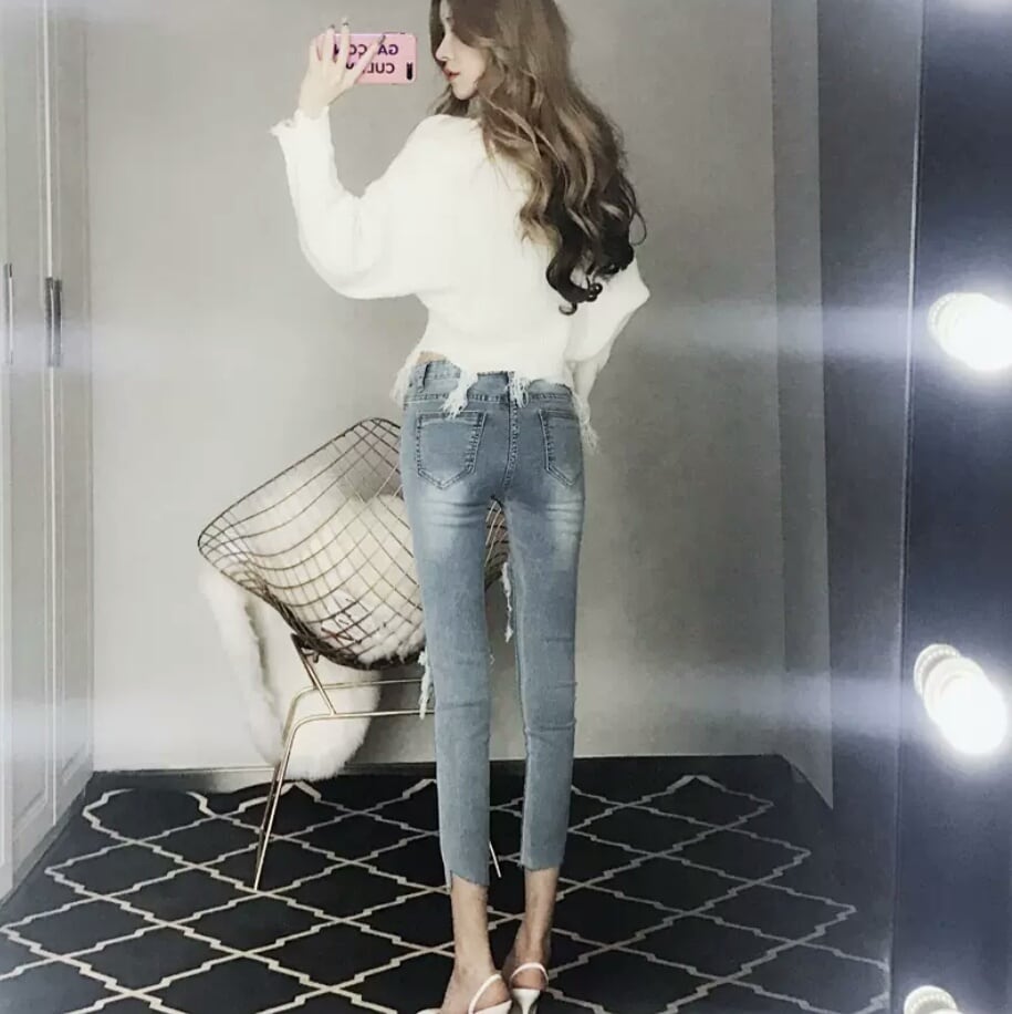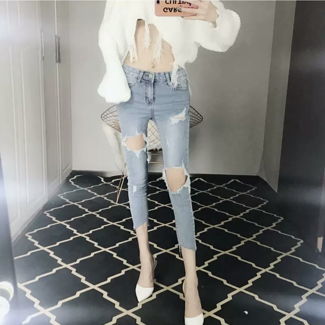 ダメージ ジーンズ デニム ハイウエスト スリム スキニー 大人 カジュアル キレイめ 可愛い モード系 お出かけ お買い物 デート 女子会 春 夏 通学 学生 通勤 韓国ファッション
