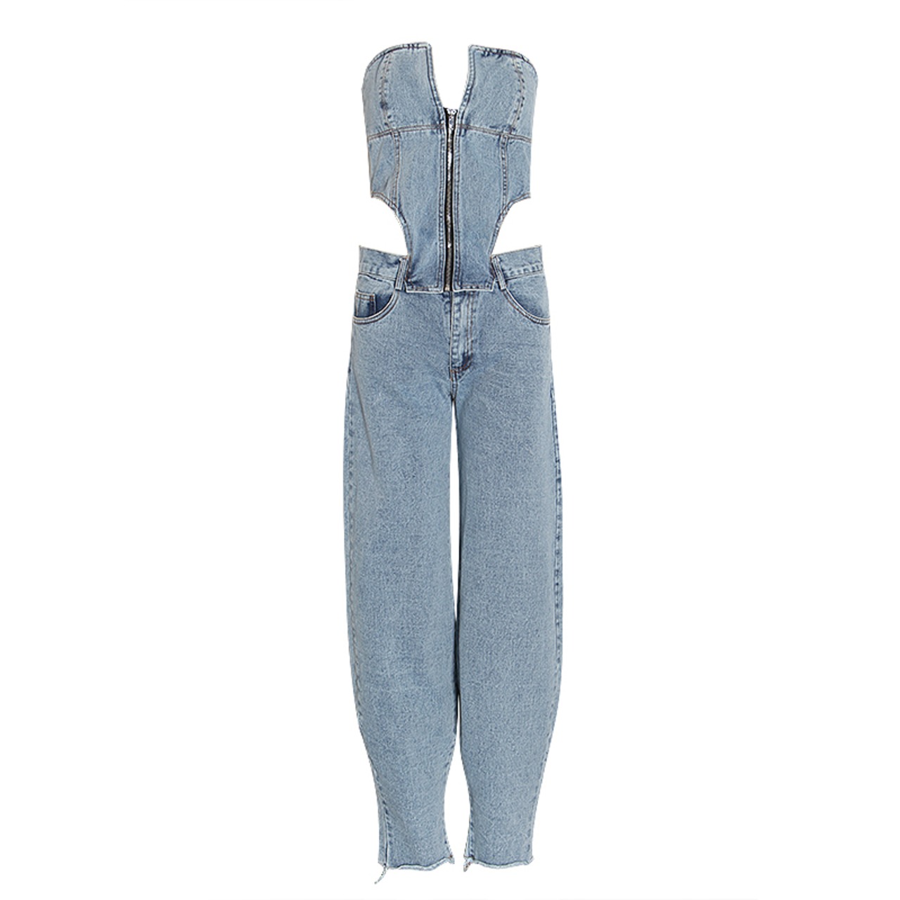 デニムジャンプスーツ 個性的 ユニーク ジーンズ セクシー ジッパー デニムパンツ ワイドパンツ ストリート系 ロック チューブトップ カジュアル ラフ 春 夏