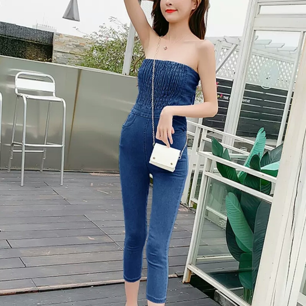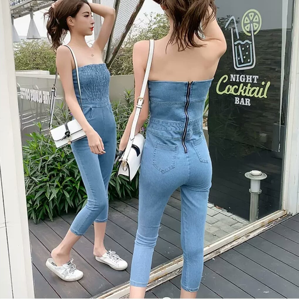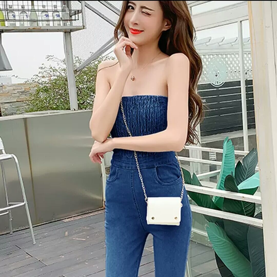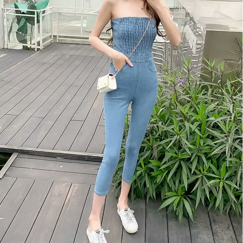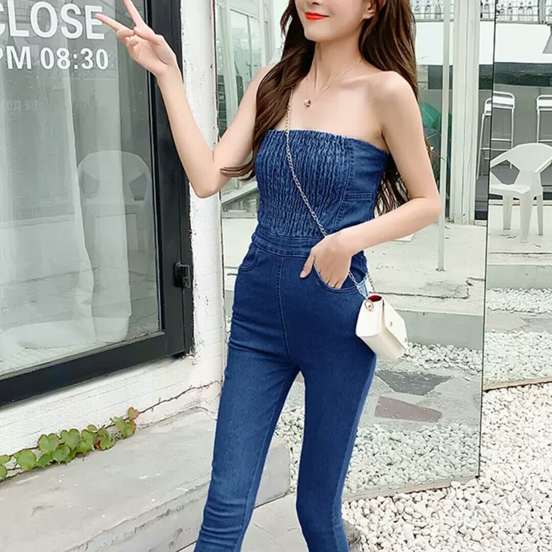 全2色 チューブトップ デニム オールインワン ジーンズ パンツ ストラップレス 大人 カジュアル 可愛い キレイめ セクシー スタイリッシュ お出かけ お買い物 デート 女子会 春 夏 通学 学生 通勤 韓国ファッション