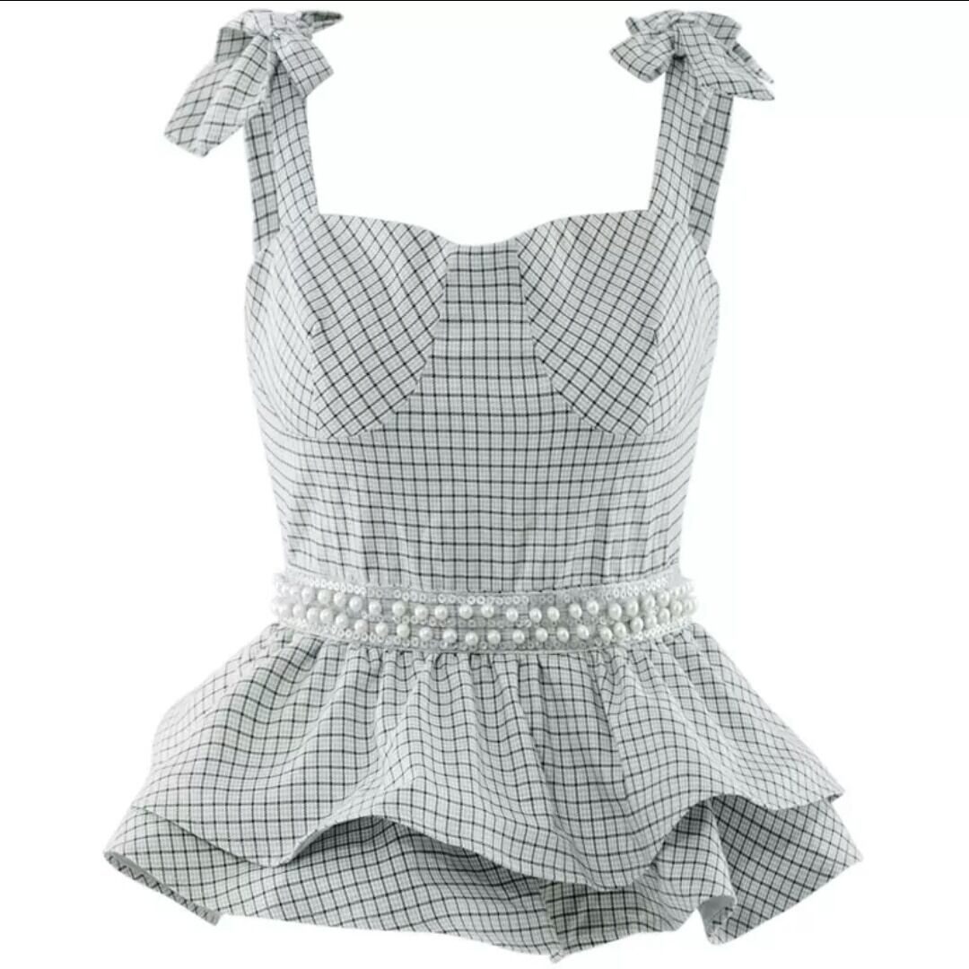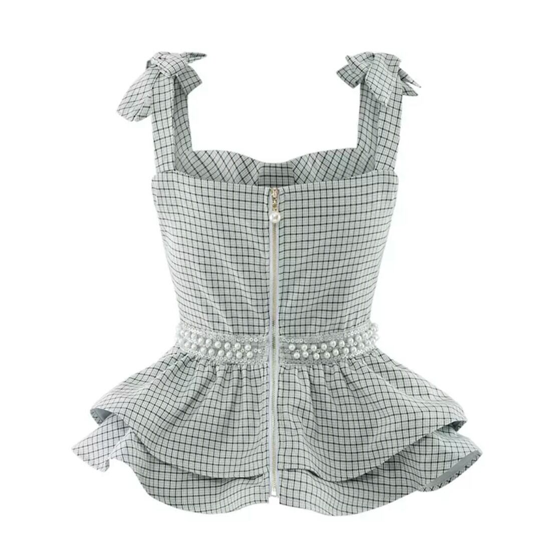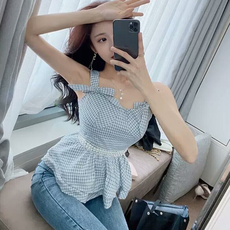 チェック柄 フリル サスペンダー シャツ ブラウス ノースリーブ パール スリム 大人 可愛い キレイめ カジュアル エレガント 上品 お出かけ お買い物 デート 女子会 春 夏 通学 学生 通勤 韓国ファッション