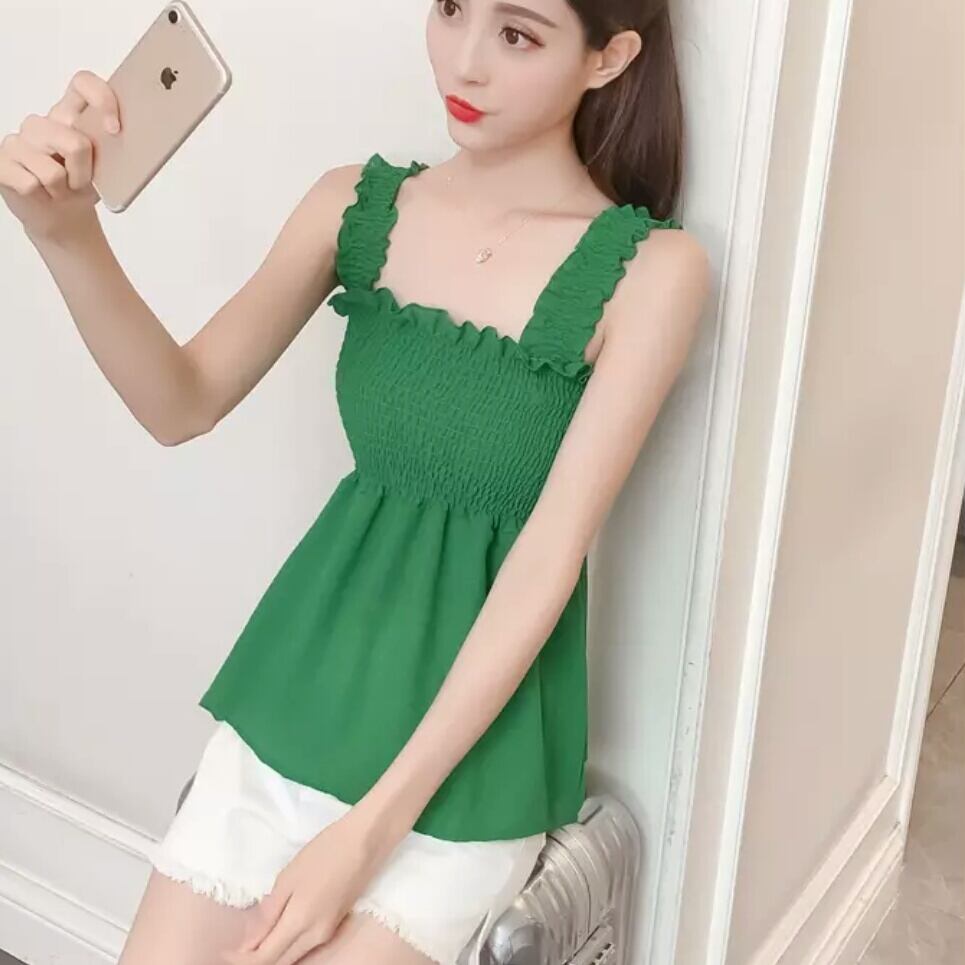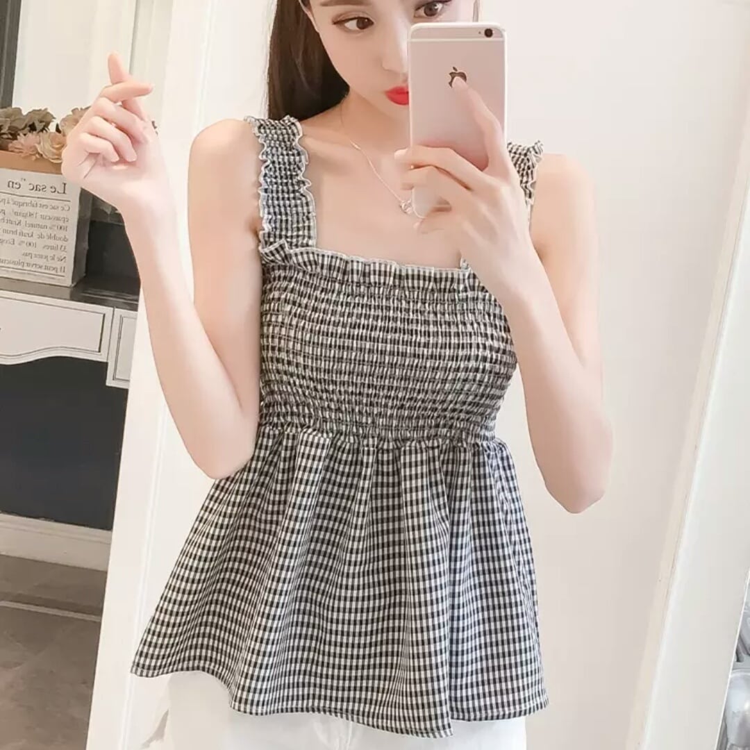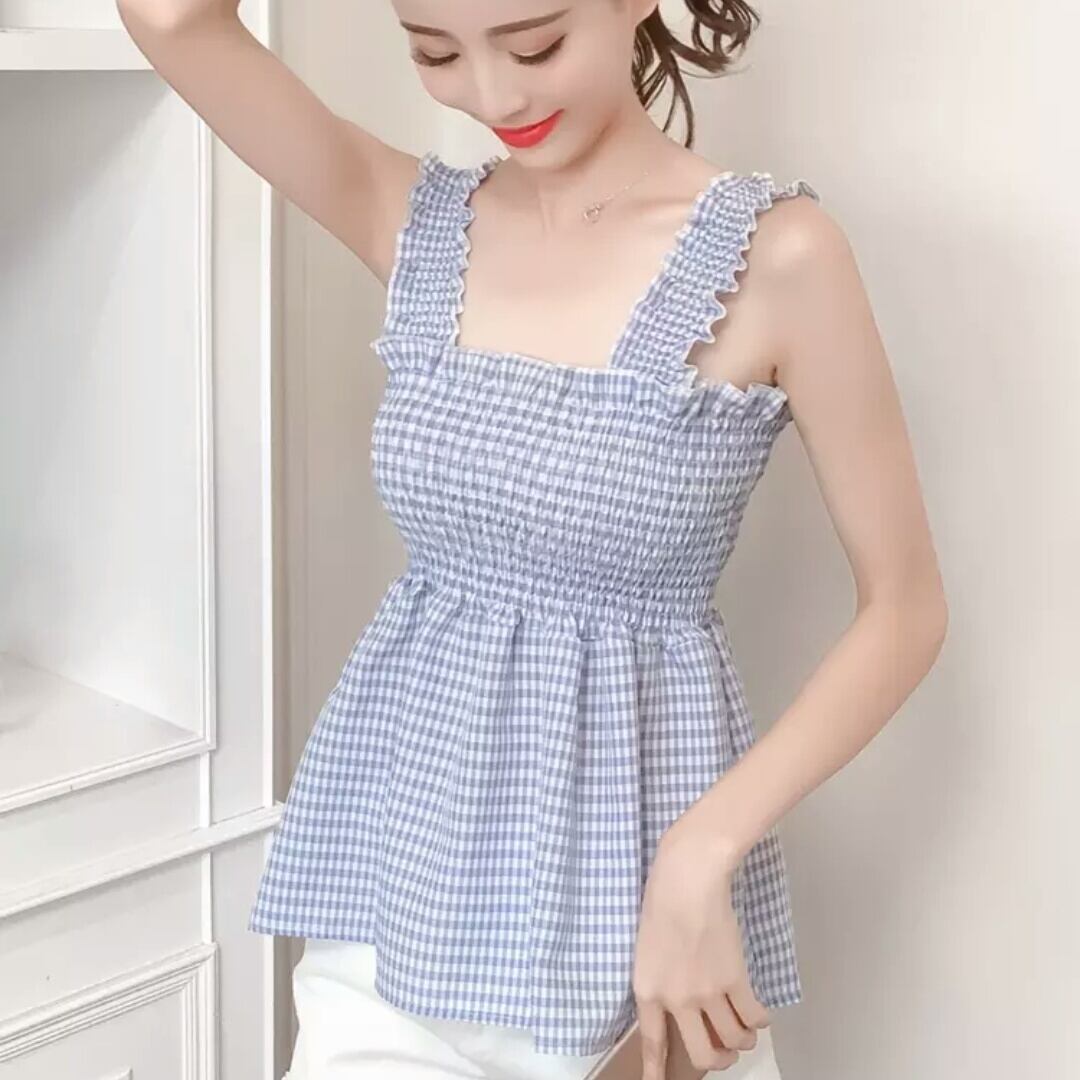 全5色 ノースリーブ フリル シャツ ブラウス キャミソール チェック 無地 大人 可愛い キレイめ カジュアル 上品 お出かけ お買い物 デート 女子会 春 夏 通学 学生 通勤 韓国ファッション