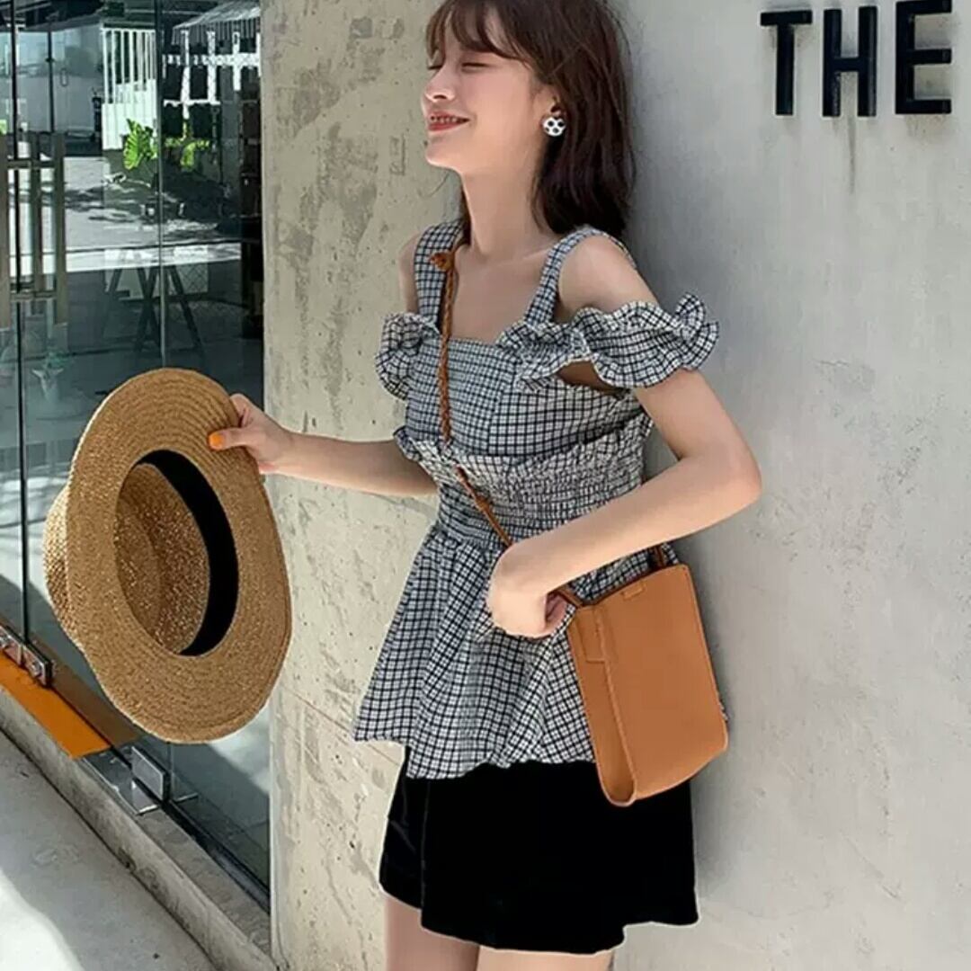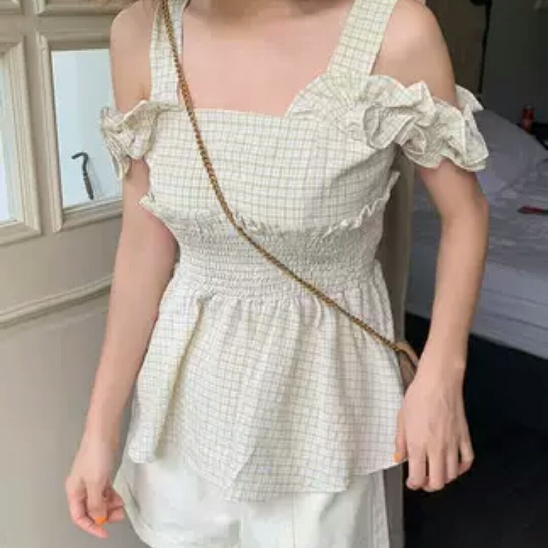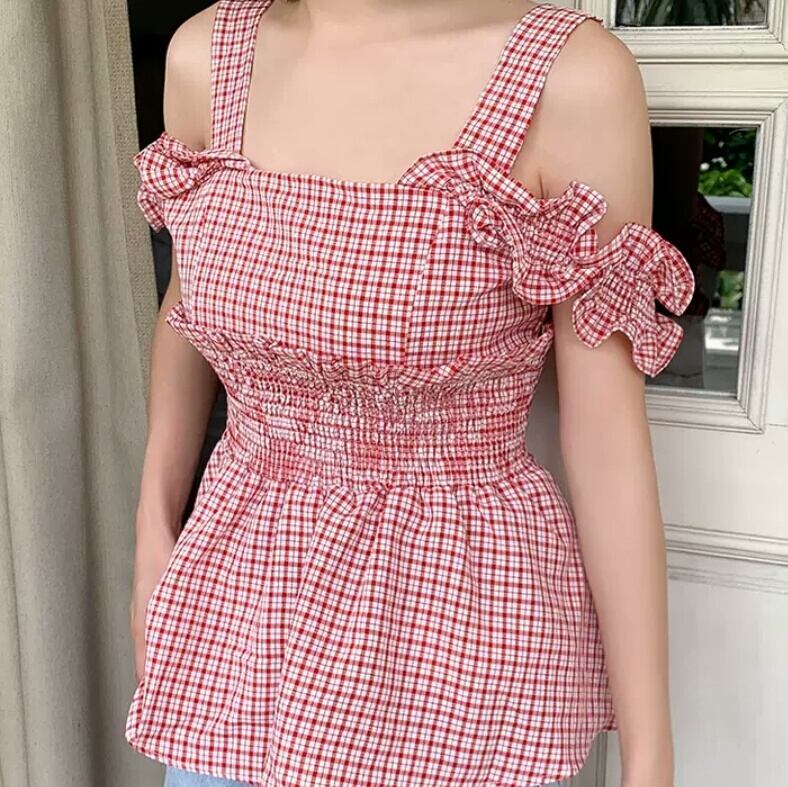 全4色 チェック柄 フリル サスペンダー シャツ ブラウス ノースリーブ オフショルダー 大人 可愛い キレイめ カジュアル お出かけ お買い物 デート 女子会 春 夏 通学 学生 通勤 韓国ファッション