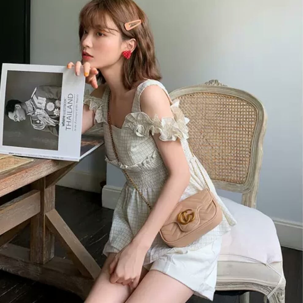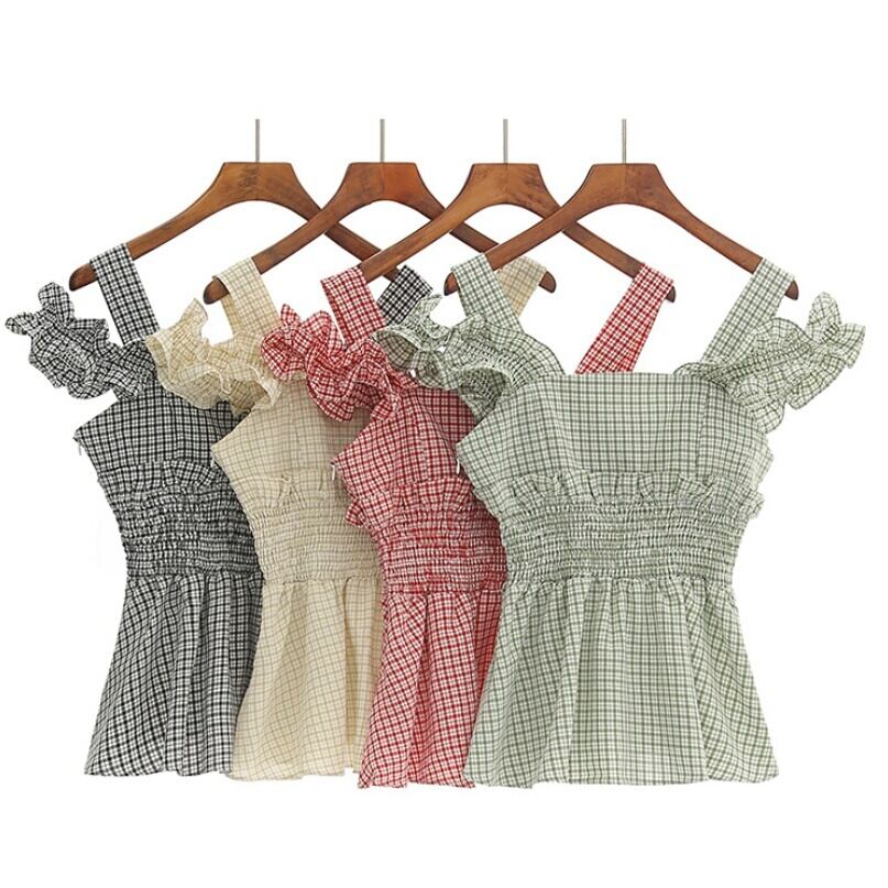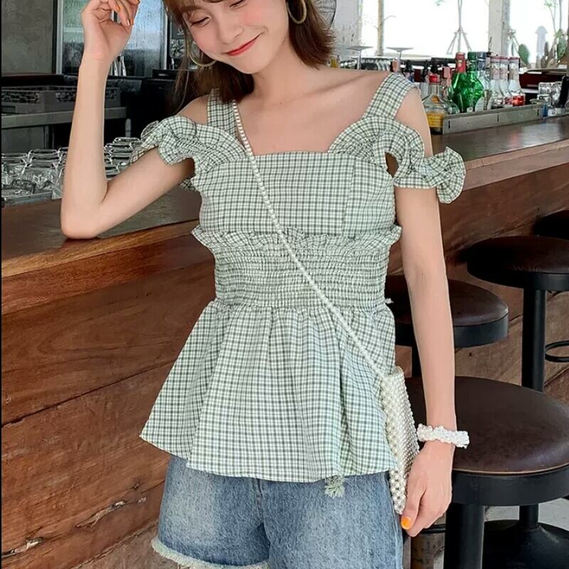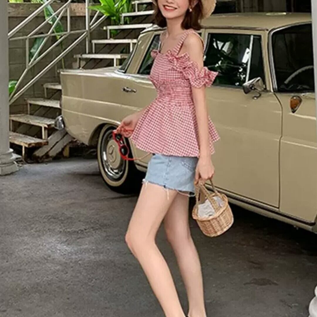 全4色 チェック柄 フリル サスペンダー シャツ ブラウス ノースリーブ オフショルダー 大人 可愛い キレイめ カジュアル お出かけ お買い物 デート 女子会 春 夏 通学 学生 通勤 韓国ファッション