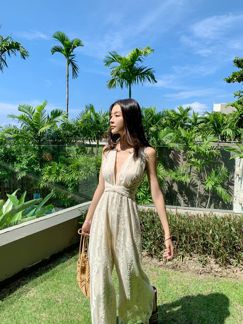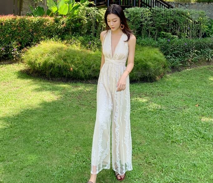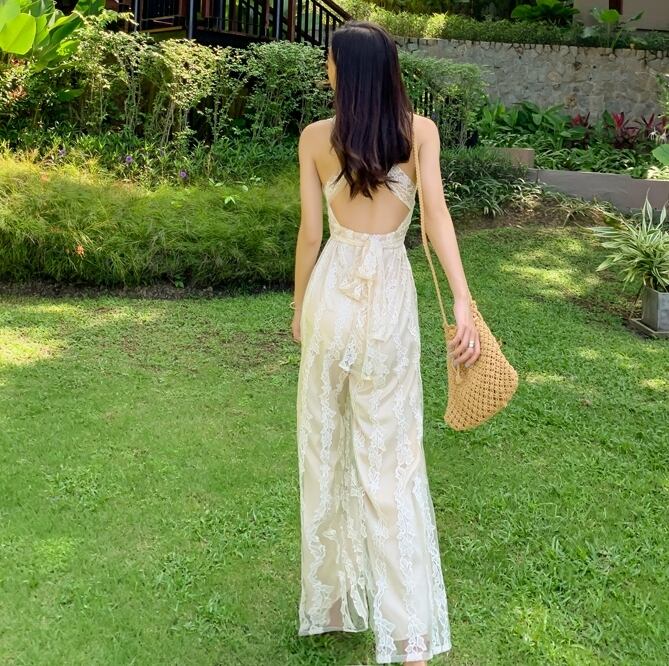 ジャンプスーツ オールインワン サロペット バックシャン 背中見せ ワイドレッグ Vネック ノースリーブ ハイウエスト リボン カジュアル きれいめ 上品 大人可愛い 夏