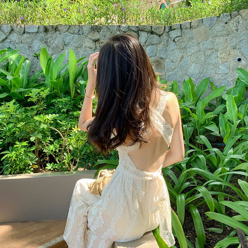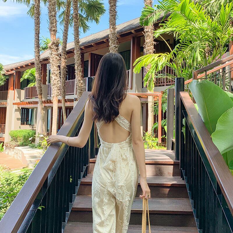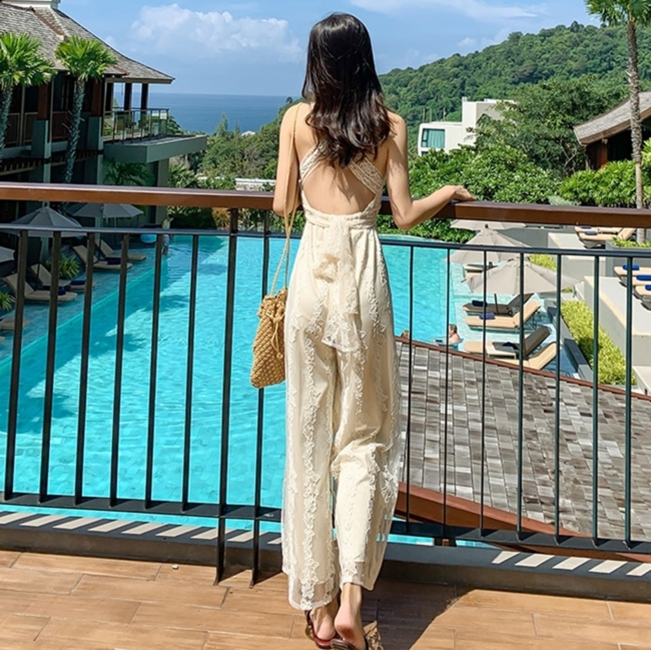 背中が開いたバックスタイルが大人の抜け感を演出するサロペット。