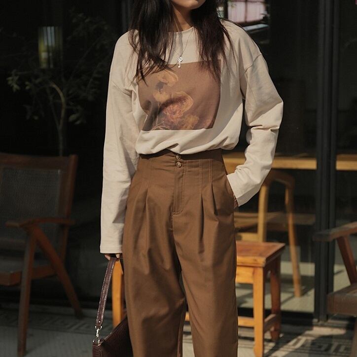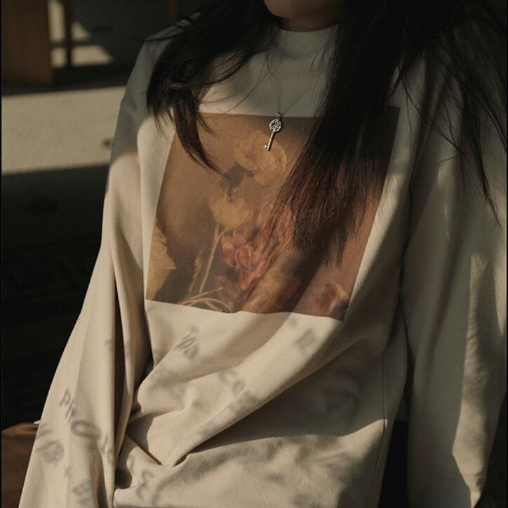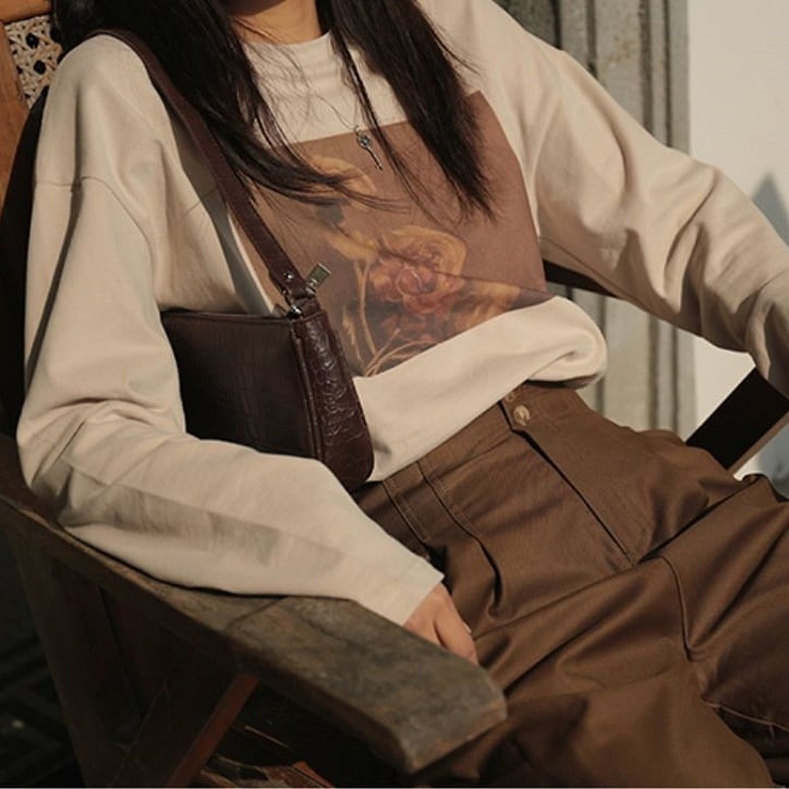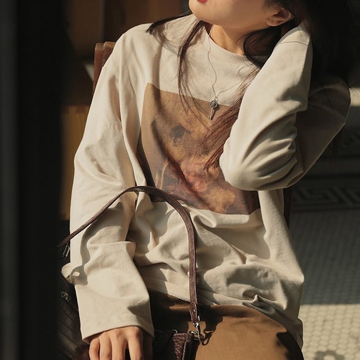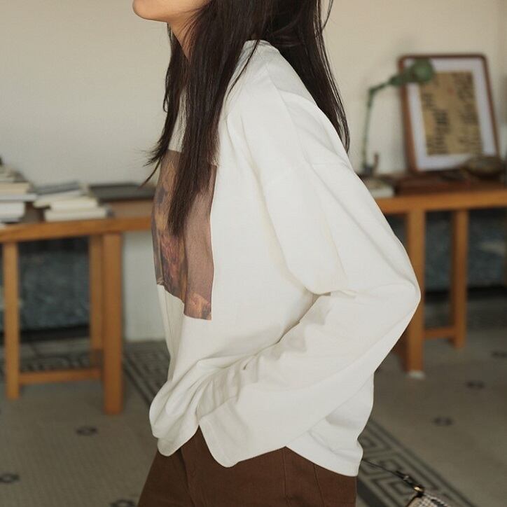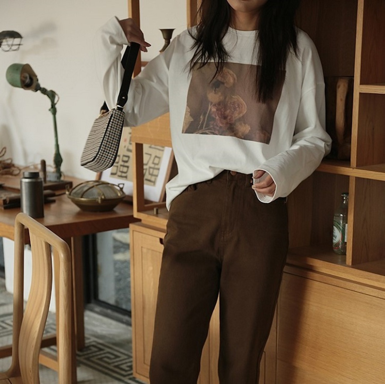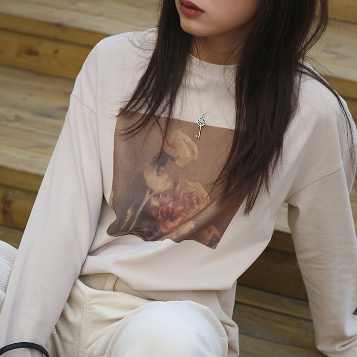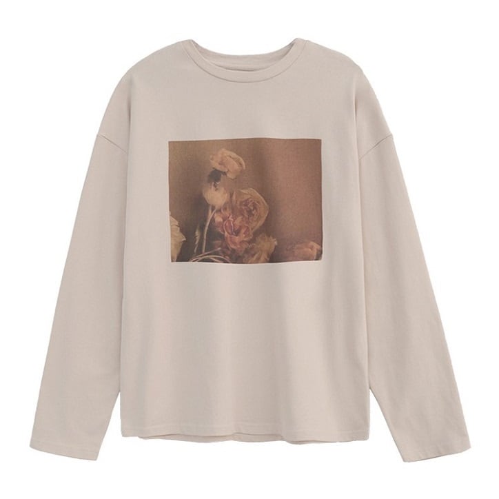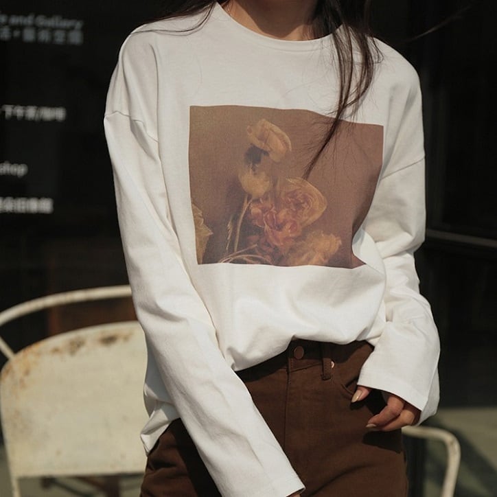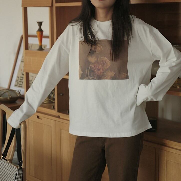 全2色 長袖Tシャツ ラウンドネック コットン フラワープリント レトロ カジュアル お出かけ デイリー 春 ホワイト ベージュ