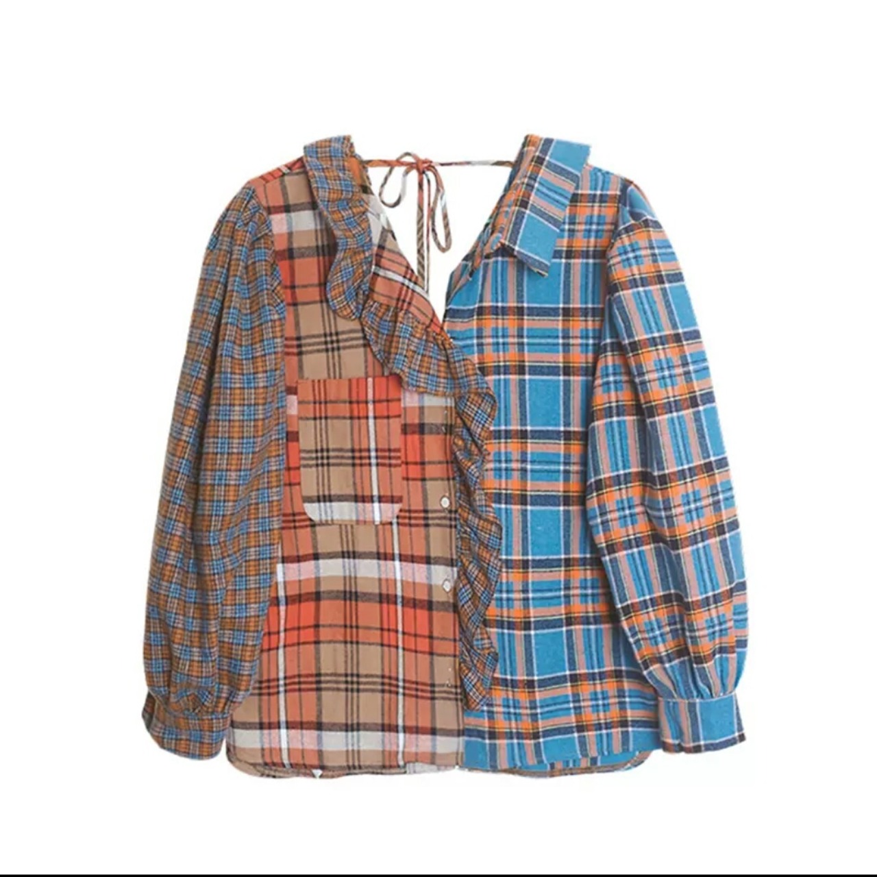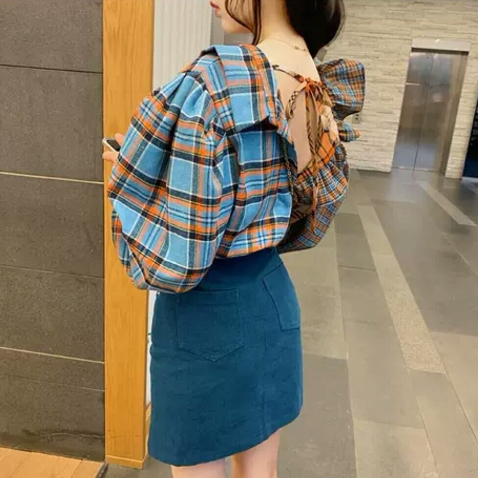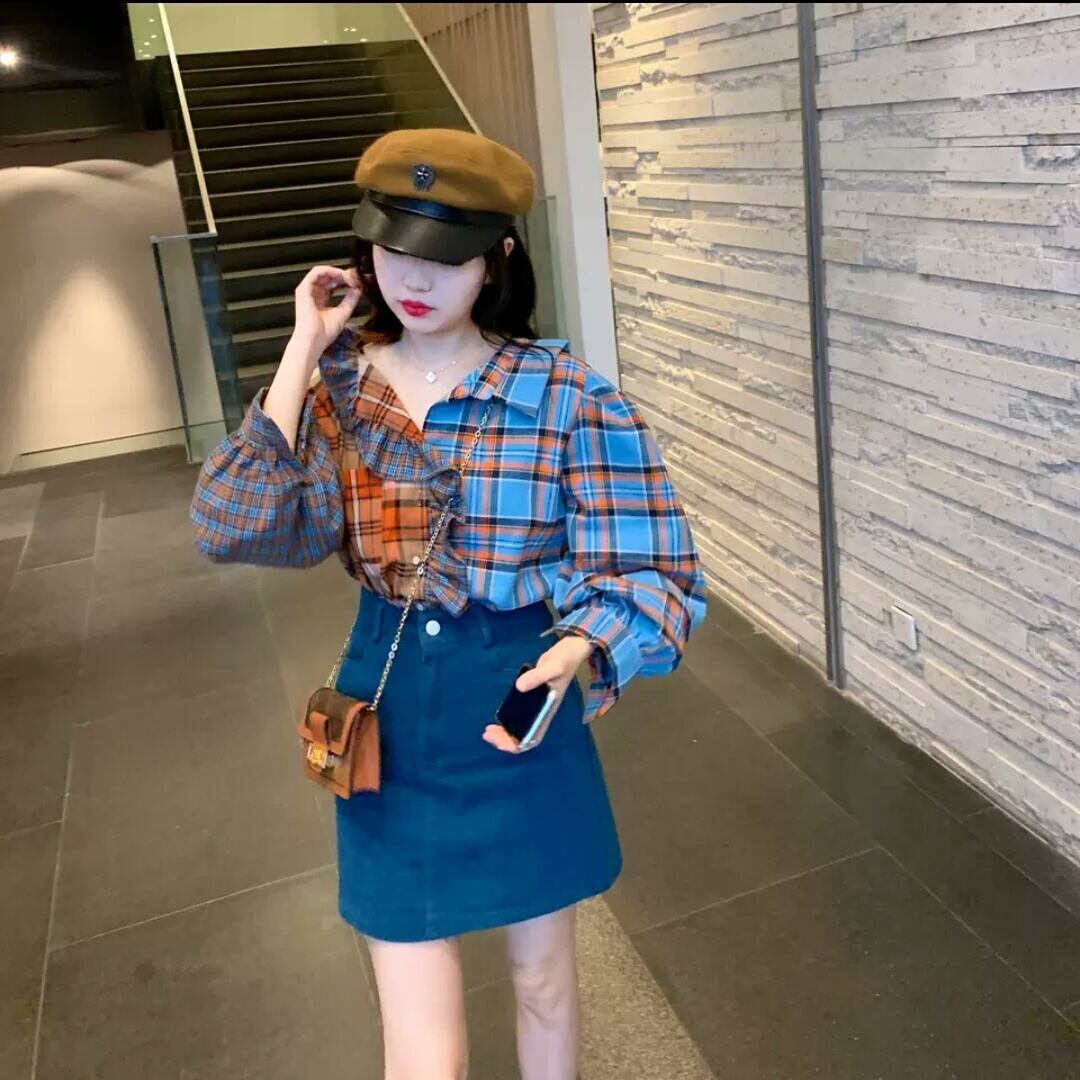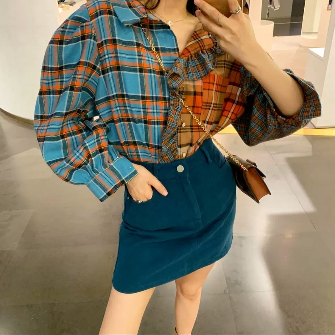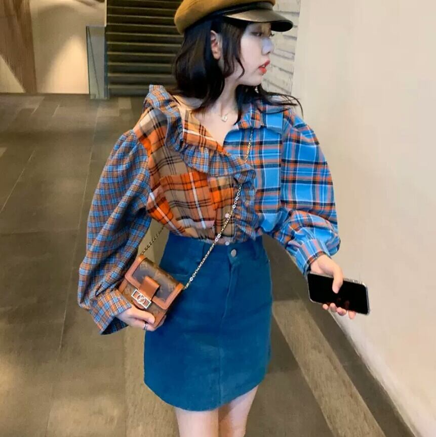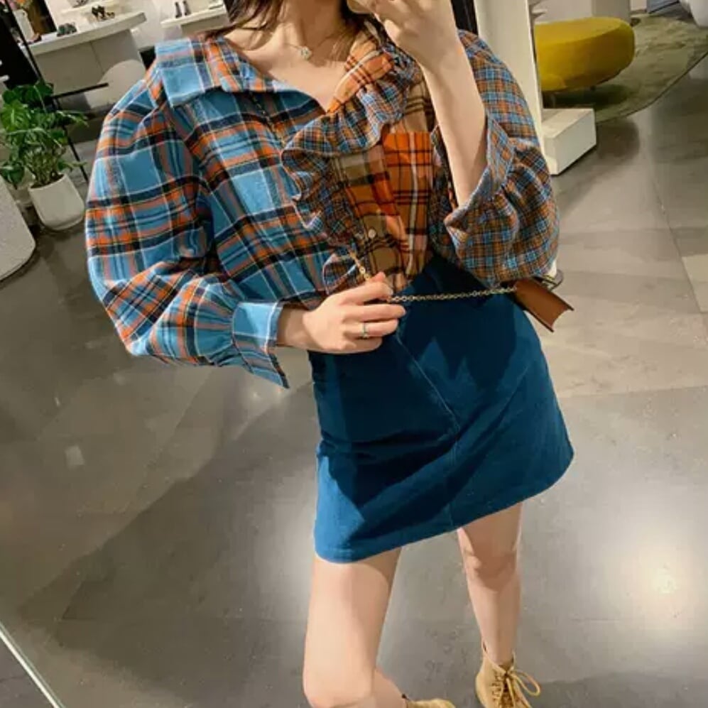 レトロ チェック柄 シャツ 個性的 フリル 長袖 トップス 大人 可愛い キレイめ カジュアル お出かけ お買い物 デート 女子会 春 夏 秋 通学 学生 通勤 韓国ファッション