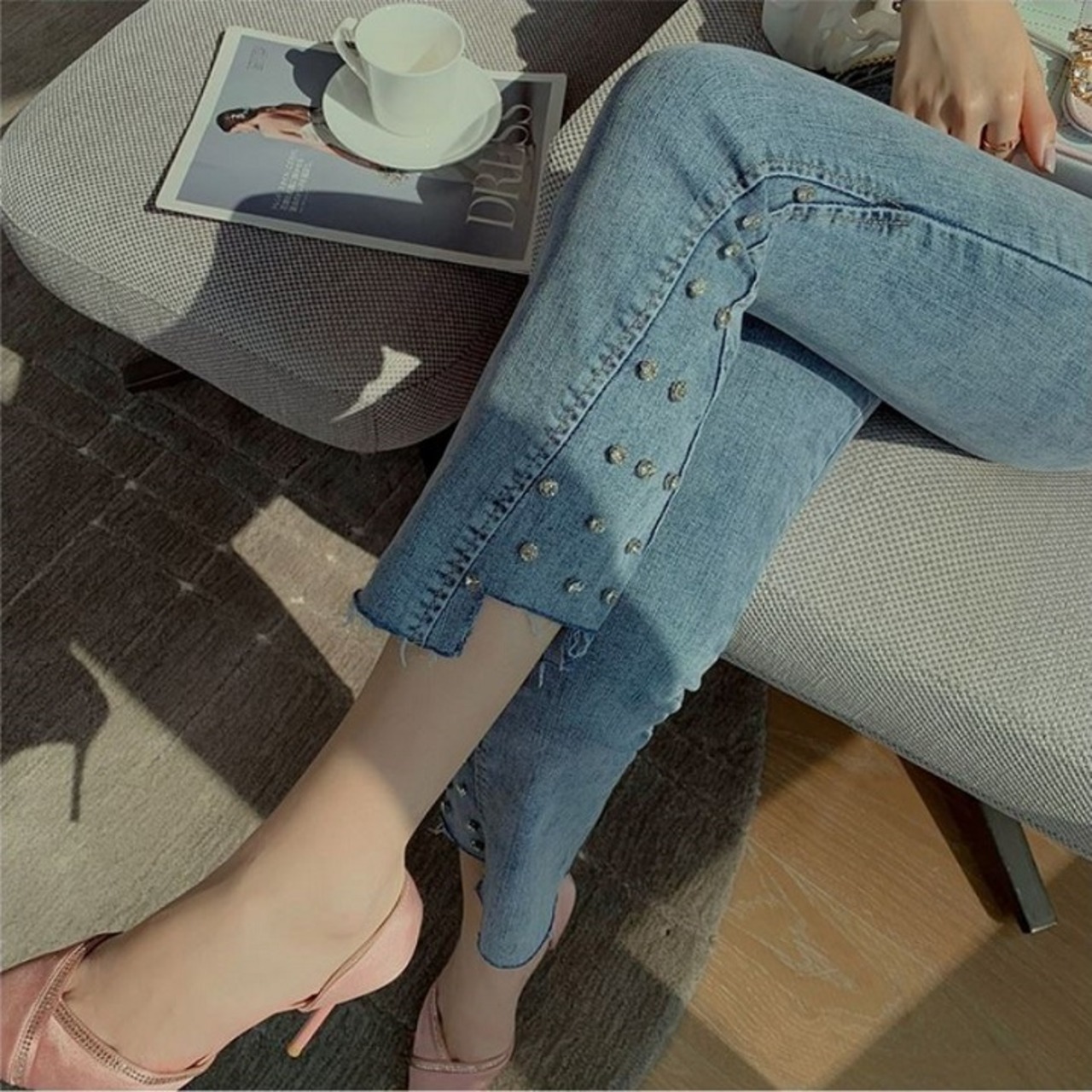 9分丈のデニムスキニーパンツ。