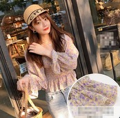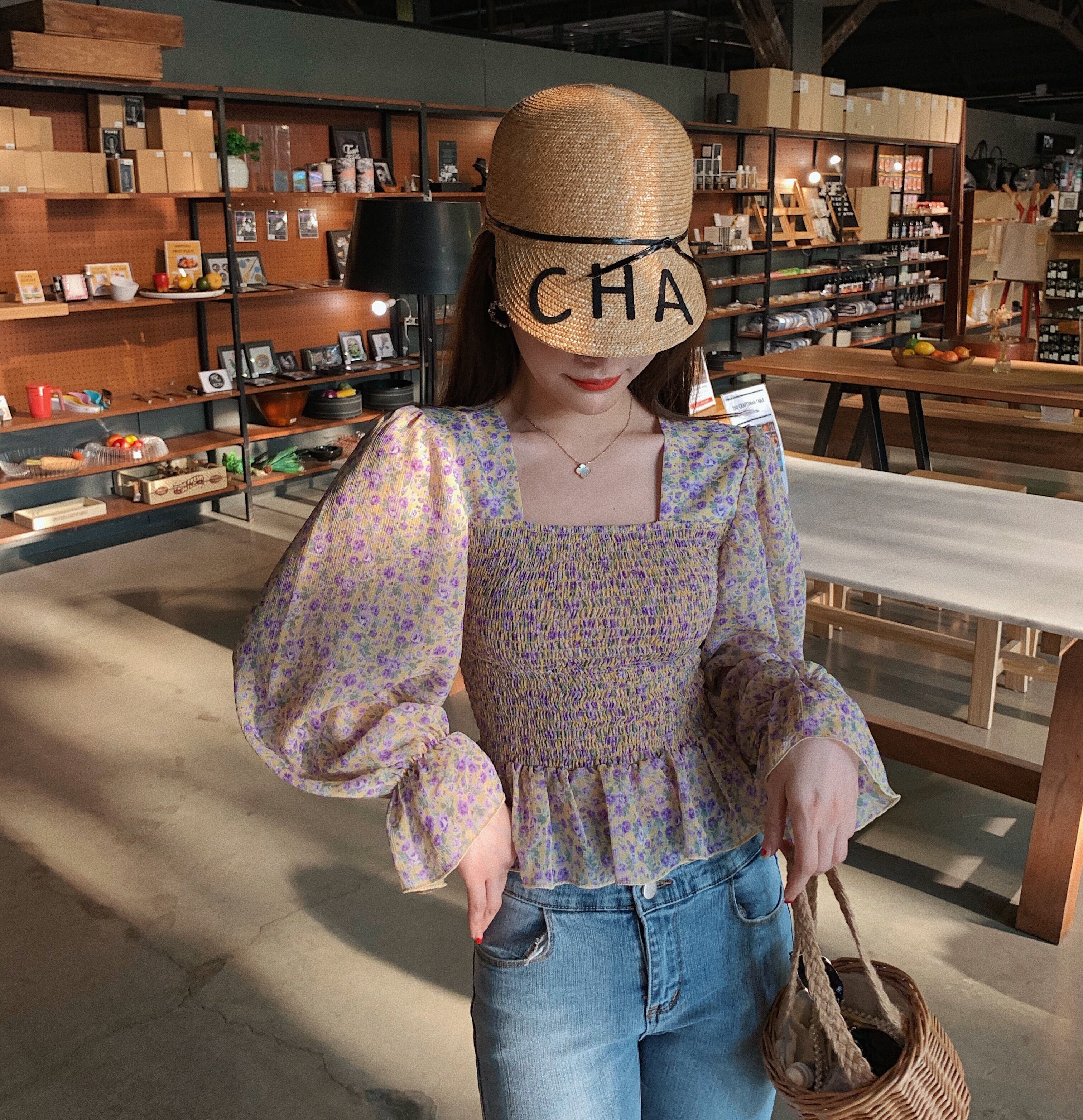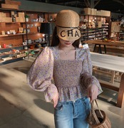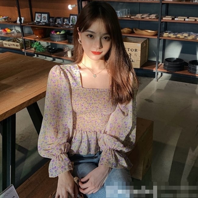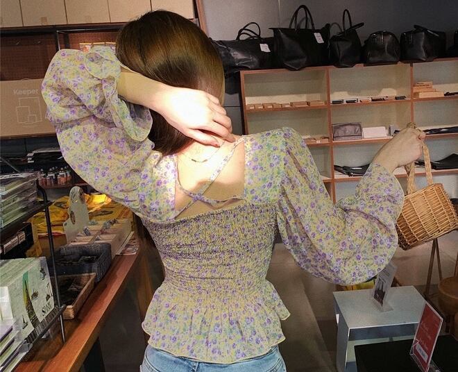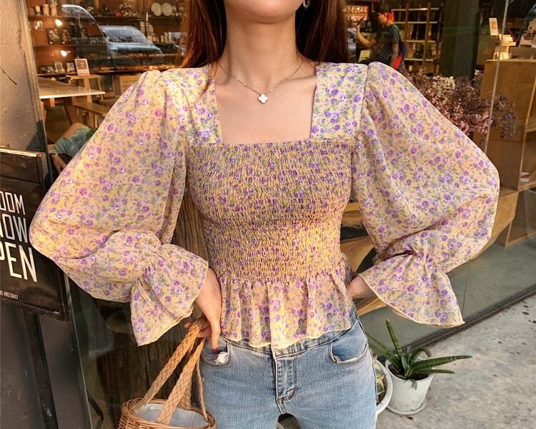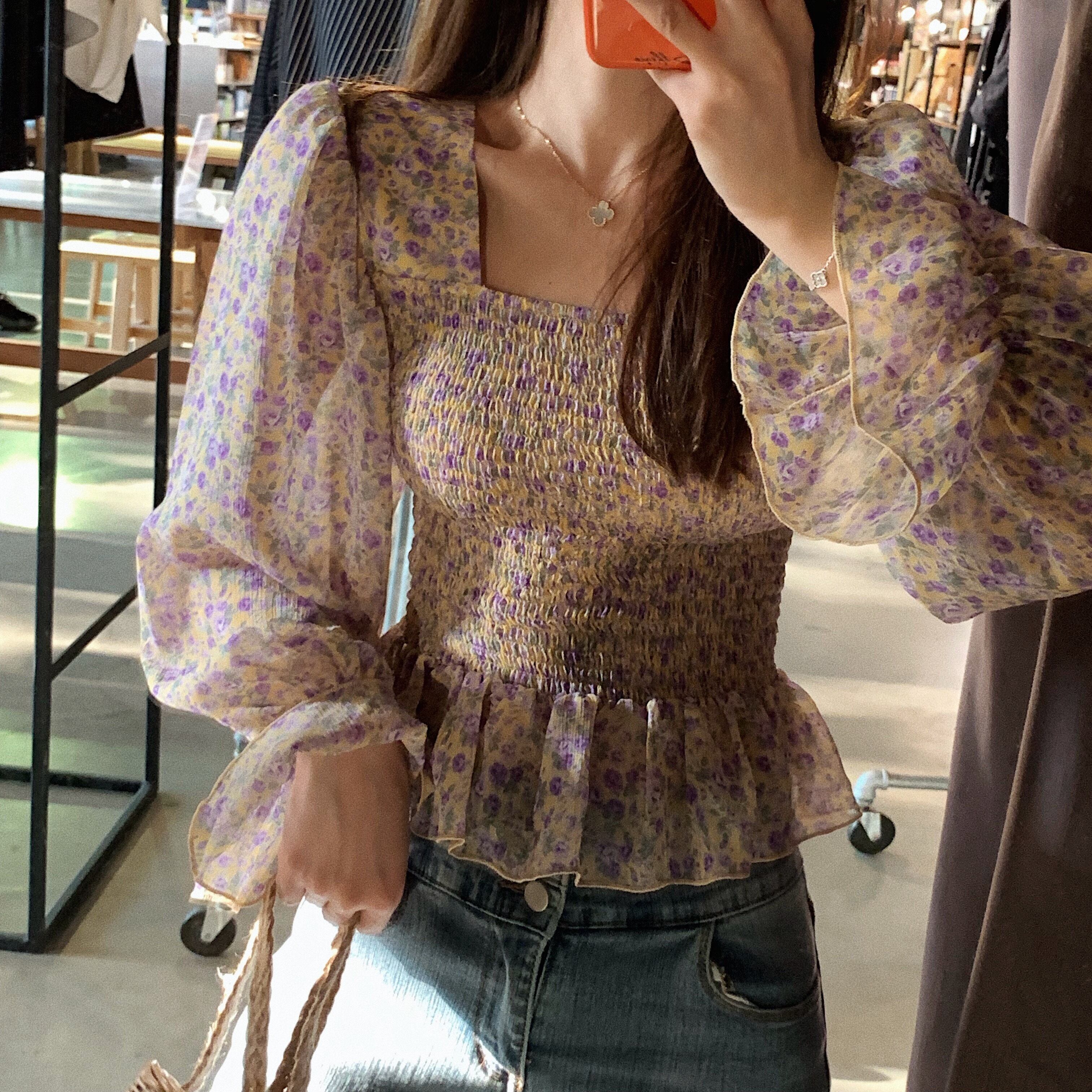 トップス ブラウス ペプラム バックシャン フリル トランペットスリーブ フレアスリーブ 長袖 花柄 スクエアネック シフォン スリム 可愛い ガーリー カジュアル きれいめ デート リゾート レトロ 春 夏