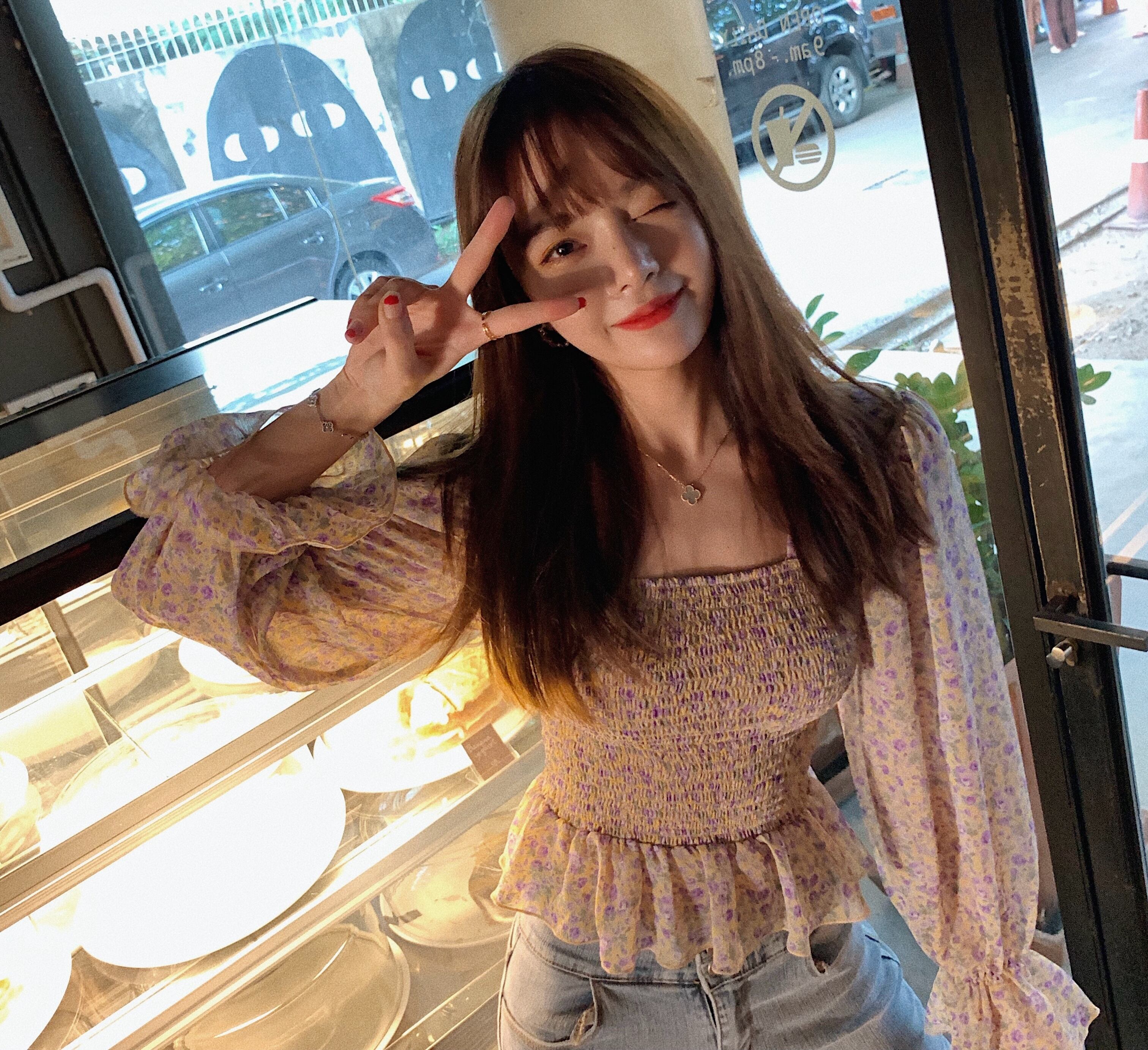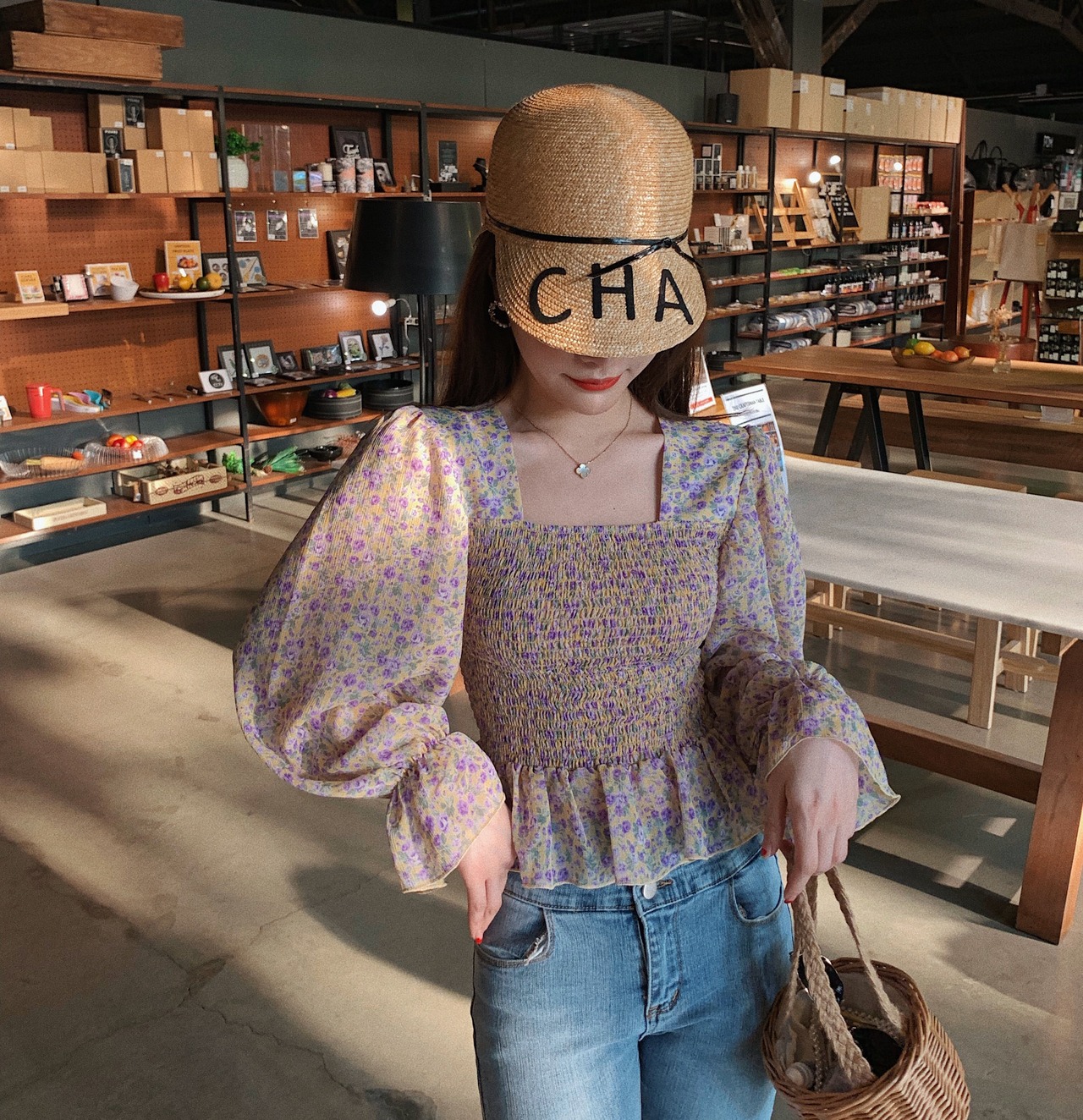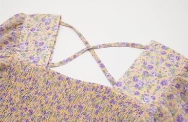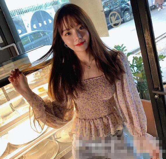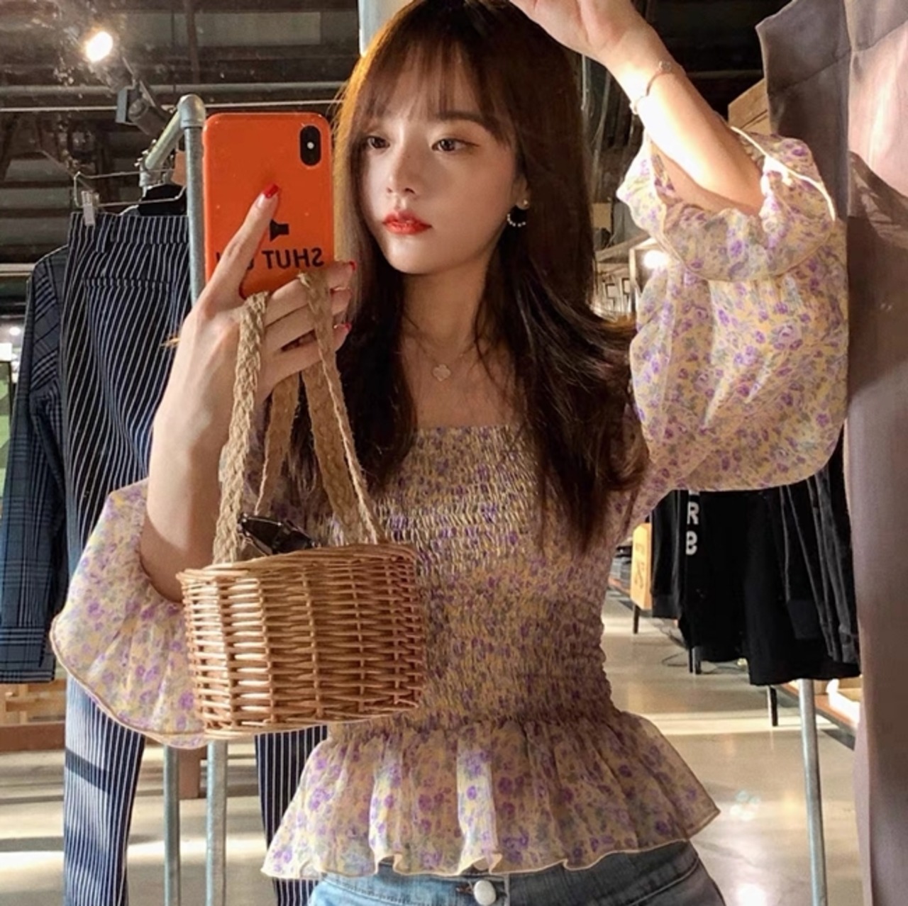トップス ブラウス ペプラム バックシャン フリル トランペットスリーブ フレアスリーブ 長袖 花柄 スクエアネック シフォン スリム 可愛い ガーリー カジュアル きれいめ デート リゾート レトロ 春 夏