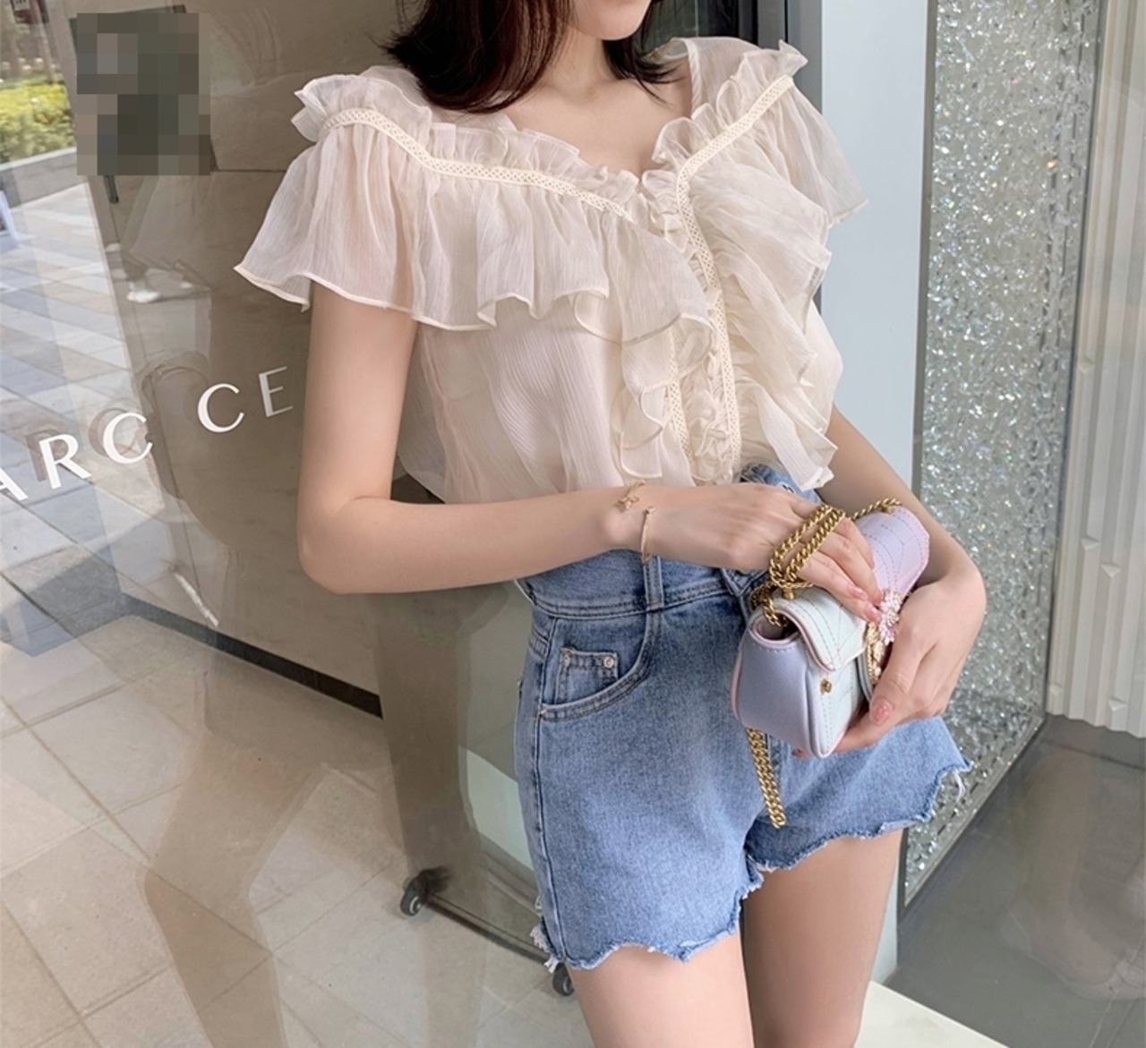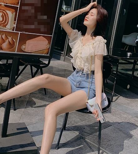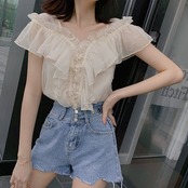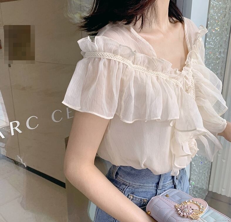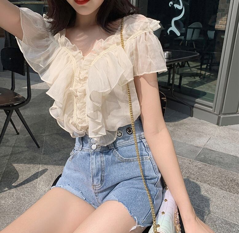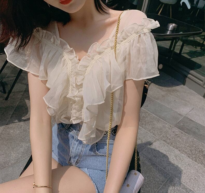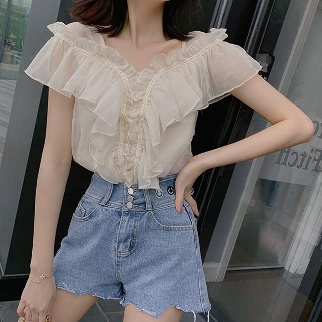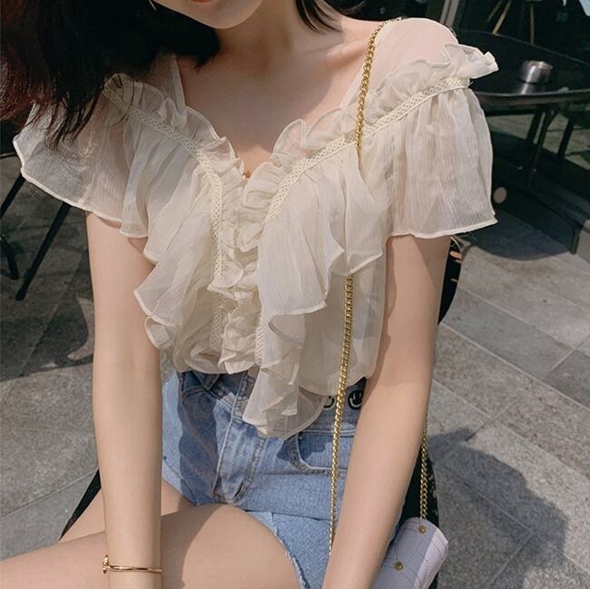 フリル トップス ブラウス シフォン Vネック ガーリー 可愛い 上品 カジュアル きれいめ ゆったり デート リゾート 半袖 フレアスリーブ 韓国ファッション 春 夏