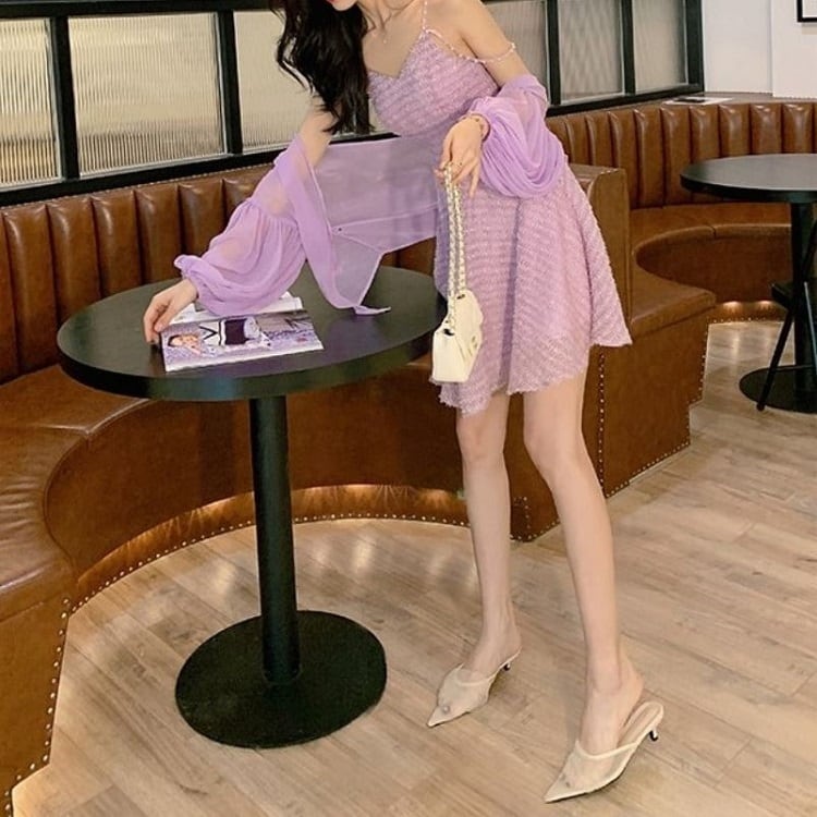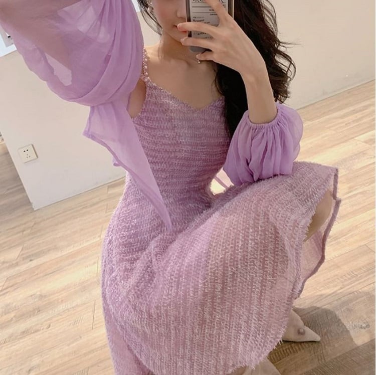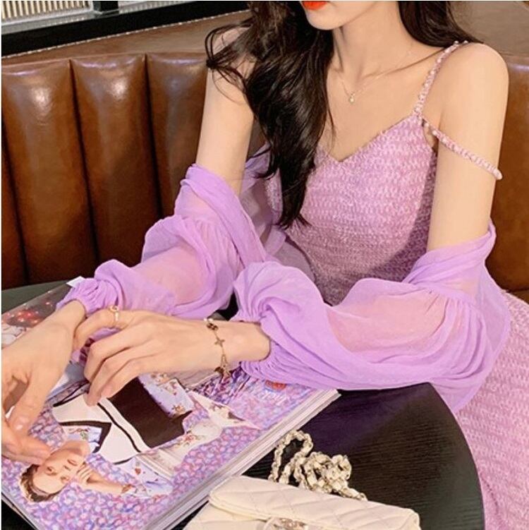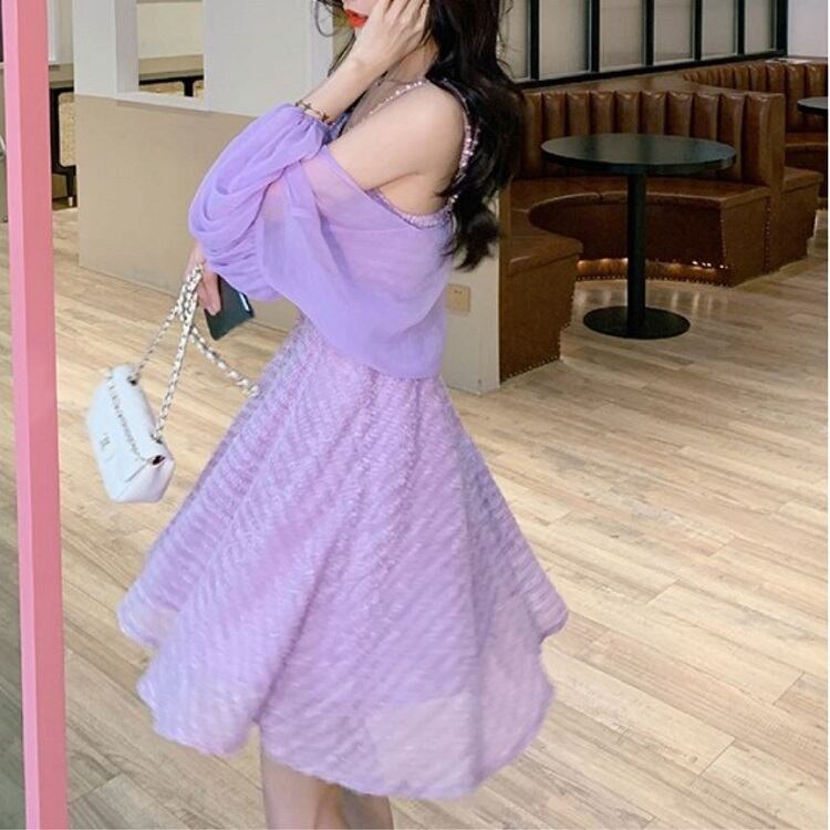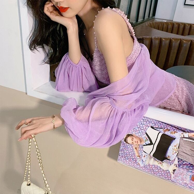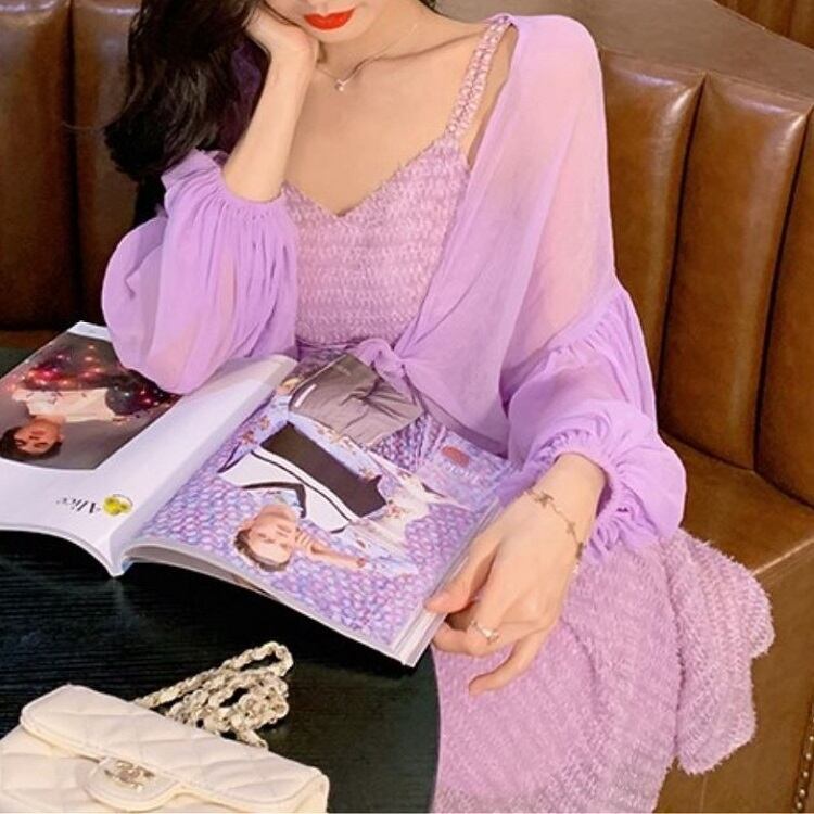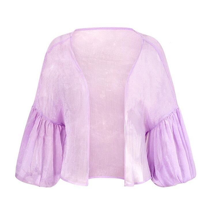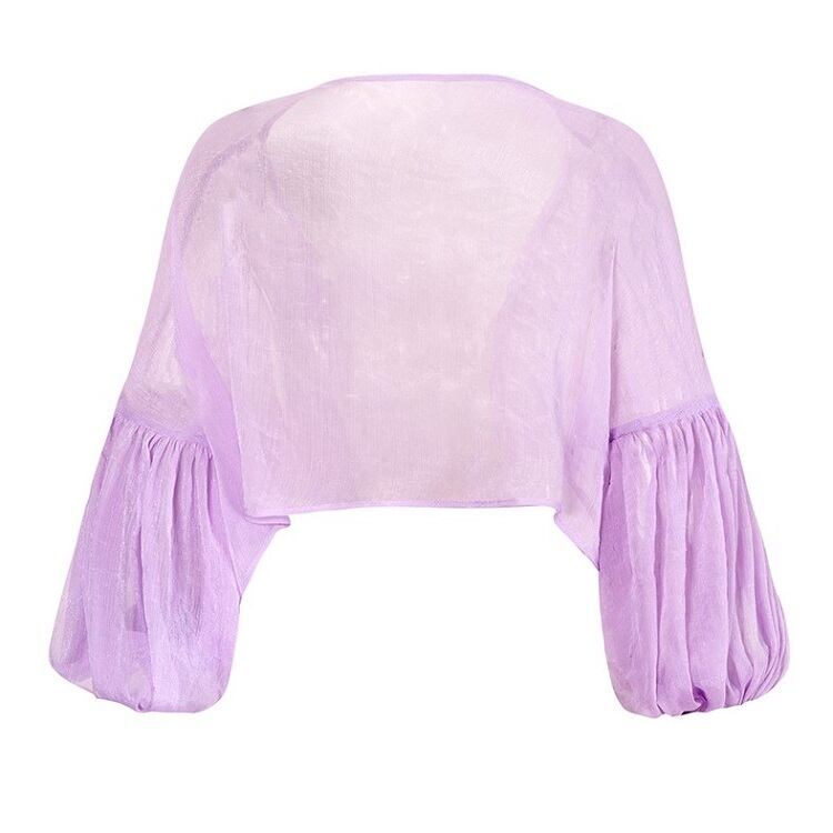 ショートジャケット ボレロ カーディガン シフォン 長袖 ドロップショルダー 透け感 エレガント お出かけ リゾート パープル