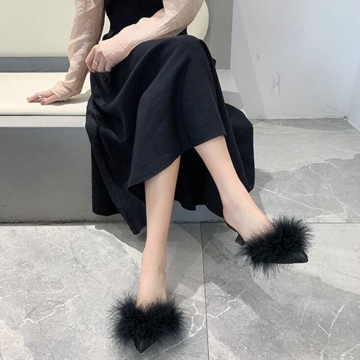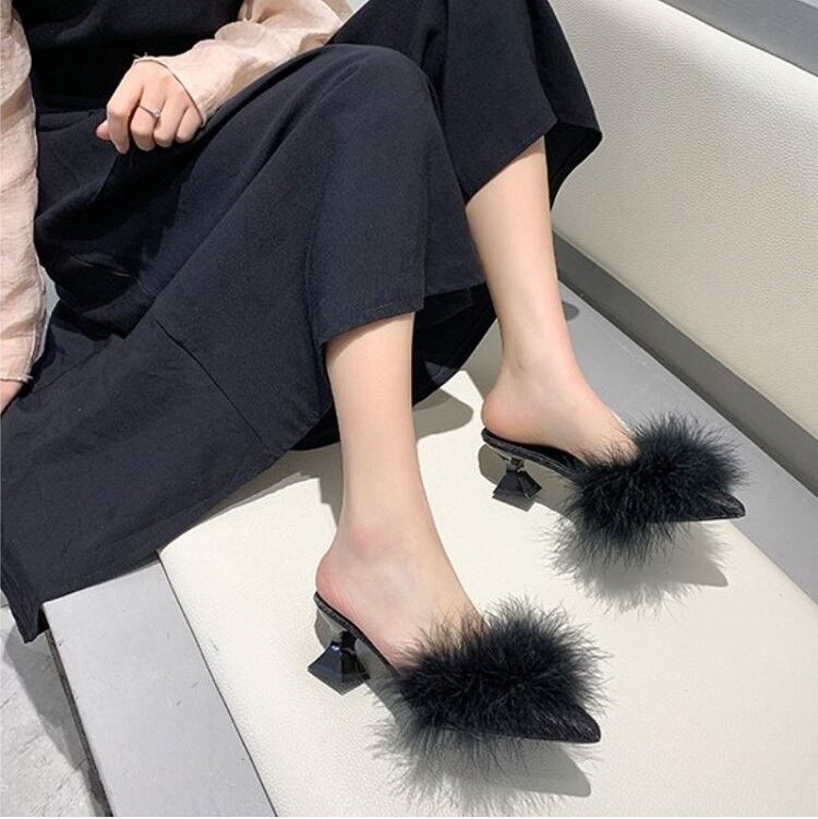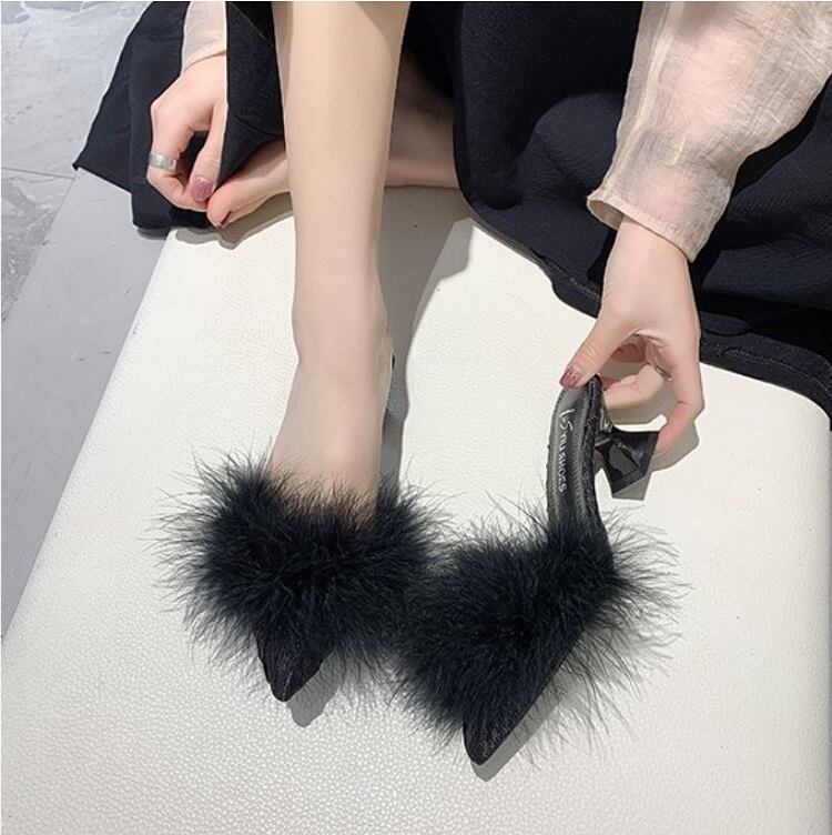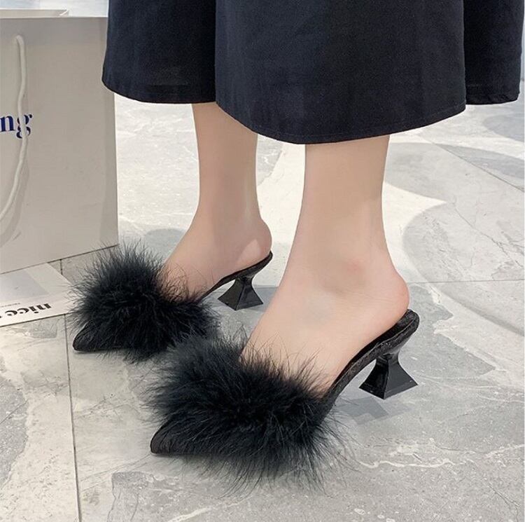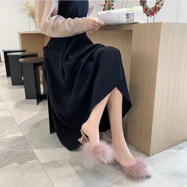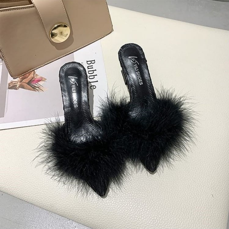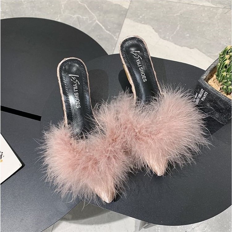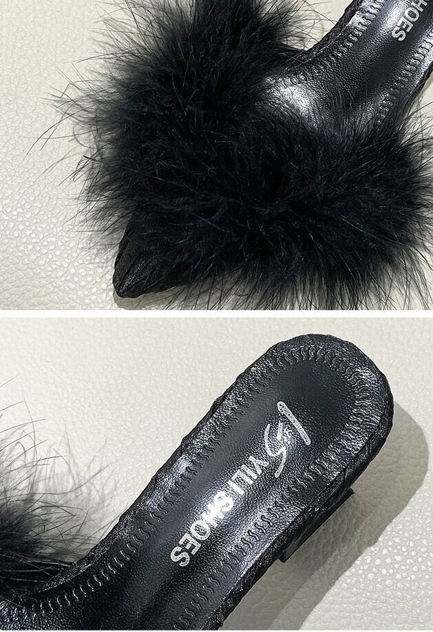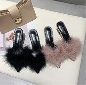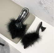 さらに太ヒールが安定感UPなポインテッドトゥのファーサンダル