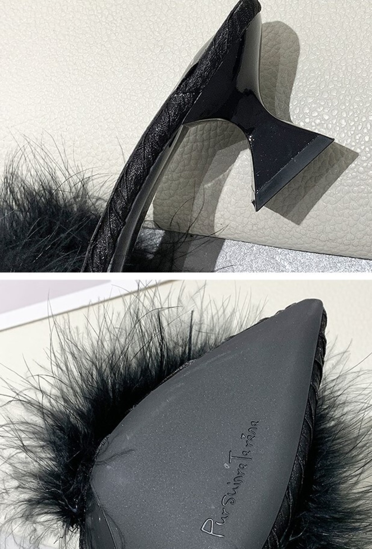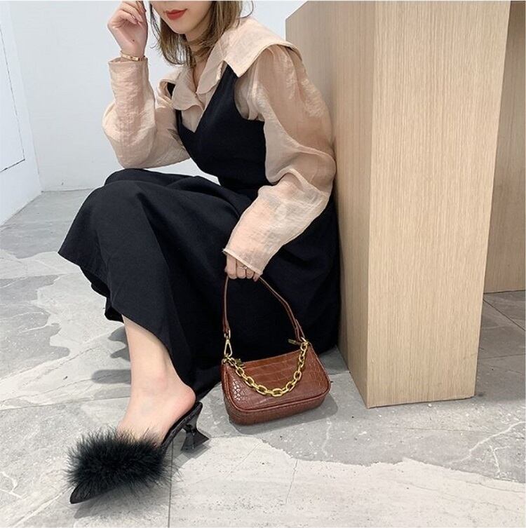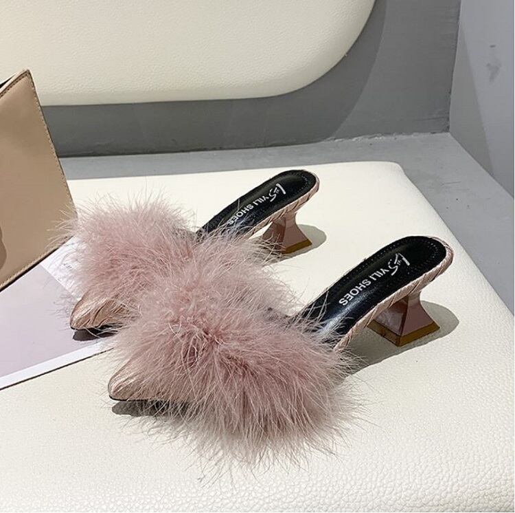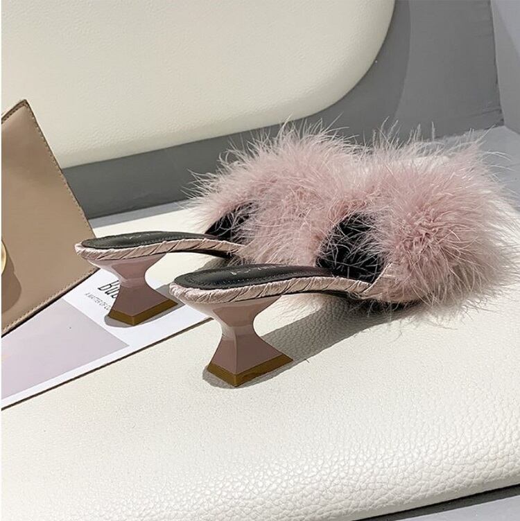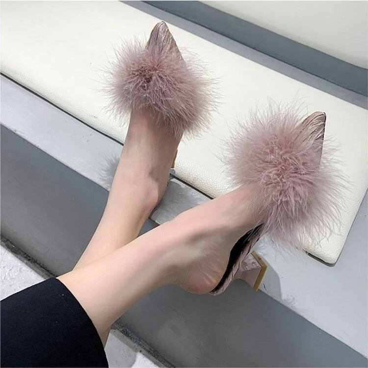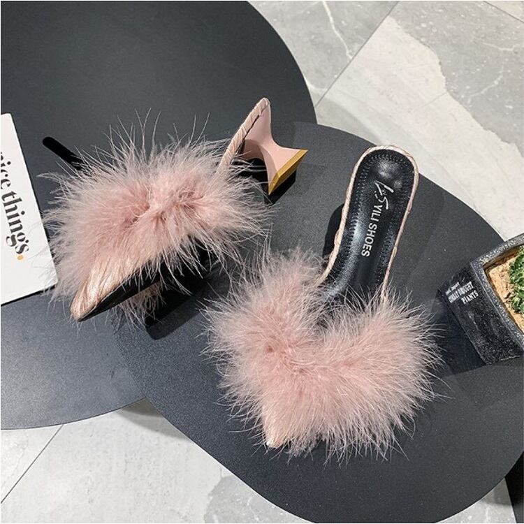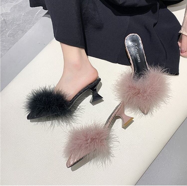 さらに太ヒールが安定感UPなポインテッドトゥのファーサンダル