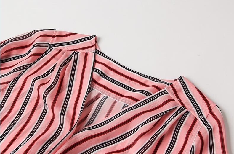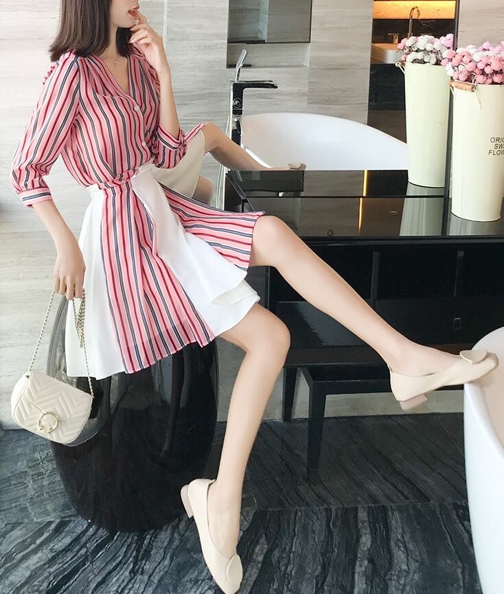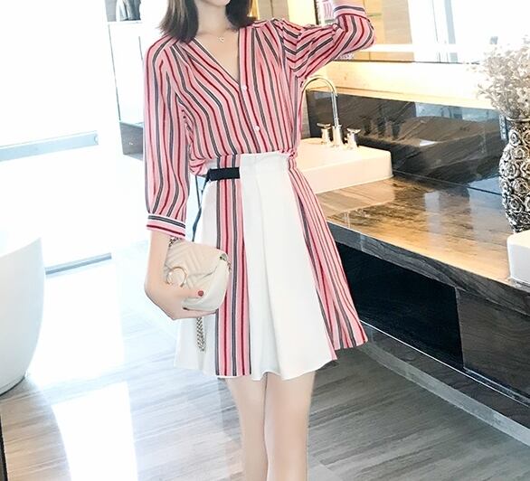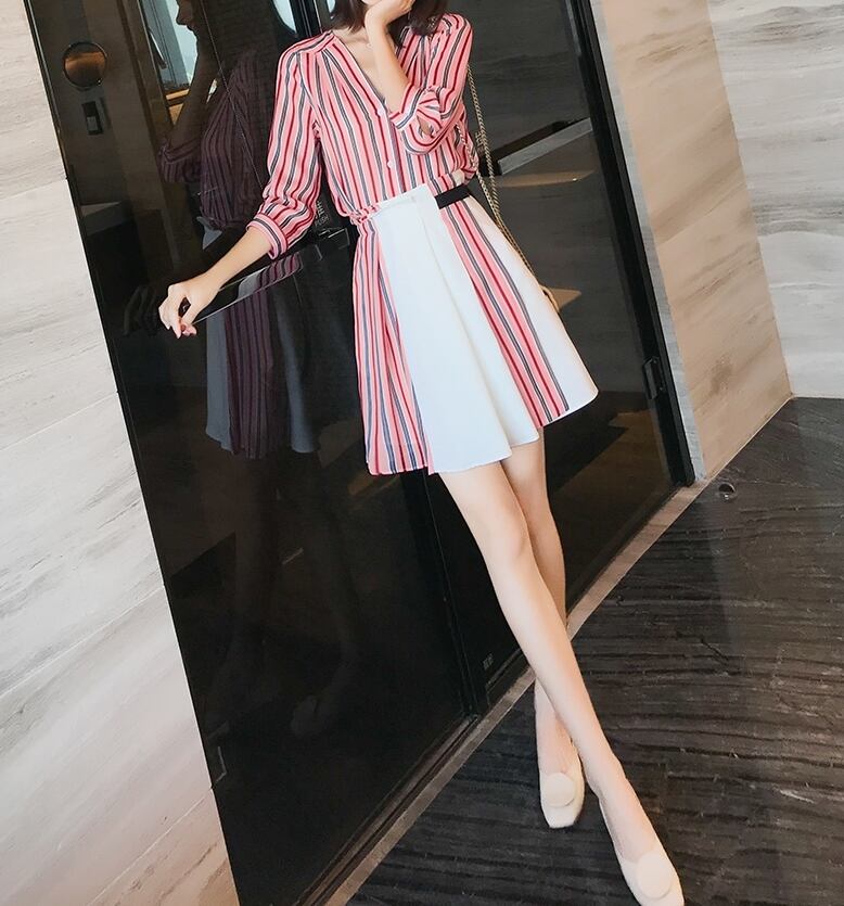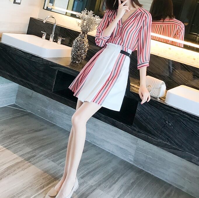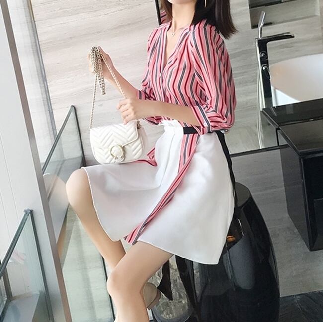 セットアップ ツーピース シャツ スカート ストライプ ベルト ミニ丈 ハイウエスト Vネック フロントボタン 7分ほど カジュアル きれいめ 大人 春 夏