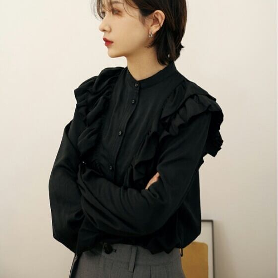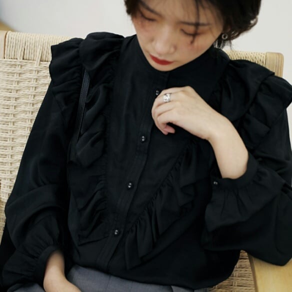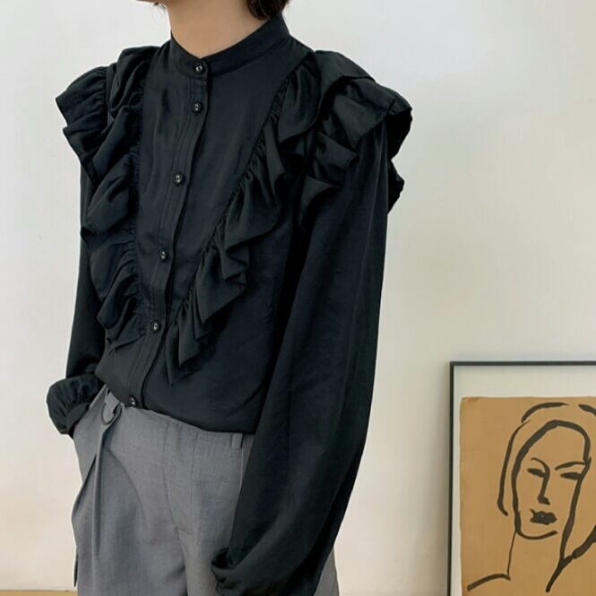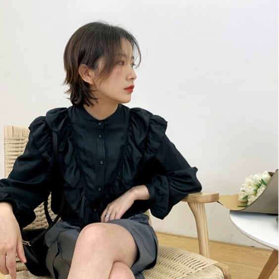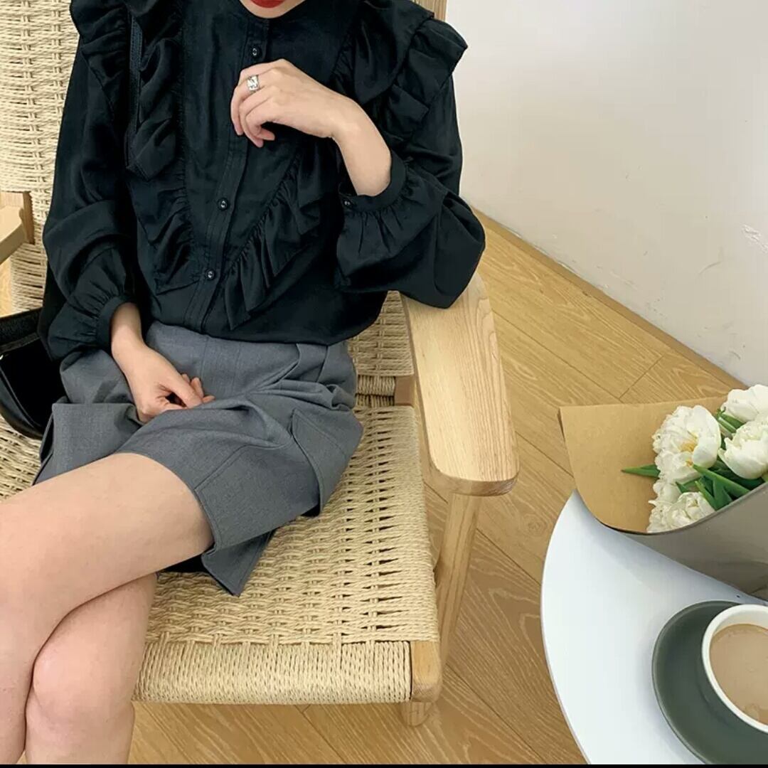 フリル 長袖 シャツ ブラウス レトロ 無地 シンプル 大人 可愛い キレイめ カジュアル お出かけ お買い物 デート 女子会 春 夏 秋 通学 学生 通勤 韓国ファッション