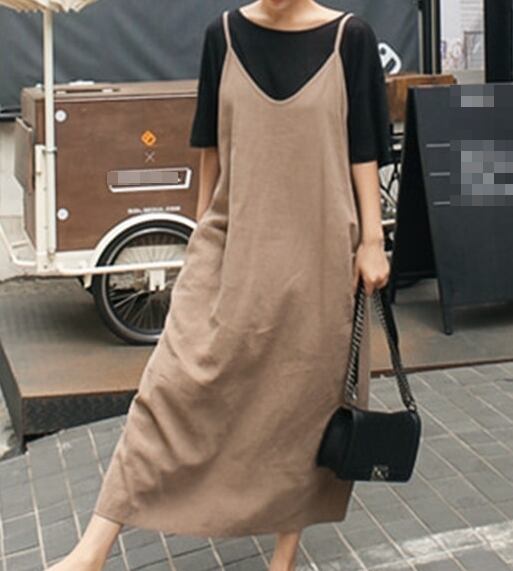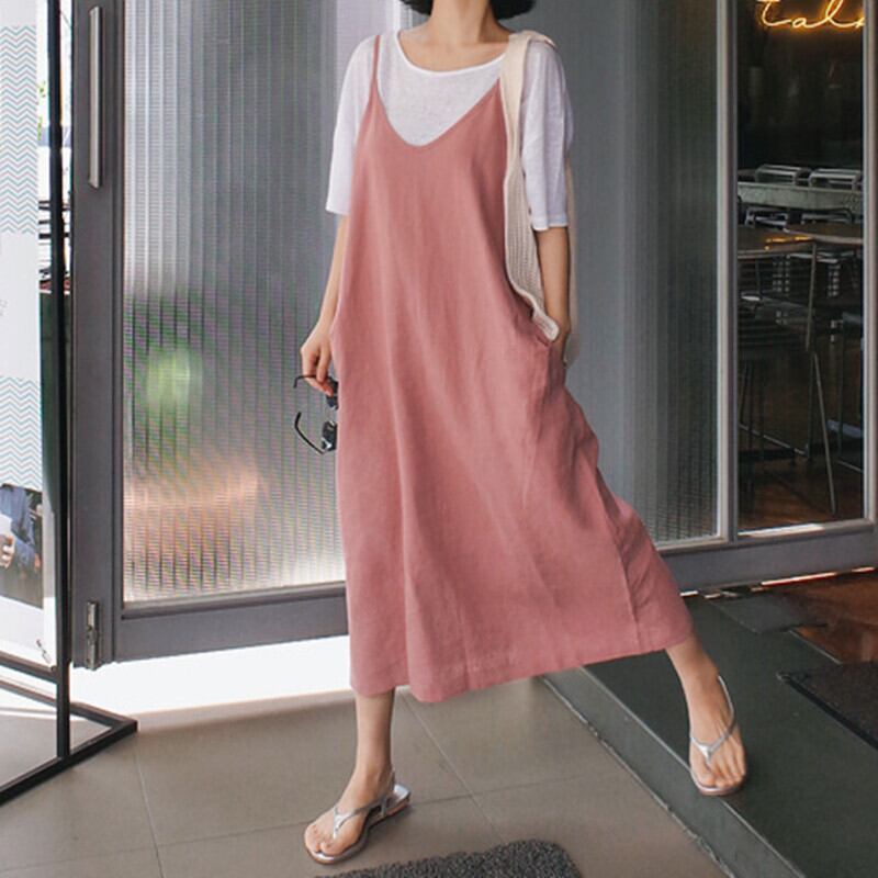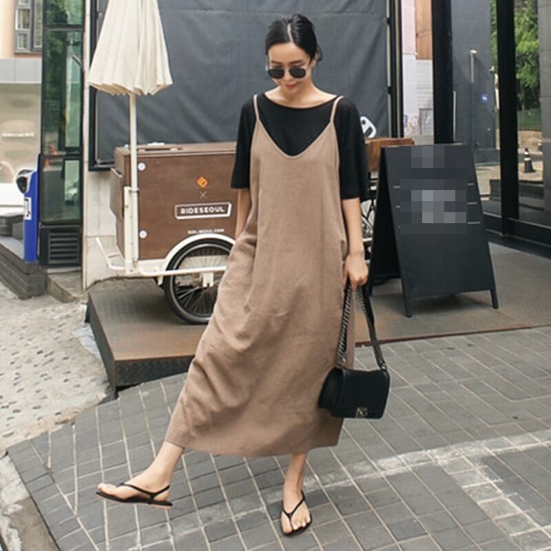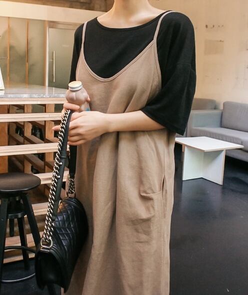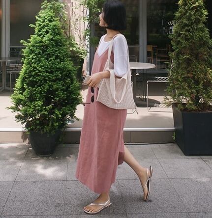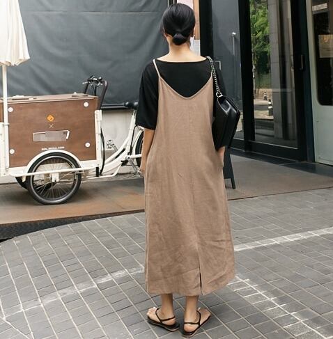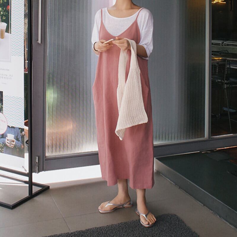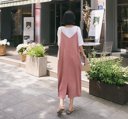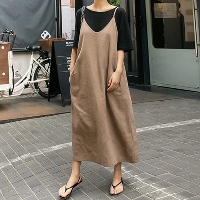 全2色 ワンピース キャミソールワンピ ロング丈 コットン リネン バックスリット 無地 ゆったり カジュアル シンプル デイリー 可愛い お出かけ リゾート リラックシー 韓国ファッション 春 夏