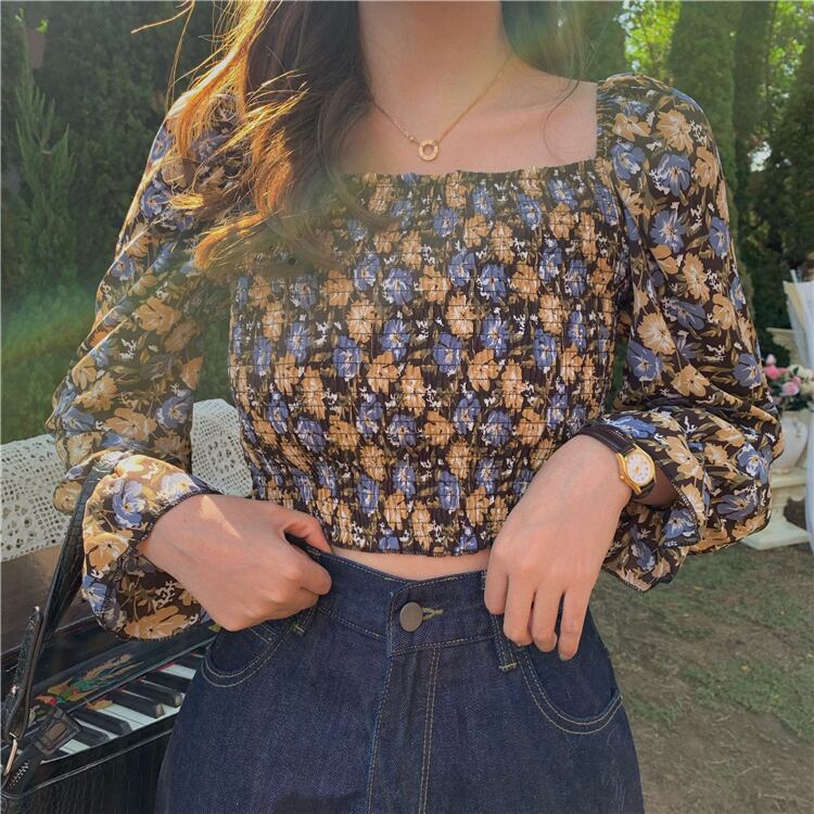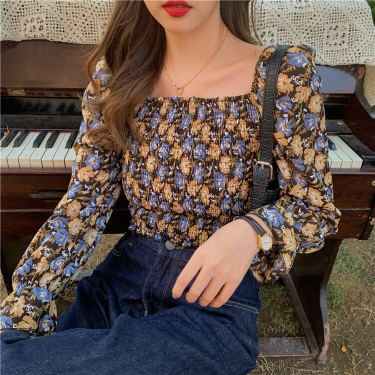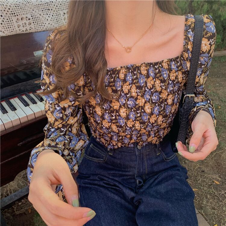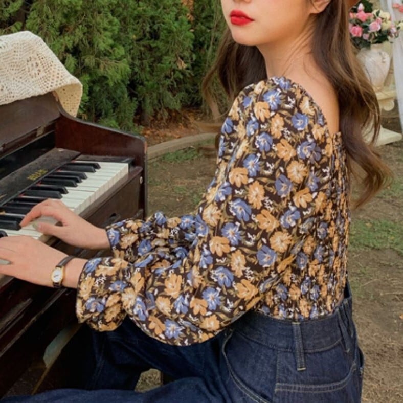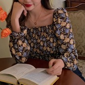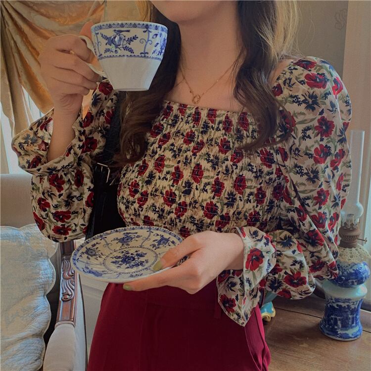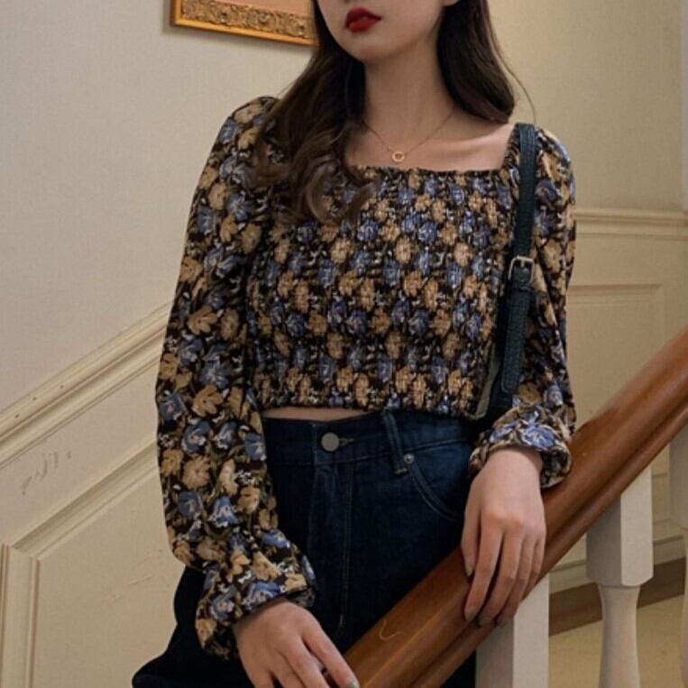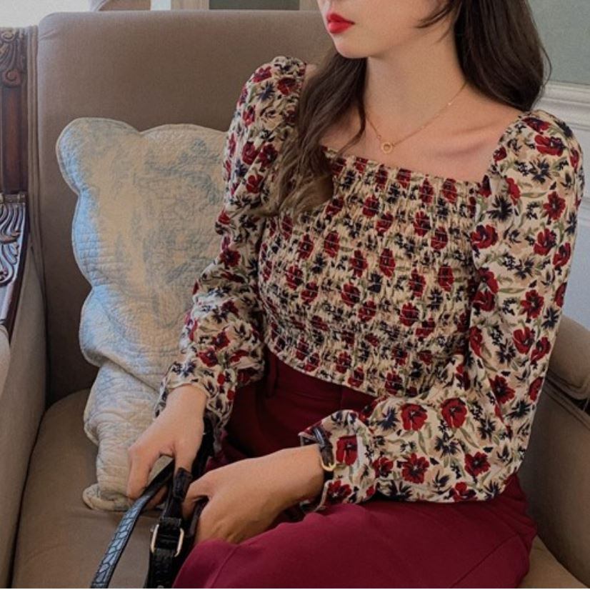 レトロな花柄がフェミニンなスクエアネックブラウス。