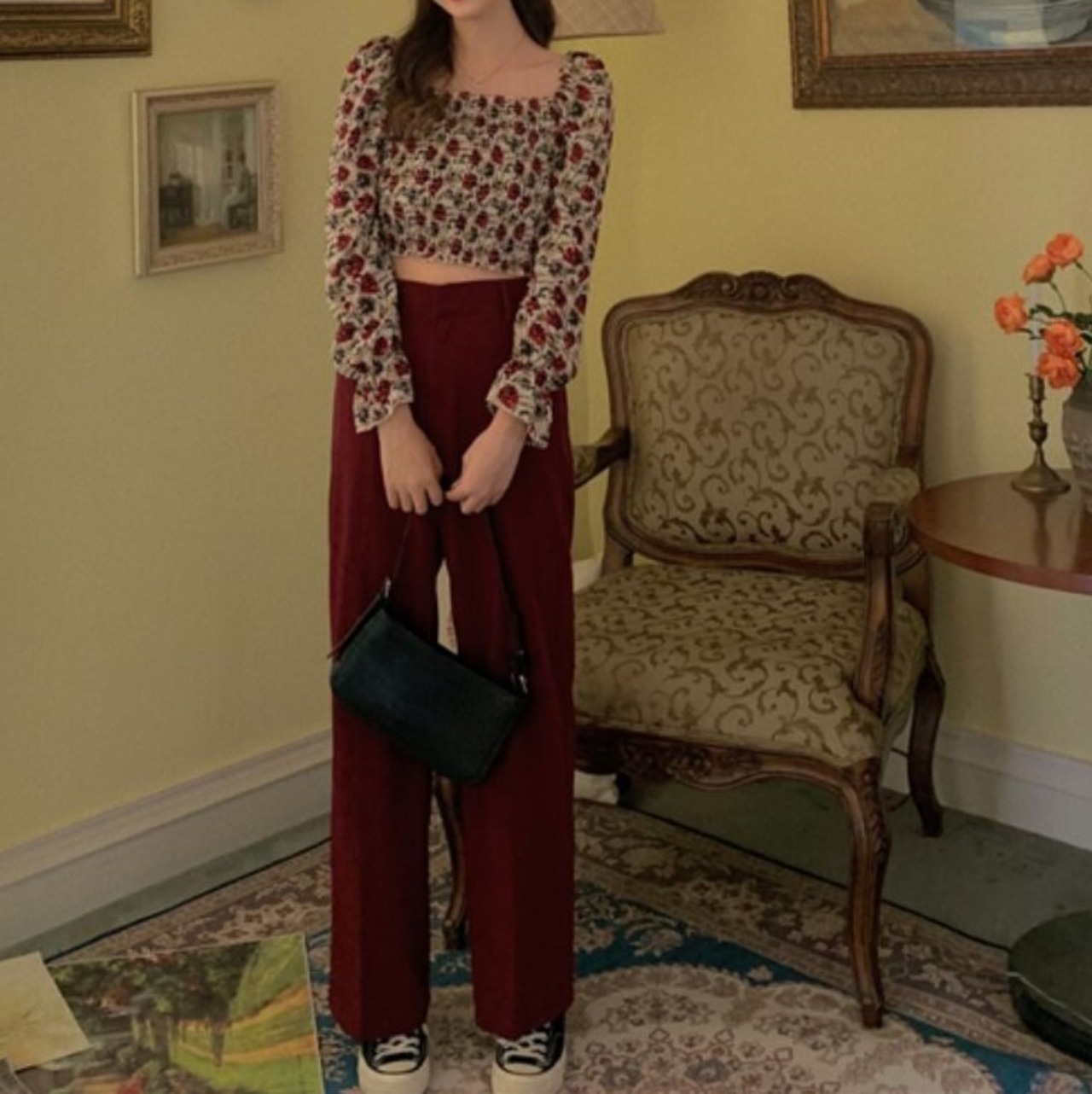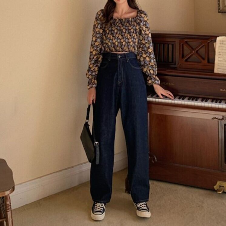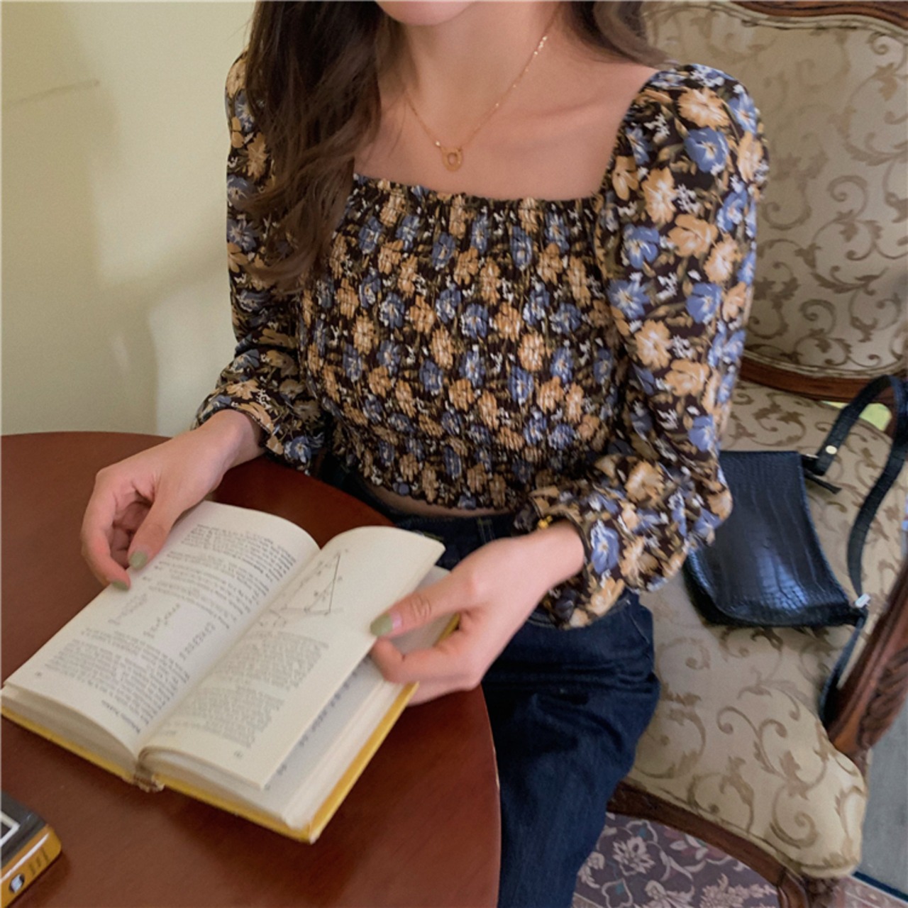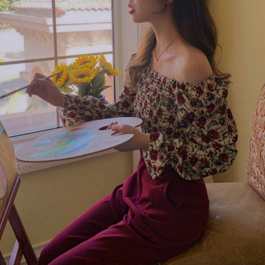 レトロな花柄がフェミニンなスクエアネックブラウス。