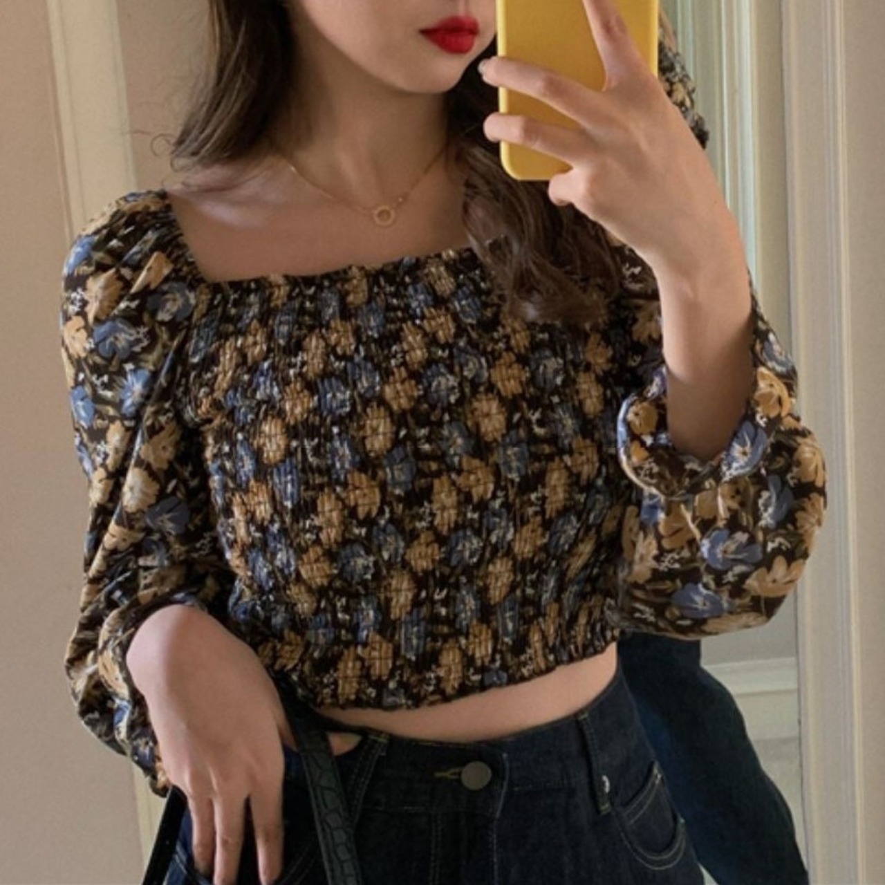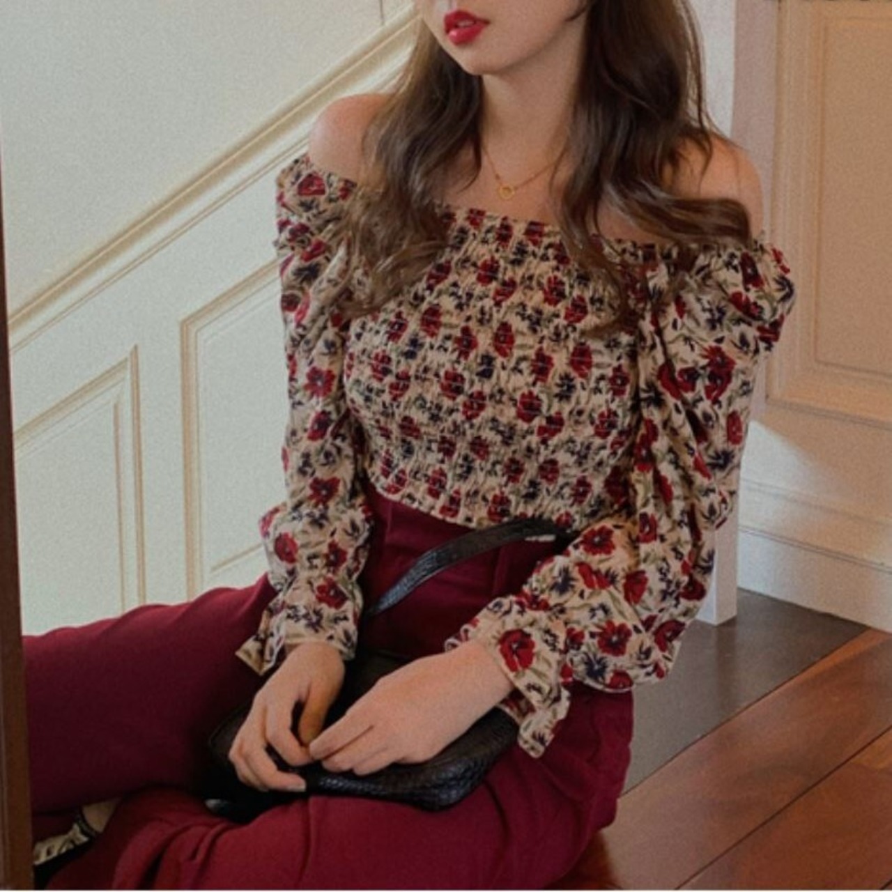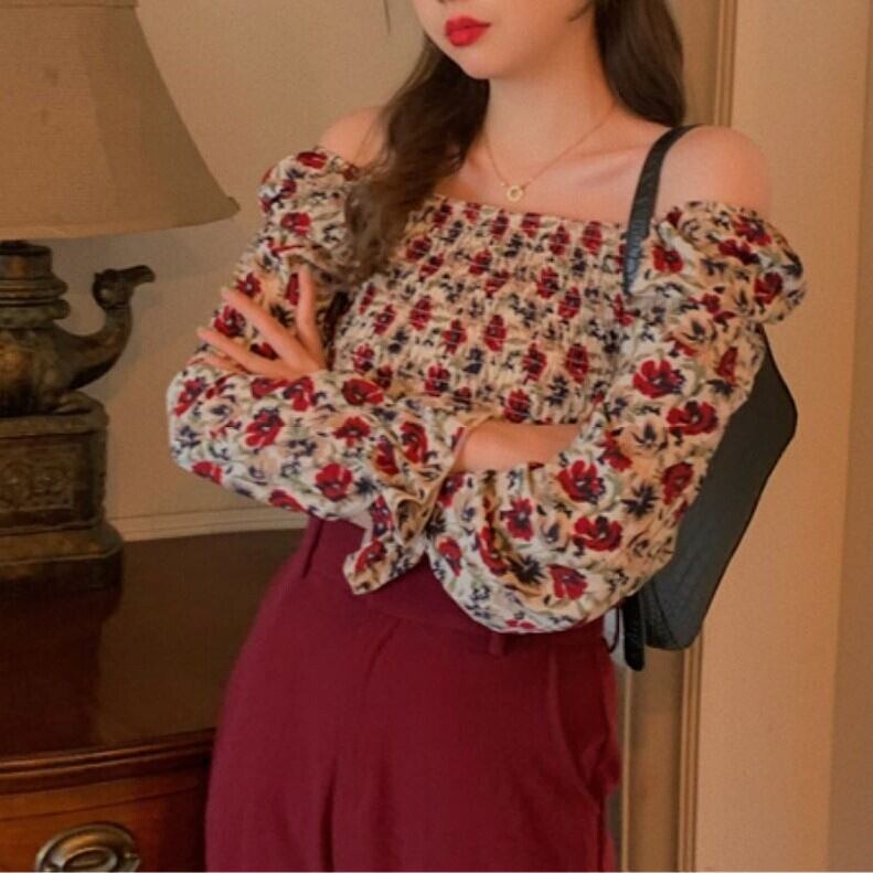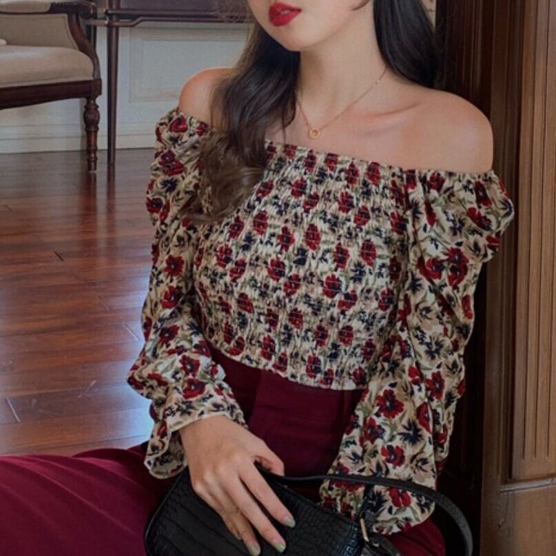 シャーリングブラウス スクエアネック オフショルダー 花柄 長袖 パフスリーブ ショート丈 カジュアル きれいめ ガーリー