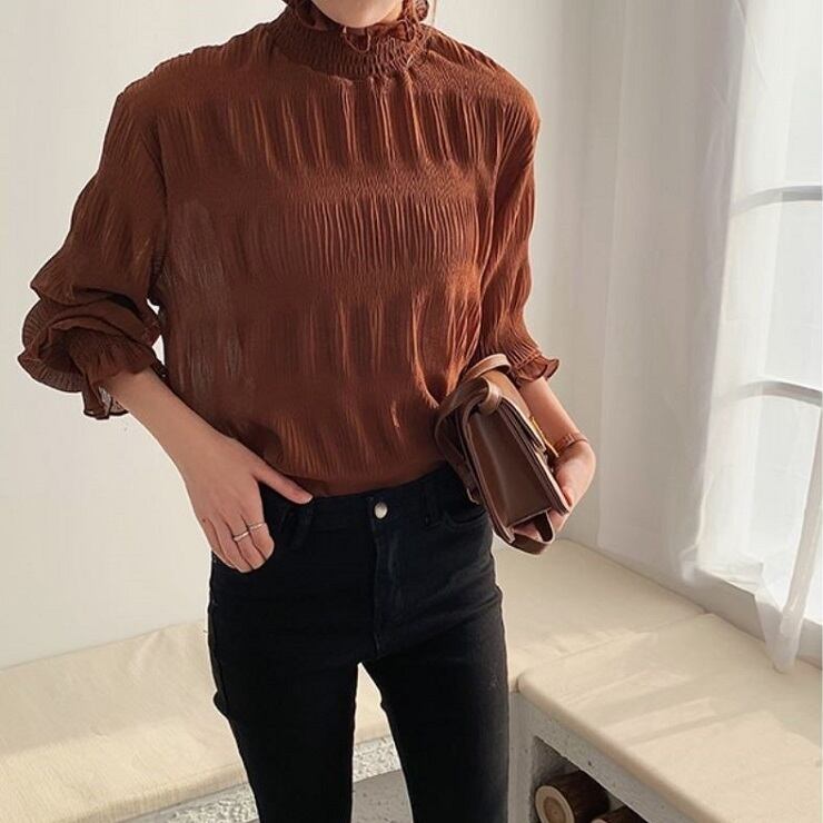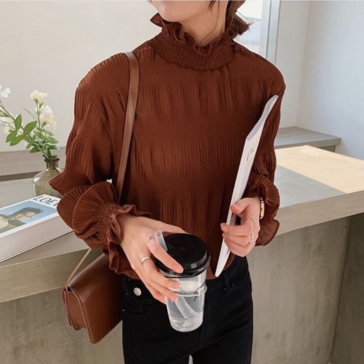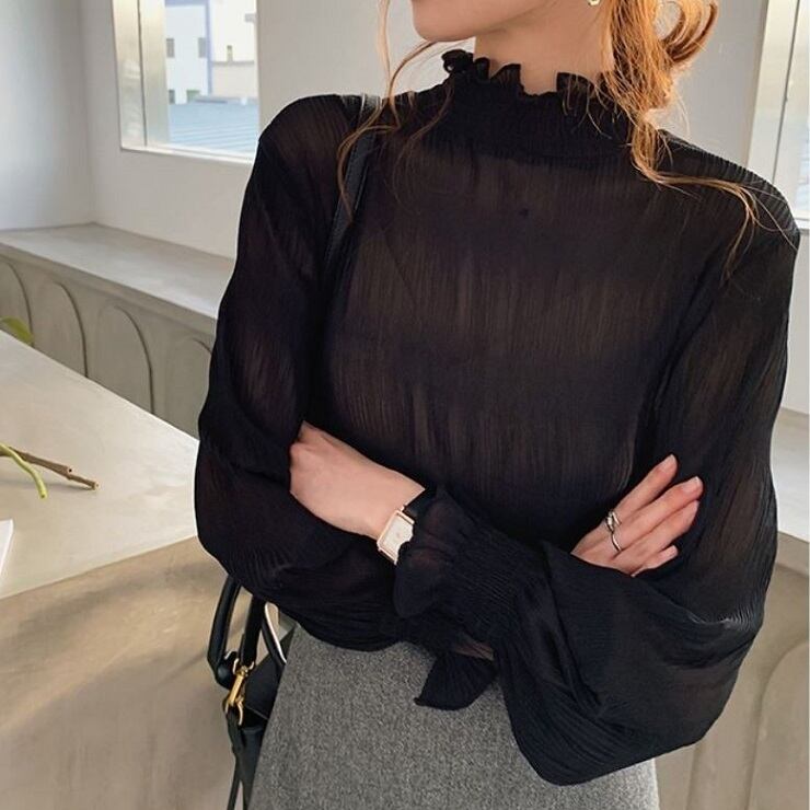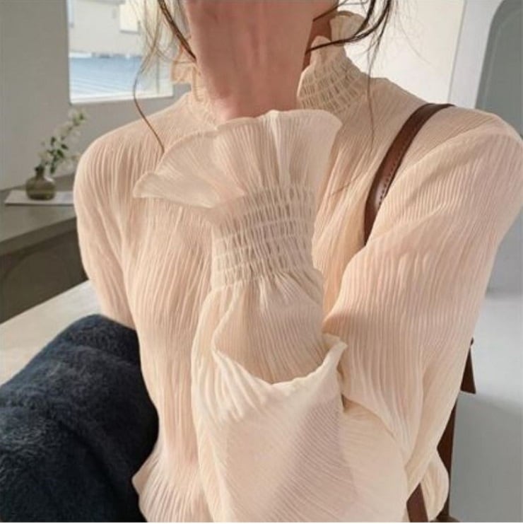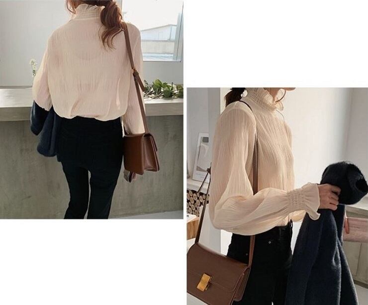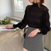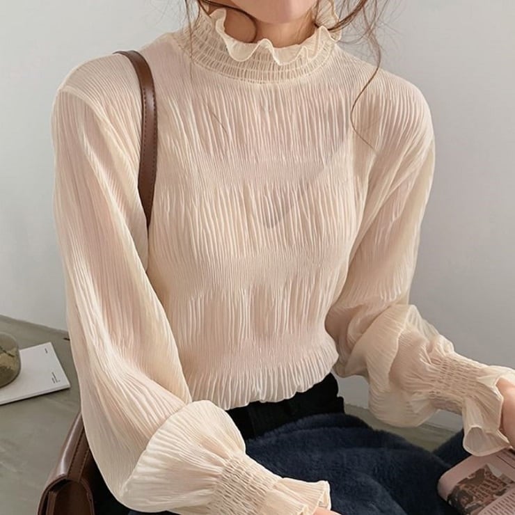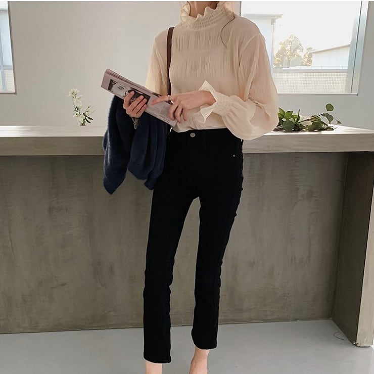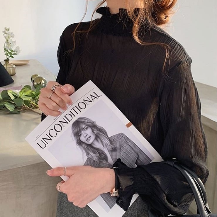 シンプルで上品な雰囲気のハイネックブラウス。