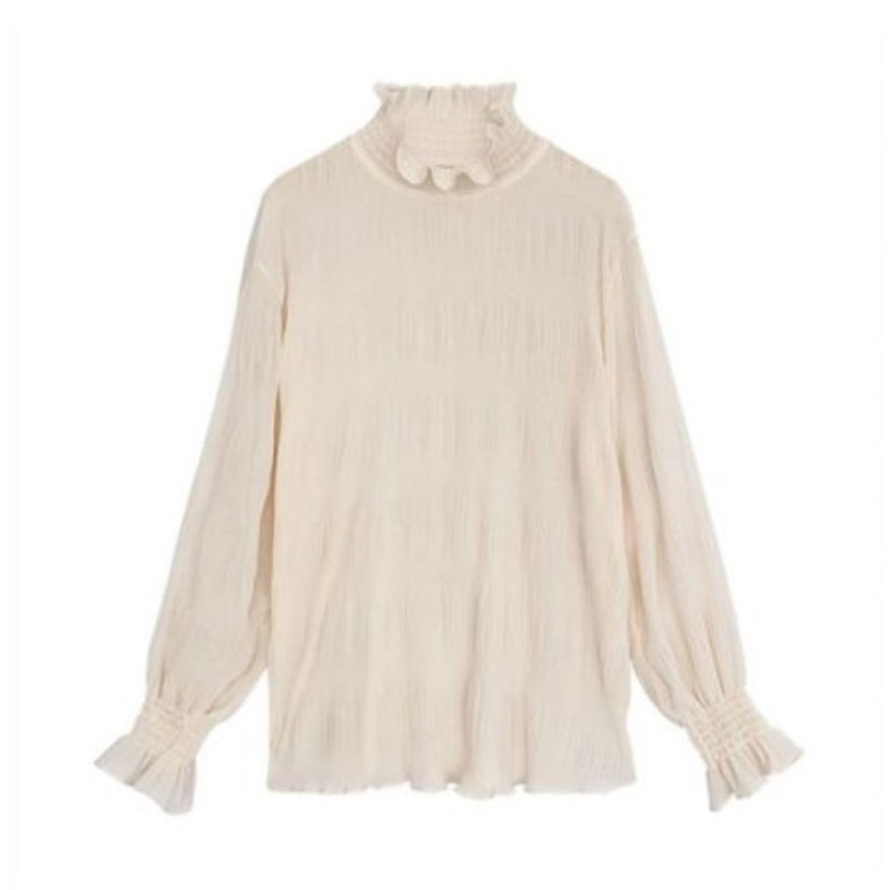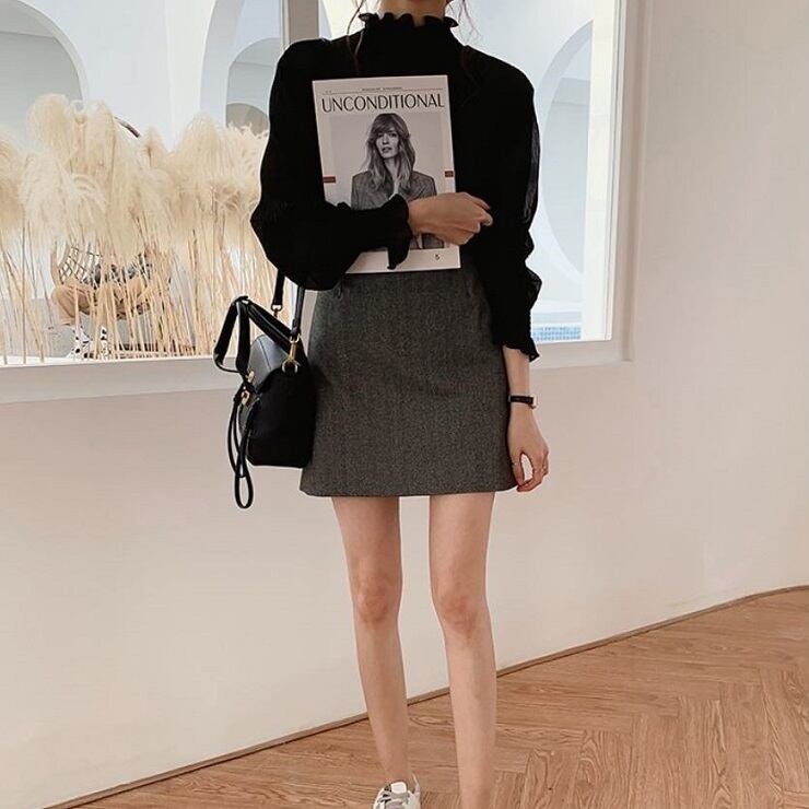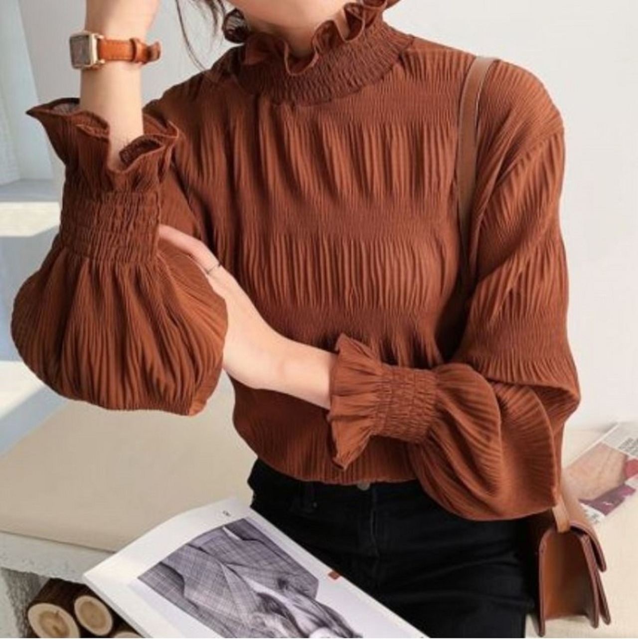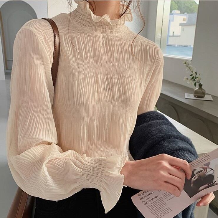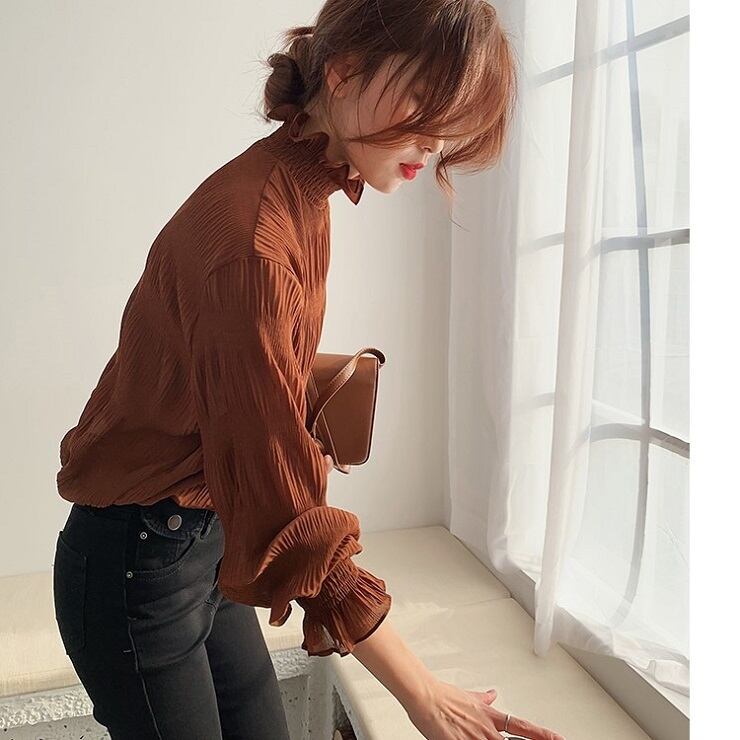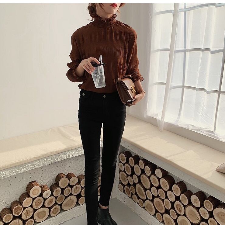 シンプルで上品な雰囲気のハイネックブラウス。