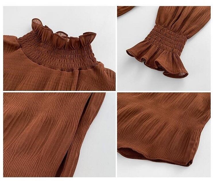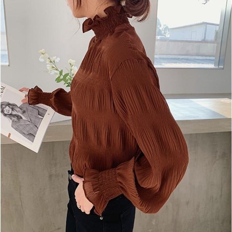 全3色 大きいサイズ シフォンブラウス シャーリング ハイネック プルオーバー 無地 フリル 長袖 パフスリーブ カジュアル きれいめ オフィス お出かけ