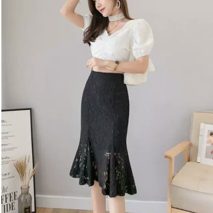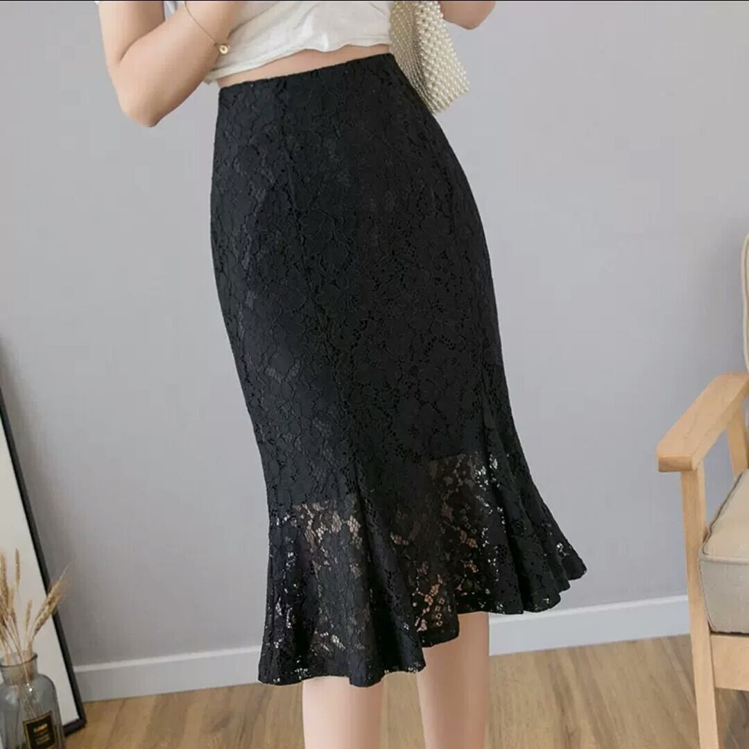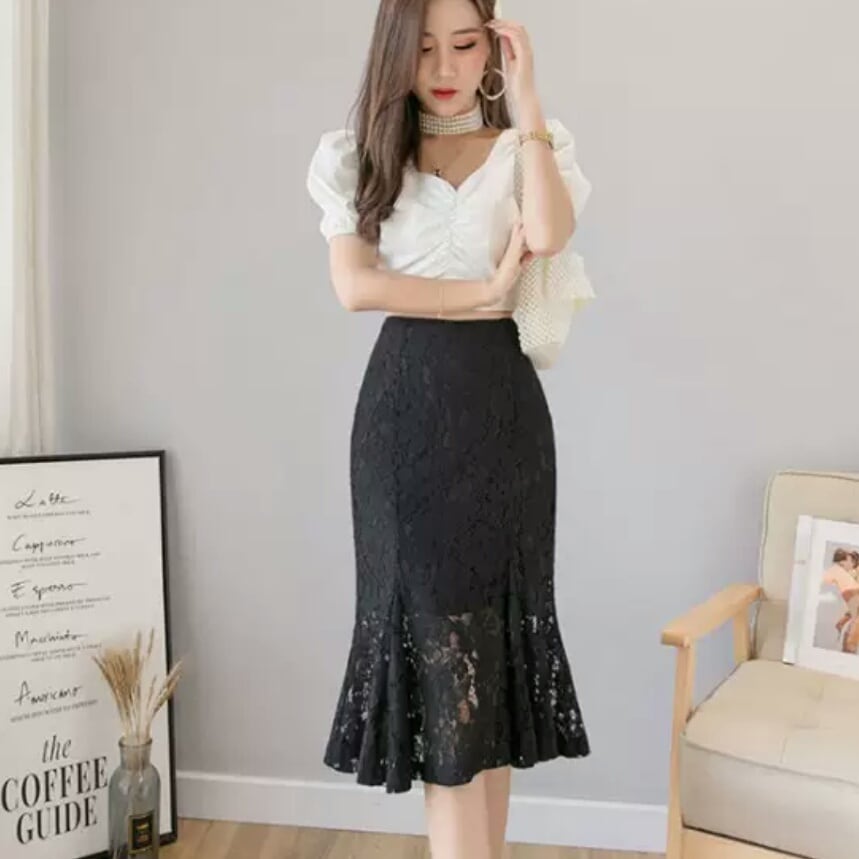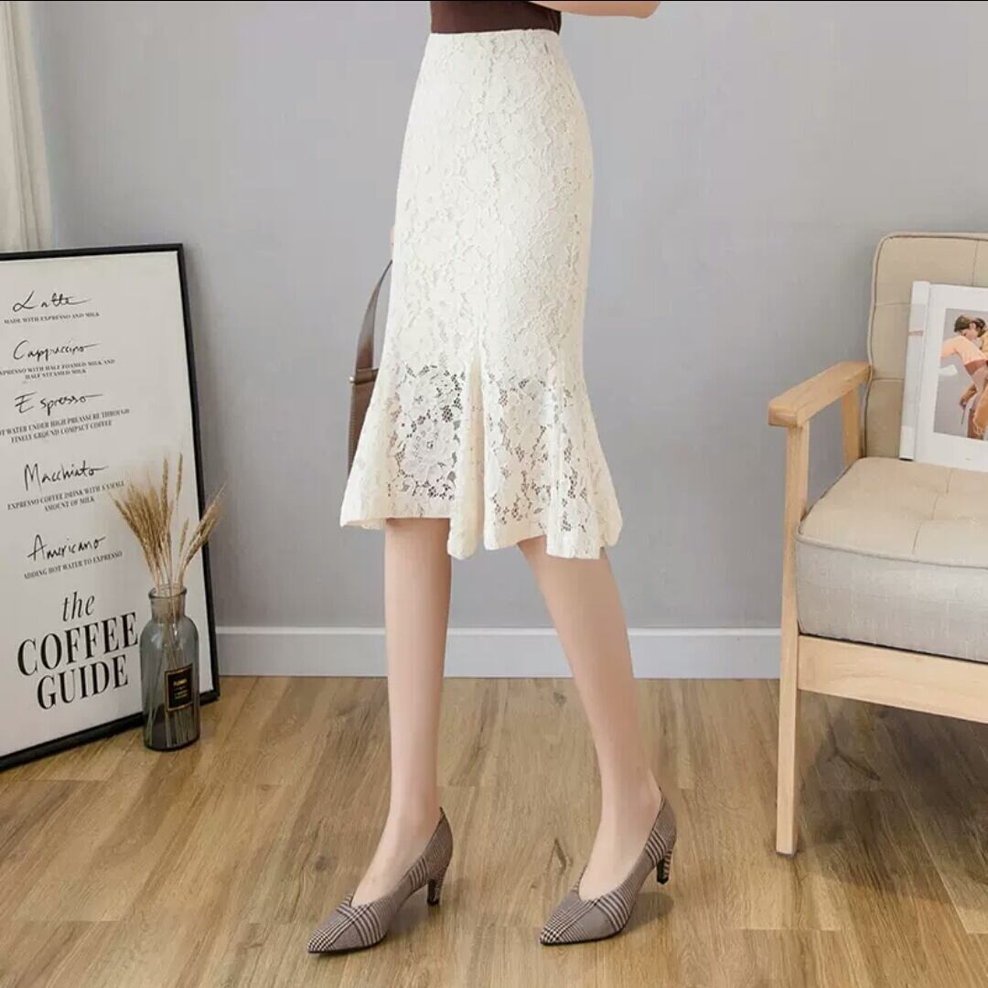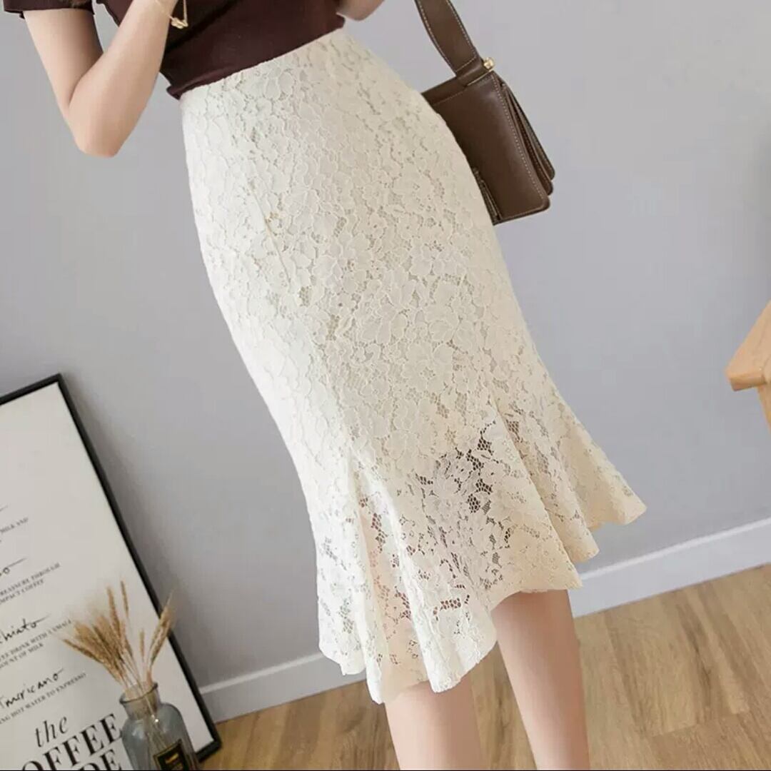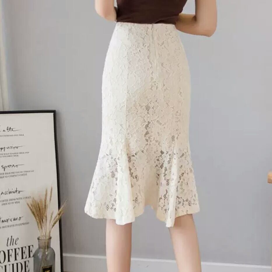 全2色 ハイウエスト レース フィッシュテール スカート ひざ丈 大人 キレイめ 上品 可愛い エレガント オフィス お出かけ お買い物 デート 女子会 春 夏 通学 学生 通勤 韓国ファッション