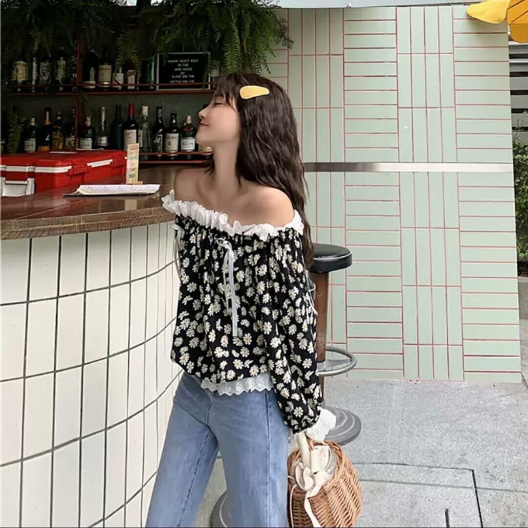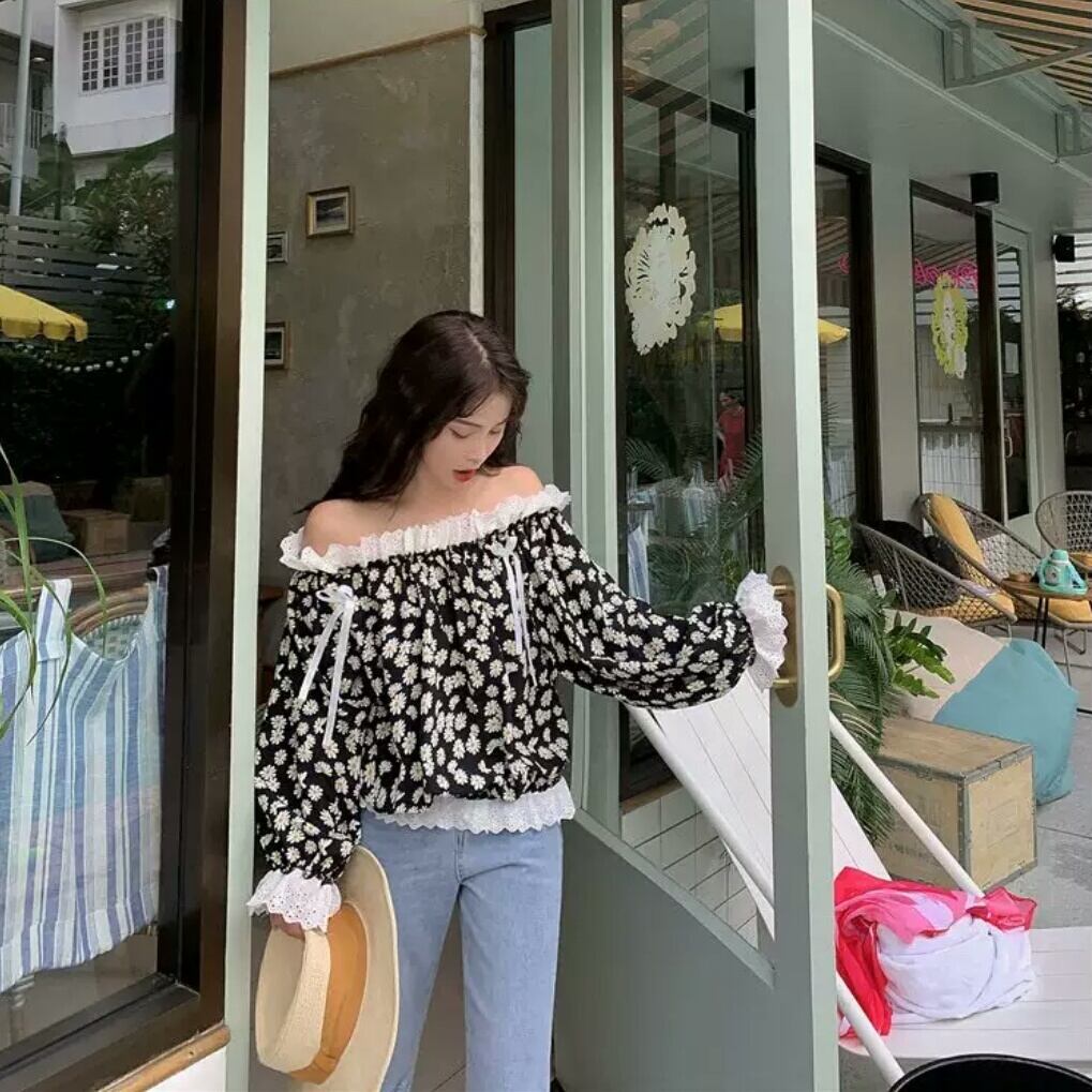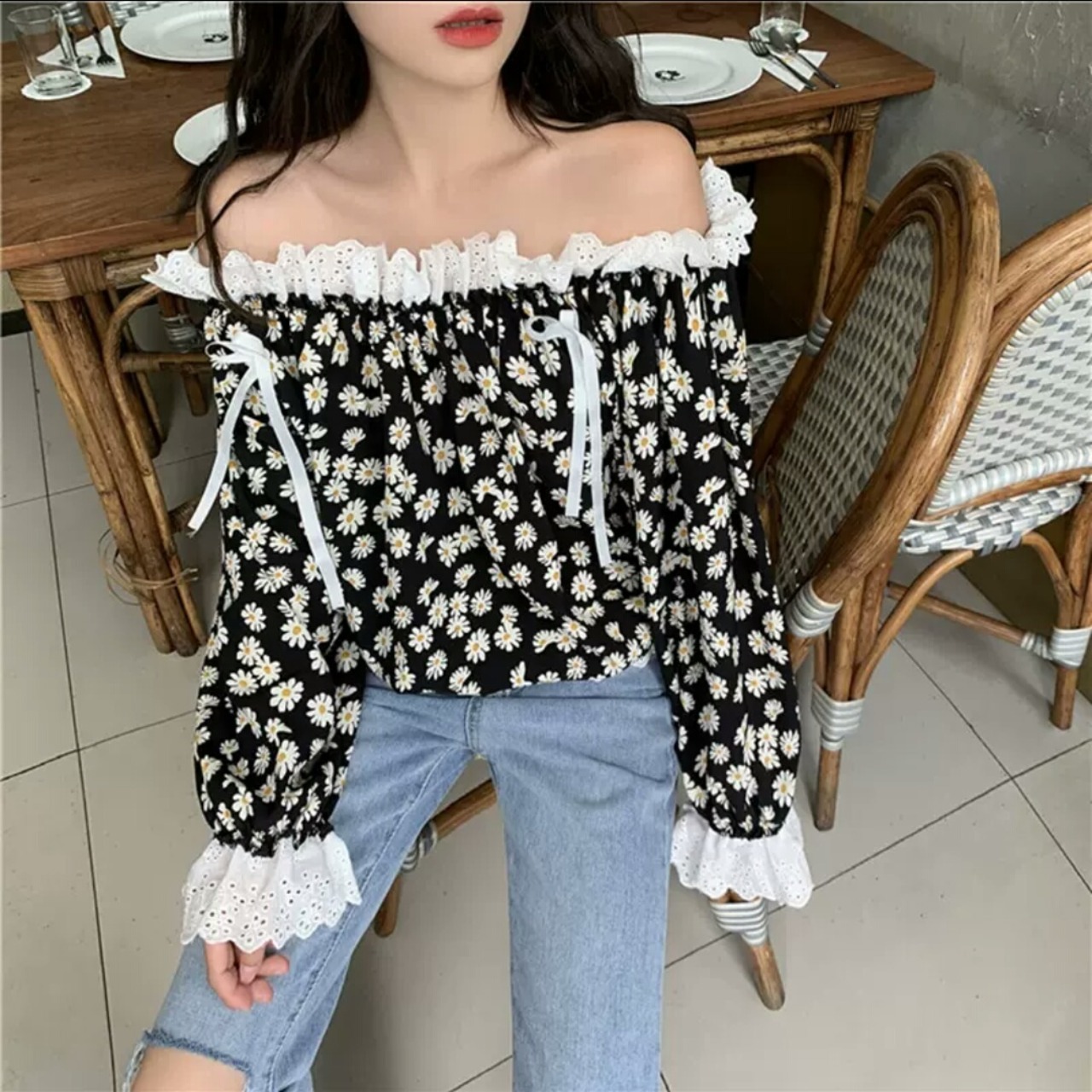 花柄 オフショルダー シャツ 長袖 レース デイジー 大人 可愛い カジュアル キレイめ お出かけ お買い物 デート 女子会 春 夏 通学 学生 通勤 韓国ファッション