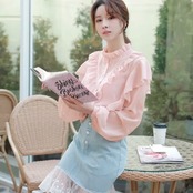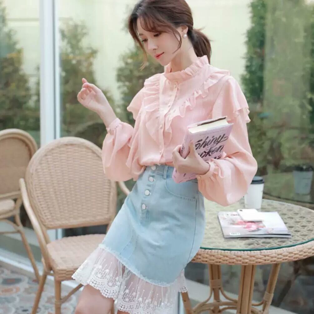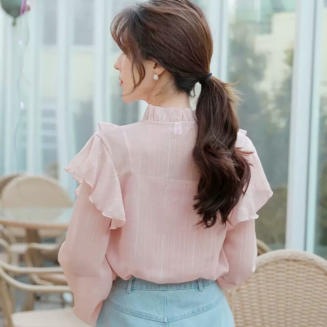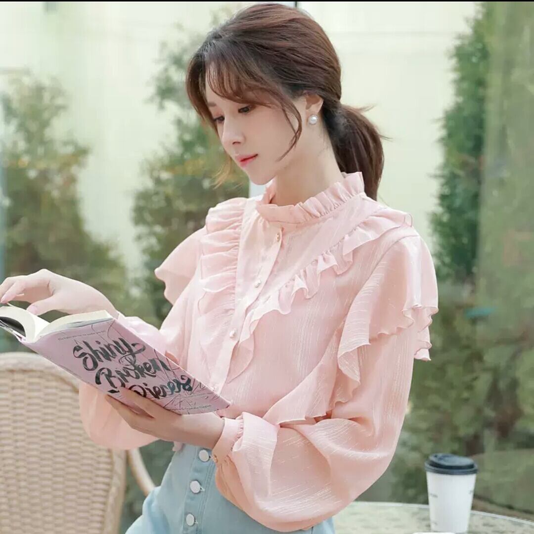 ランタンスリーブ シフォン フリル 長袖 シャツ 大人 可愛い キレイめ カジュアル 上品 エレガント お出かけ お買い物 デート 女子会 春 夏 通学 学生 通勤 韓国ファッション