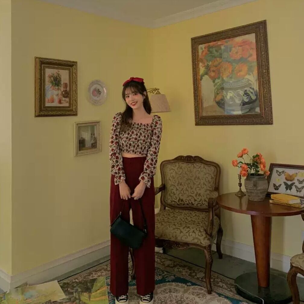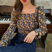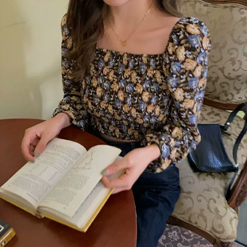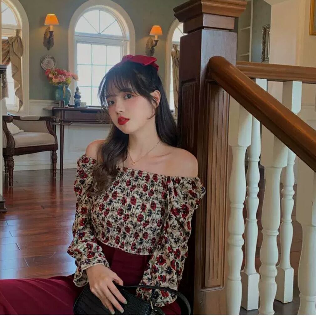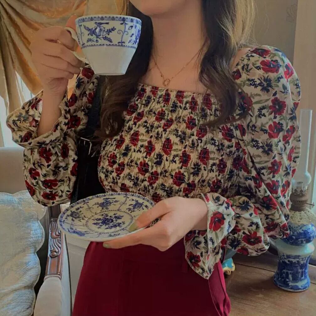 全2色 花柄 スクエアカラー オフショルダー 長袖 シャツ ブラウス 大人 可愛い キレイめ カジュアル 上品 エレガント お出かけ お買い物 デート 女子会 春 夏 通学 学生 通勤 韓国ファッション