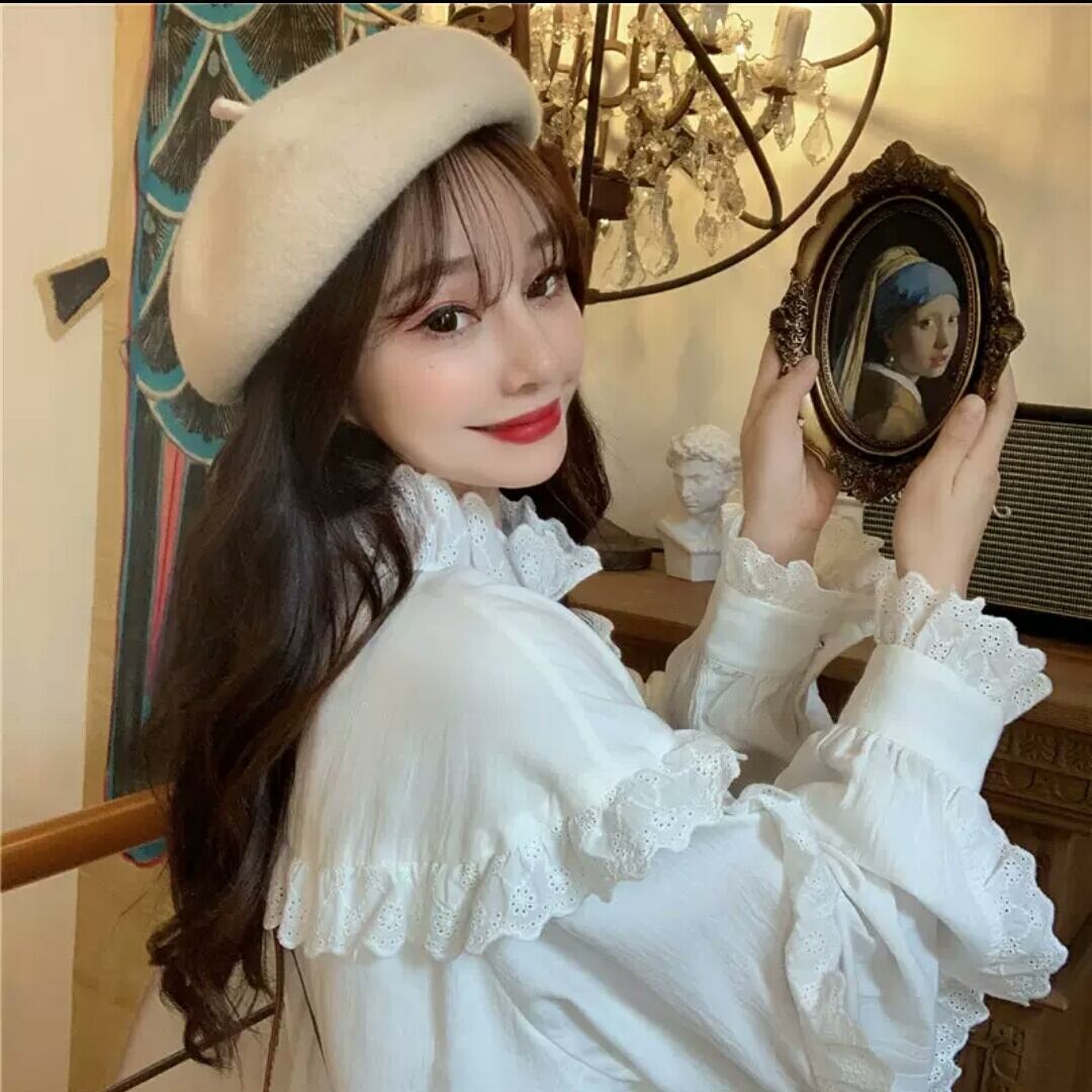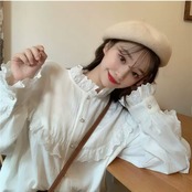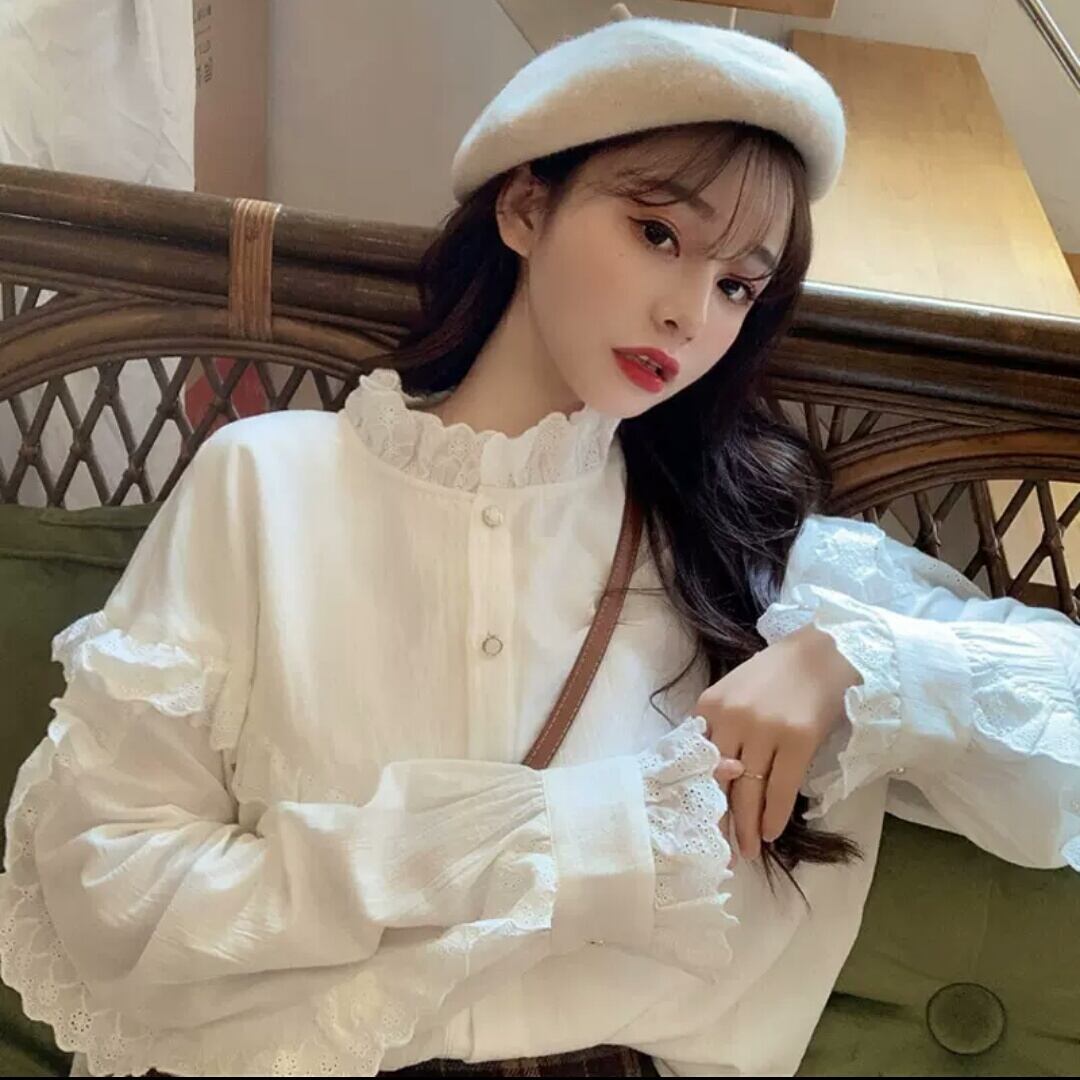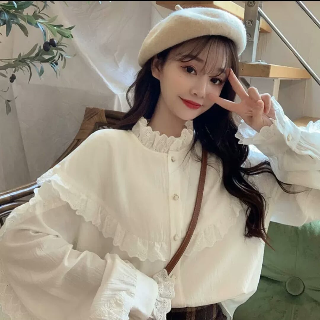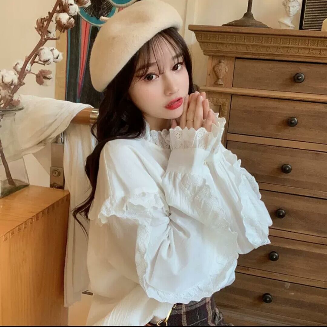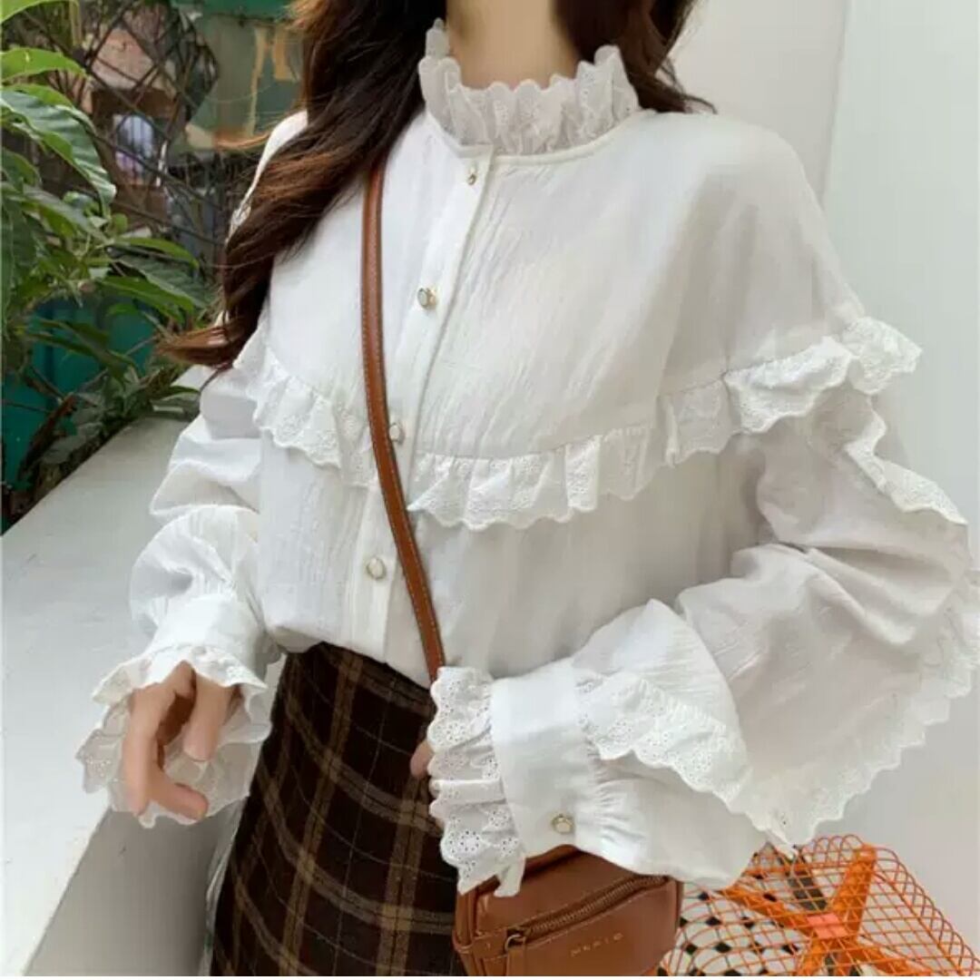 フリル レース 長袖 シャツ ブラウス レトロ 大人 無地 カジュアル 可愛い キレイめ お出かけ お買い物 デート 女子会 春 夏 通学 学生 通勤 韓国ファッション