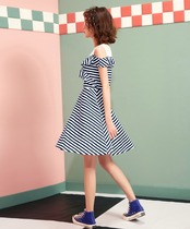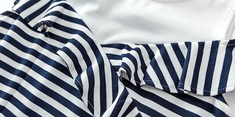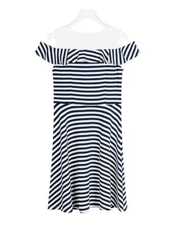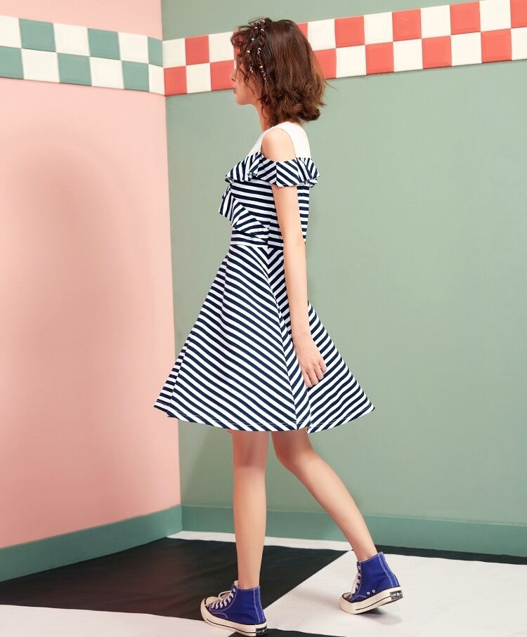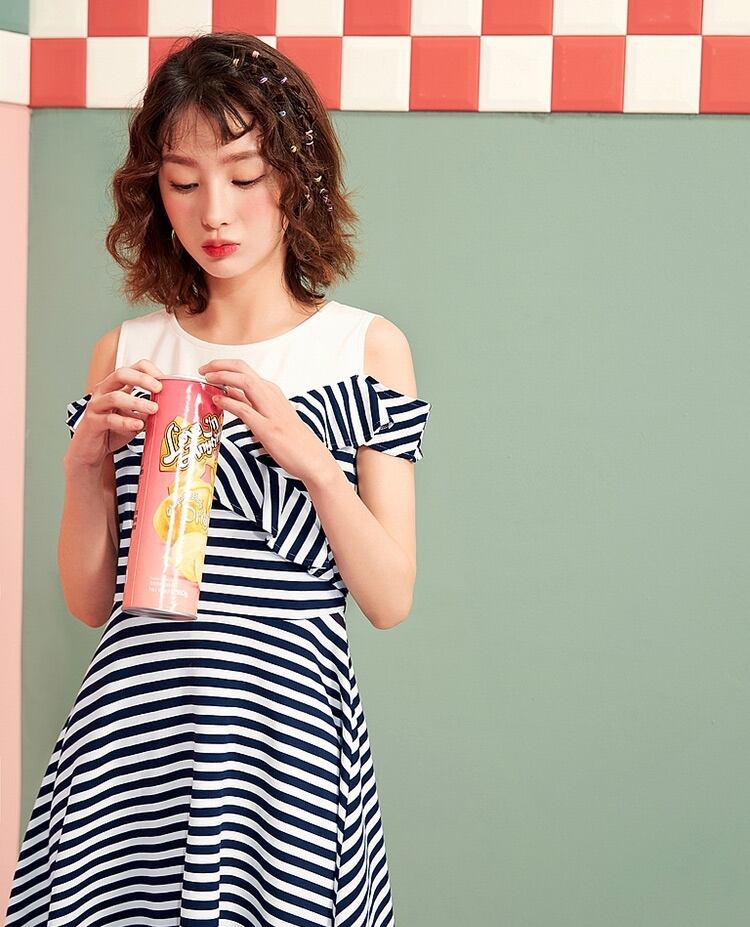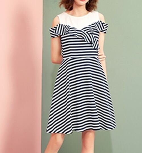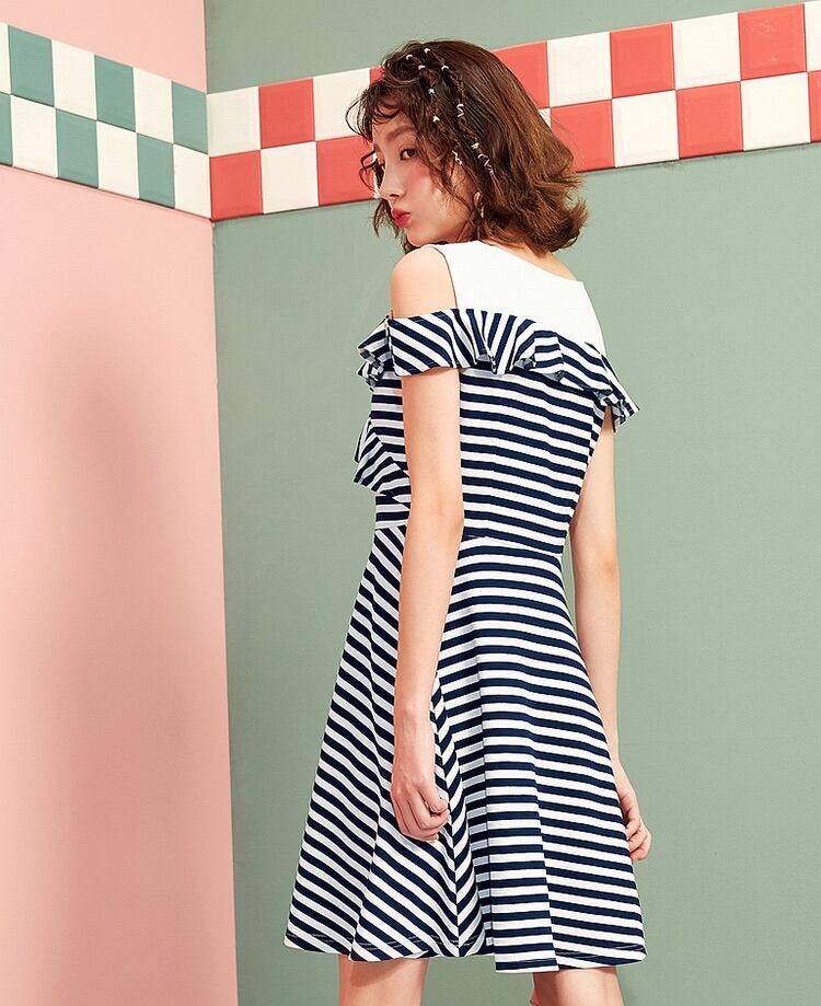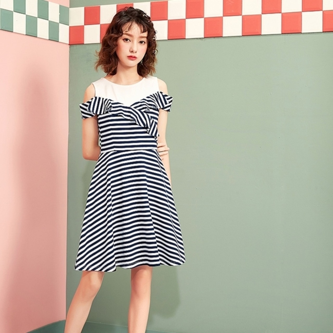 フェイクツーピース ボーダー ワンピース ショート丈 オープンショルダー オフショルダー フリル フレア ゆったりめ カジュアル デイリー 可愛い お出かけ 韓国ファッション モノトーン 夏