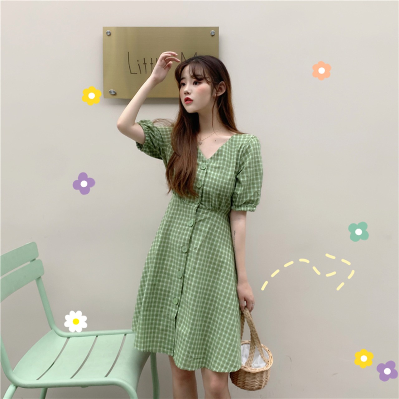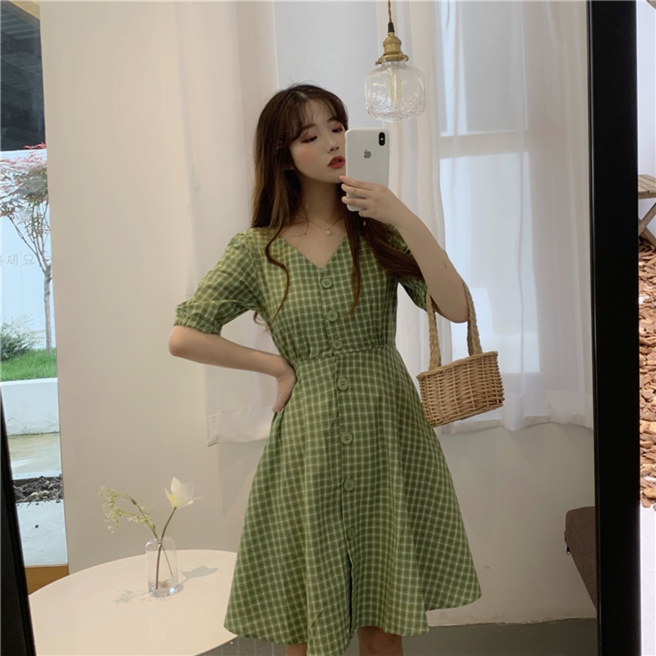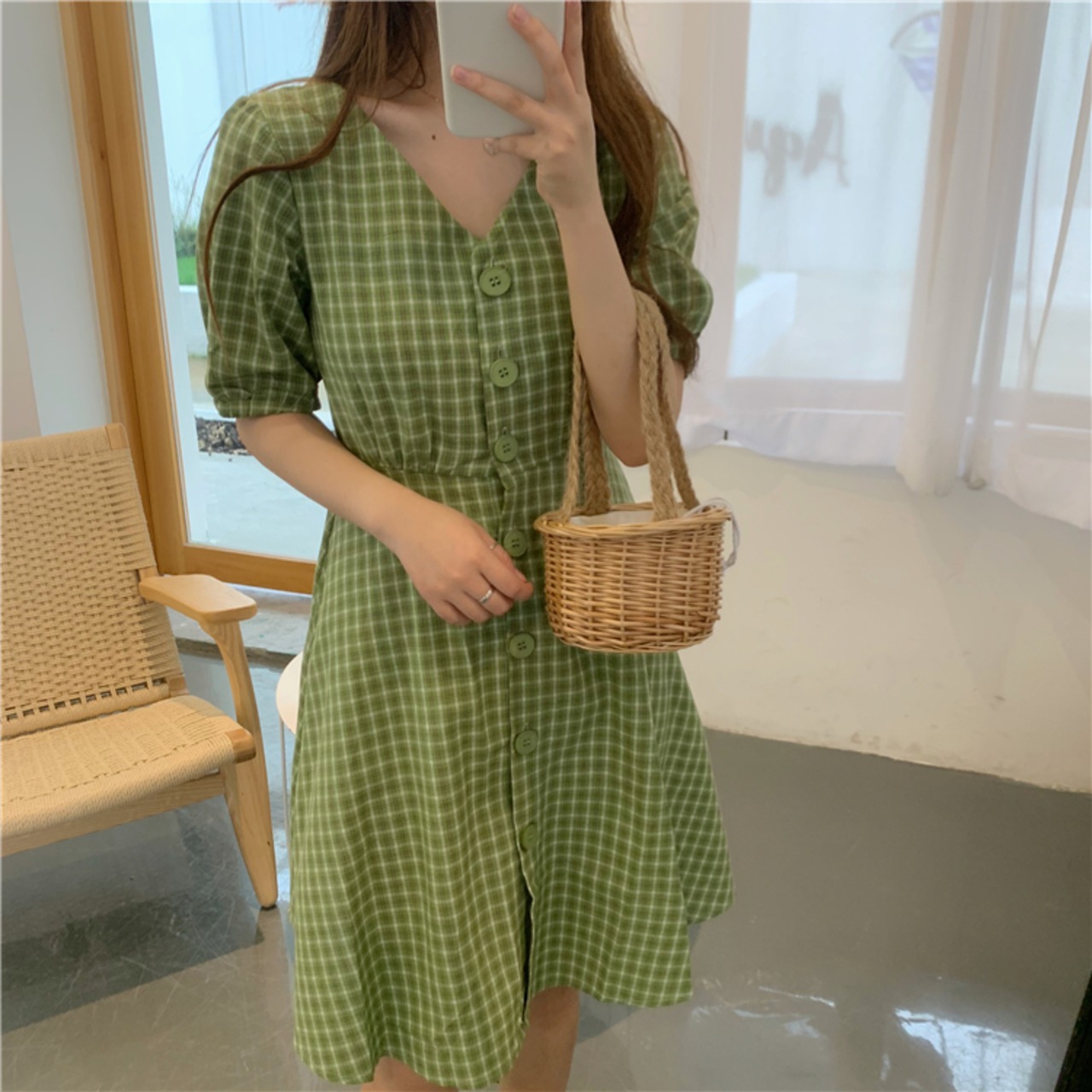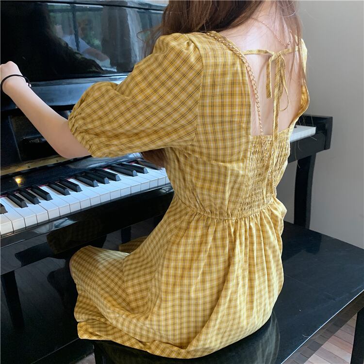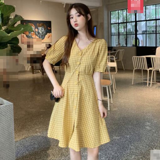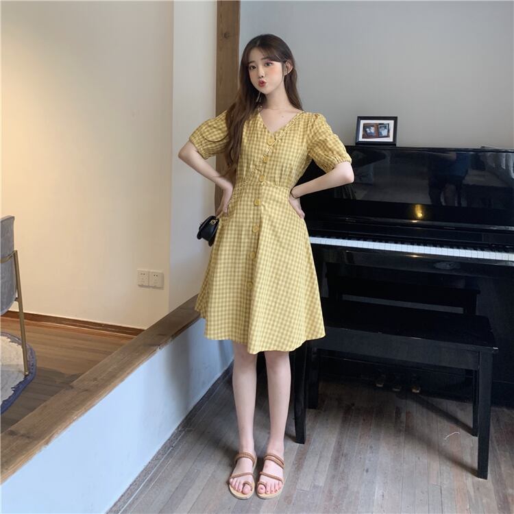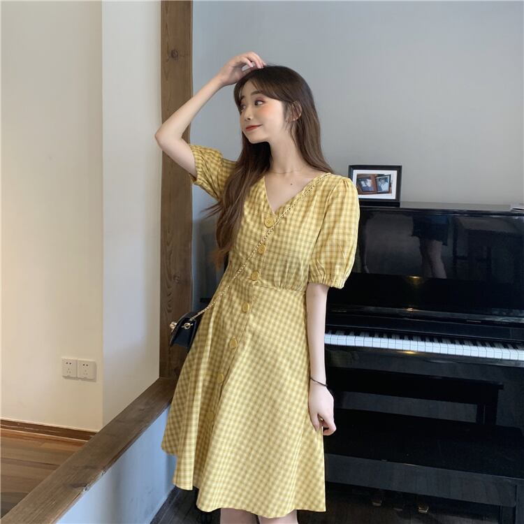 全2色 ワンピース チェック柄 フロントボタン Vネック ハイウエスト 5分袖 バックコンシャス ショート丈 フレア カジュアル デイリー お出かけ 大人可愛い 夏