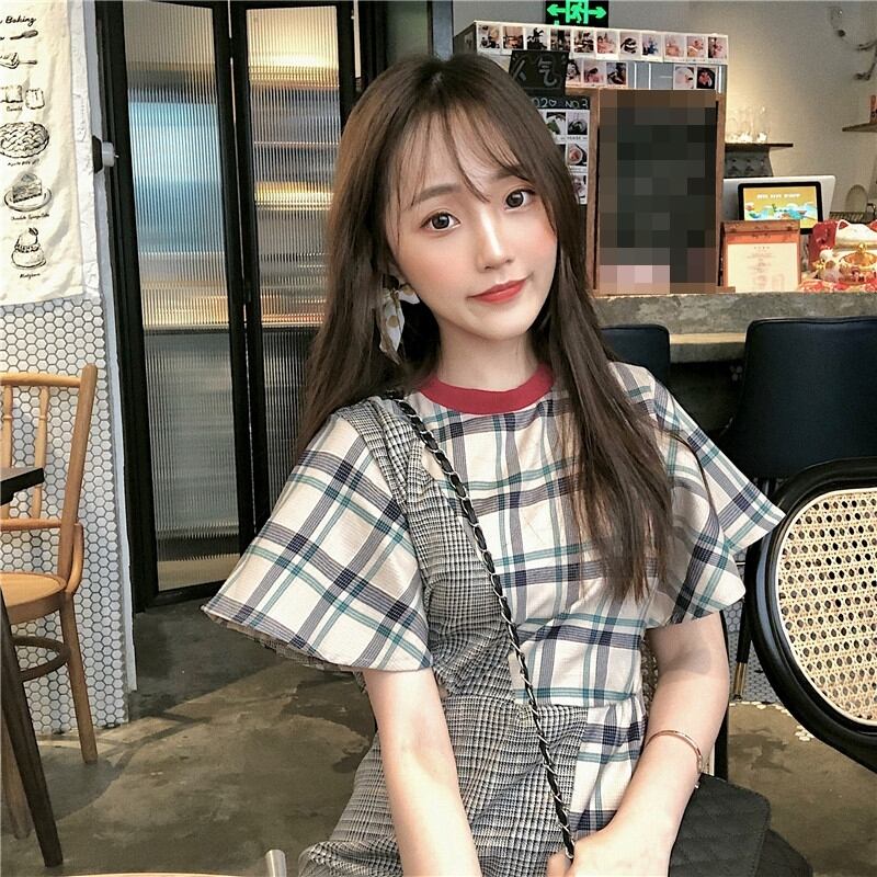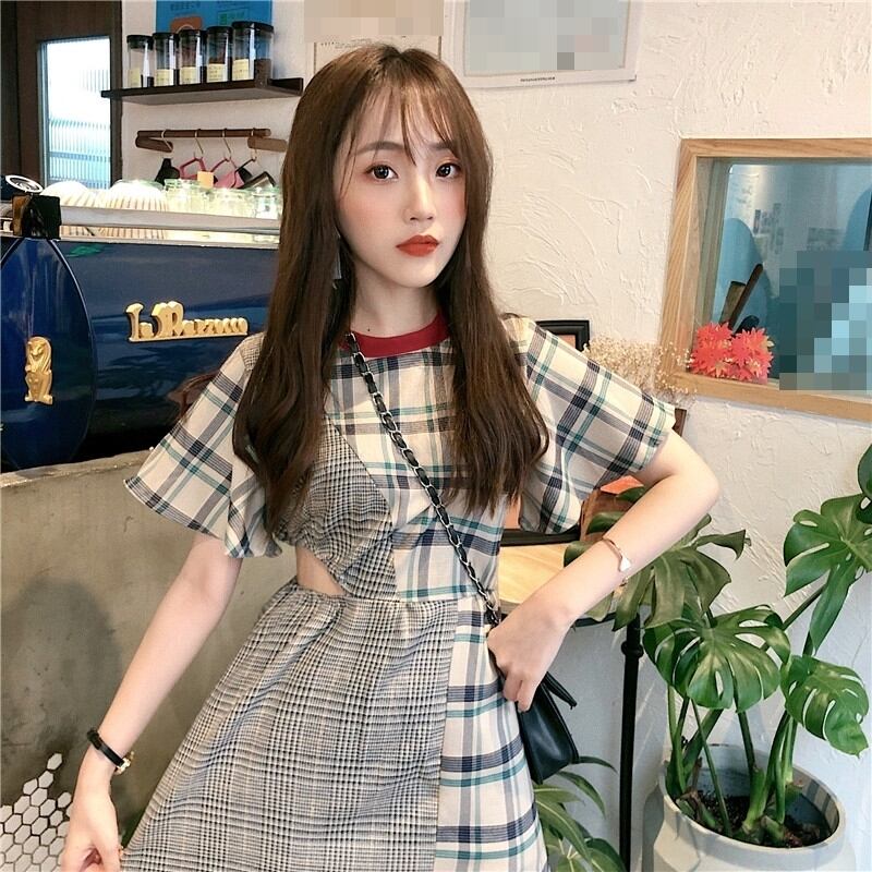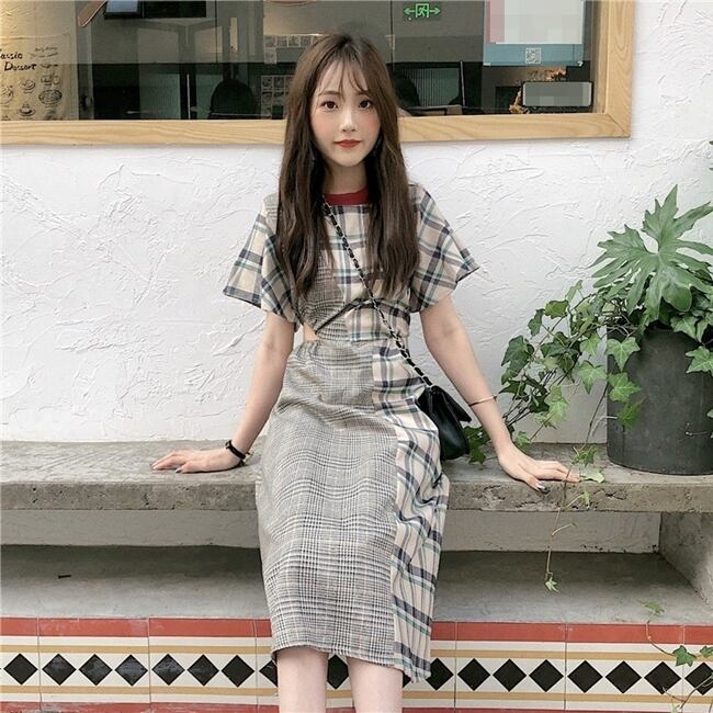 ワンピース チェック柄 クルーネック 半袖 スリム ミモレ丈 バックシャン 背中みせ フレアスリーブ カジュアル きれいめ デート 夏