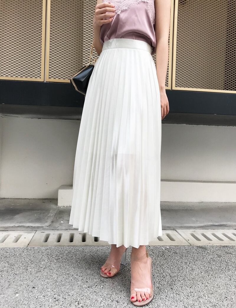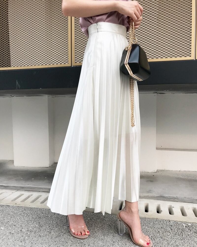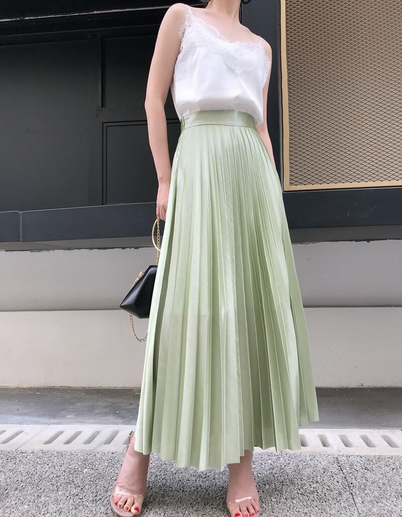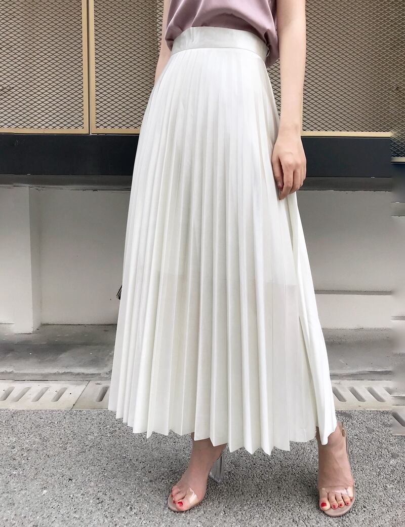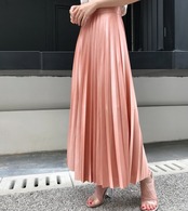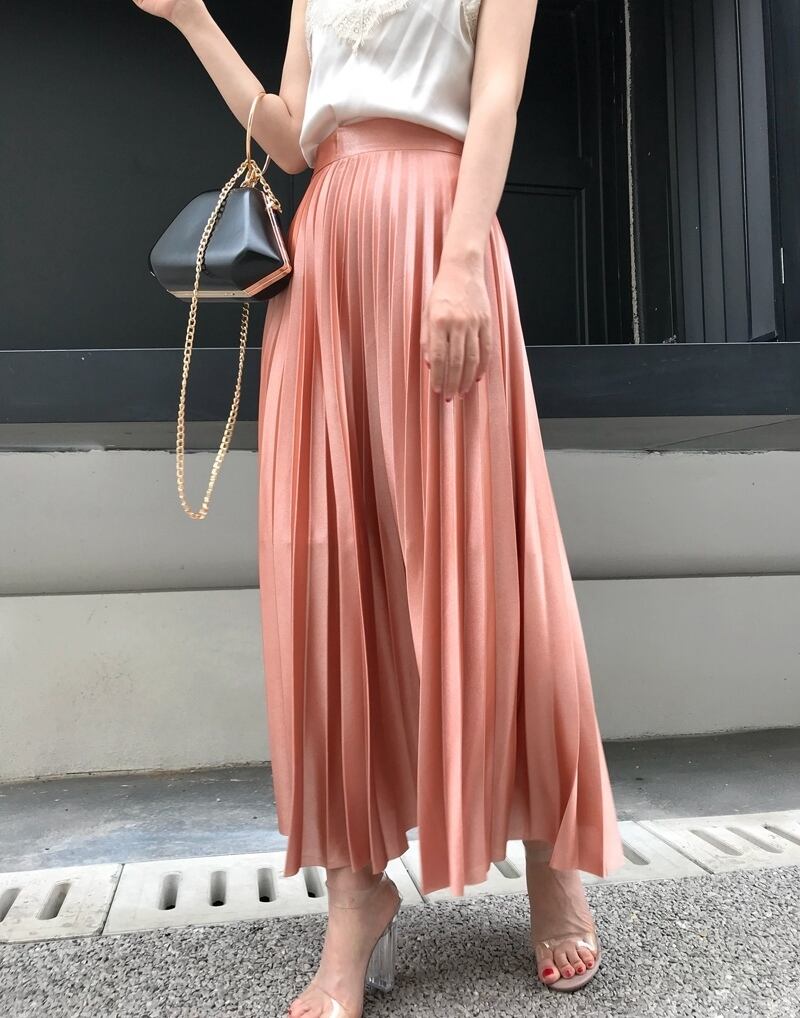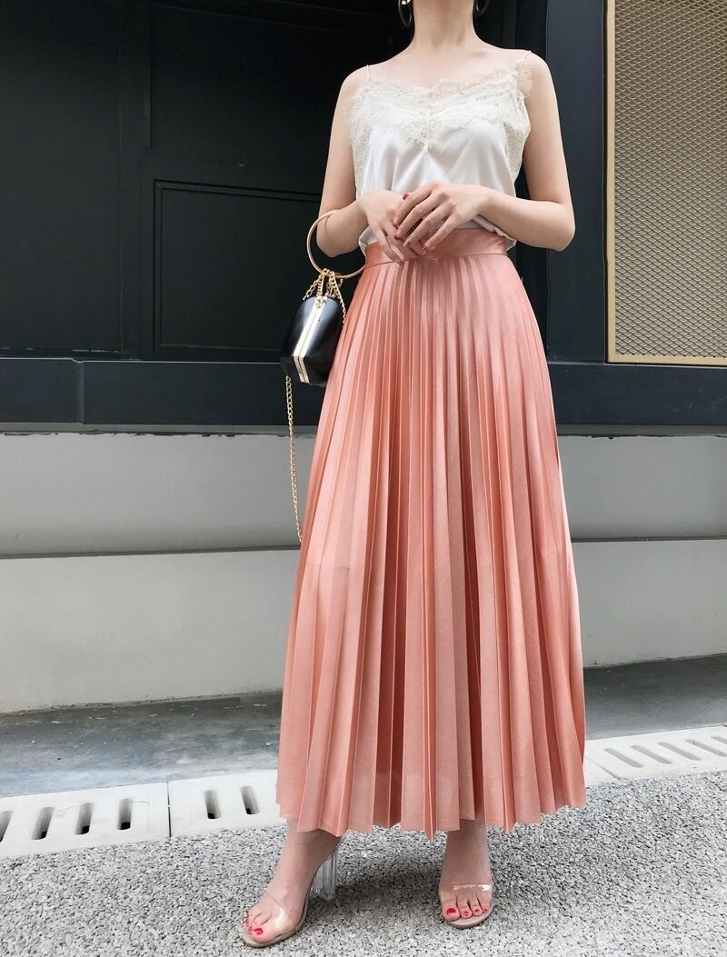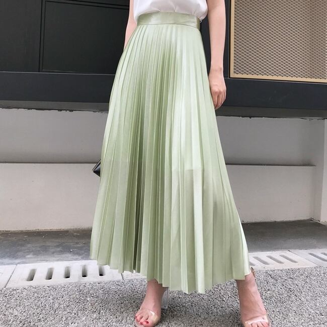 全3色 スカート 光沢 メタリックカラー プリーツ ロング丈 ハイウエスト 上品 カジュアル きれいめ デート 女子会 大人可愛い お出かけ 春 夏