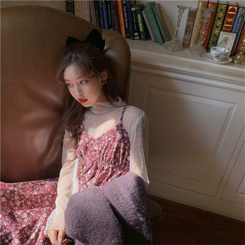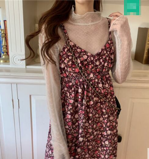セットアップ ツーピース ブラウス キャミソールワンピ 小花柄 シースルー ハイネック ロング丈 可愛い ハイネック ガーリー 長袖 カジュアル きれいめ デート 女子会 春 夏