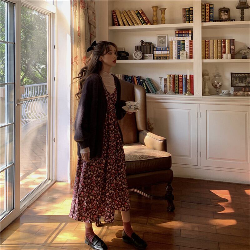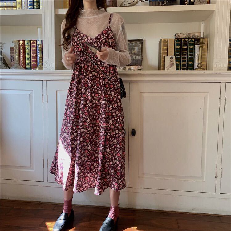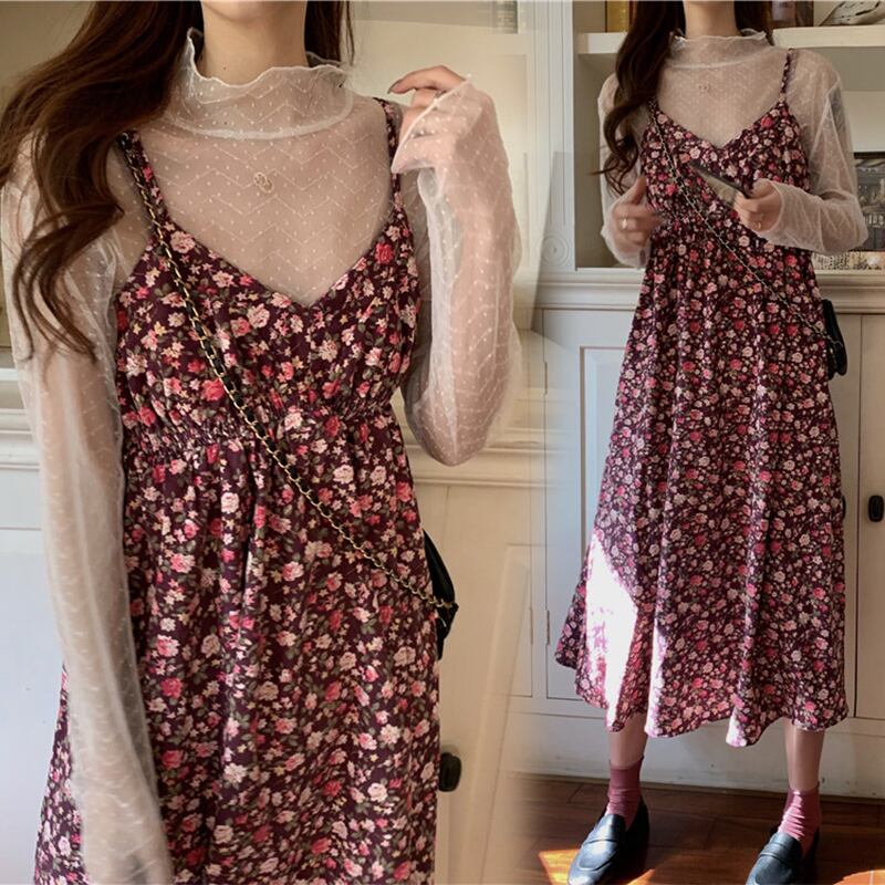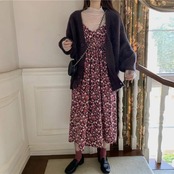 花柄が可愛いインナーとロング丈ワンピースの2点セットです。