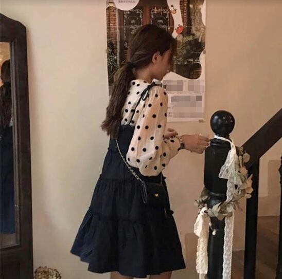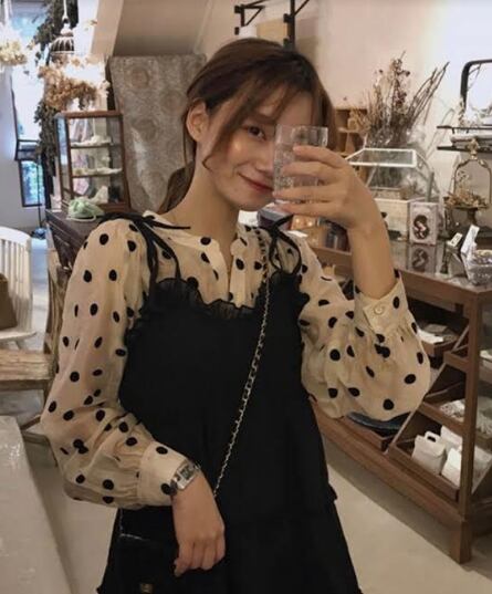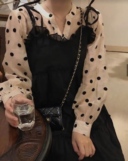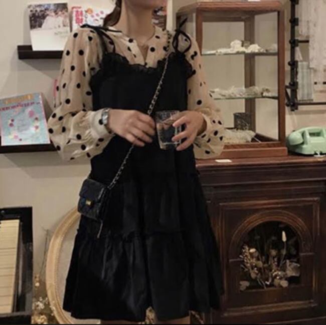 セットアップ ツーピース ドット柄 ブラウス キャミソールワンピ シャツ シースルー ショート丈 ティアード フリル リボン フレア 可愛い ガーリー 長袖 カジュアル パフスリーブ きれいめ デート 女子会 春 夏
