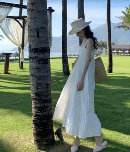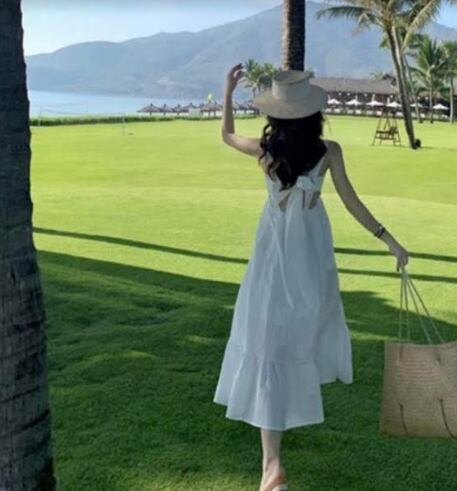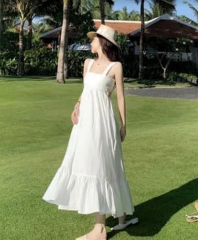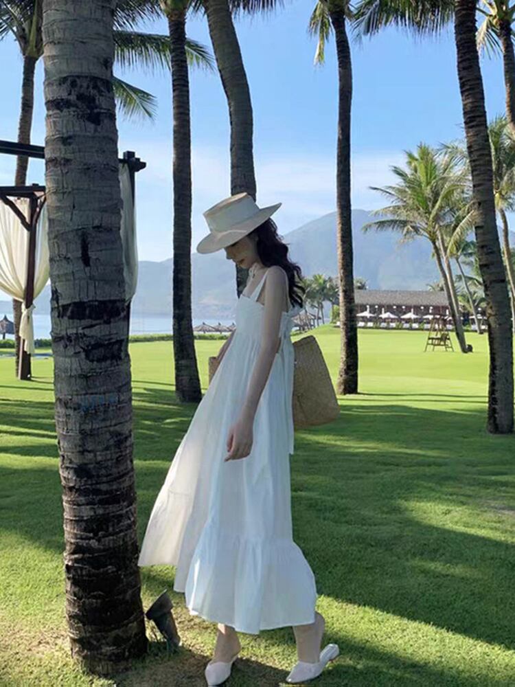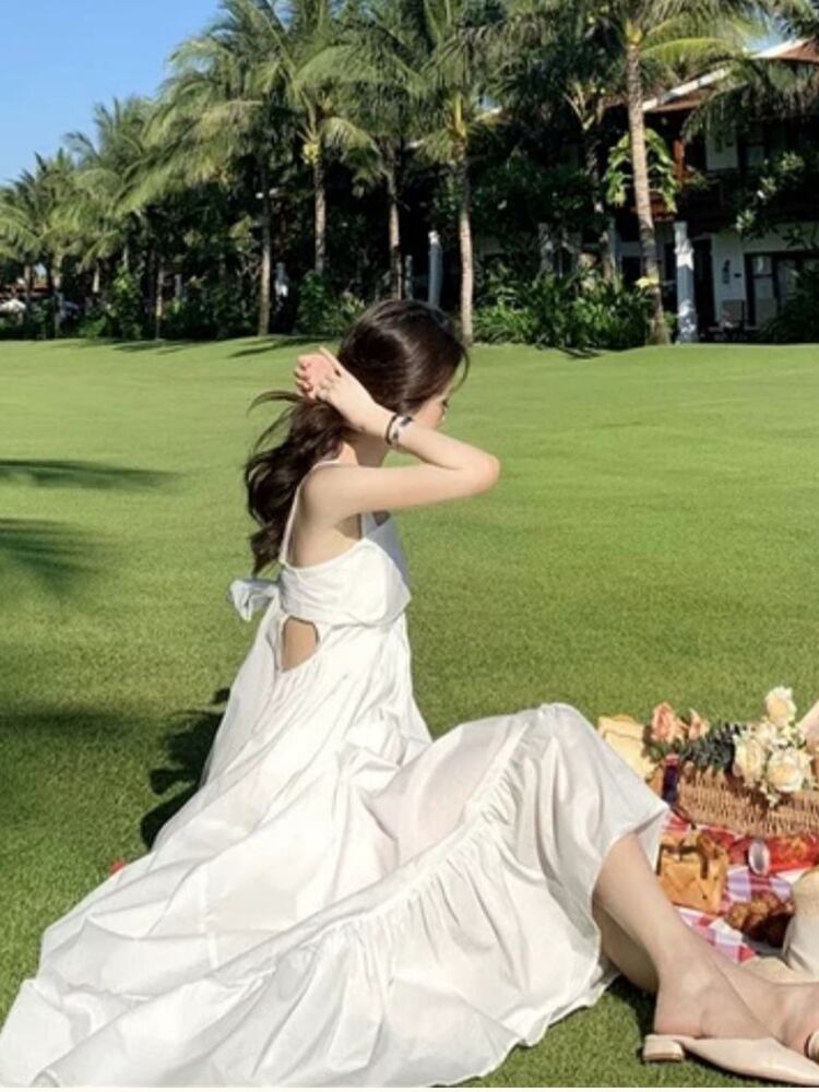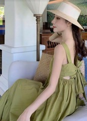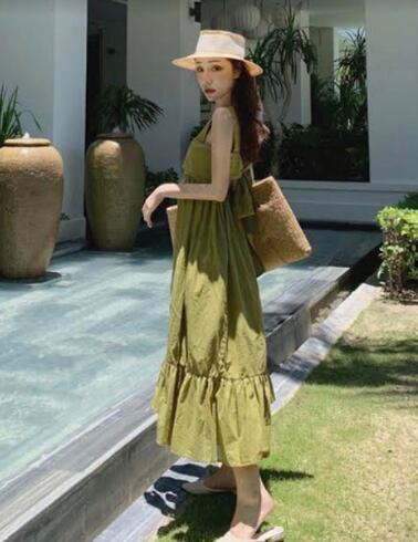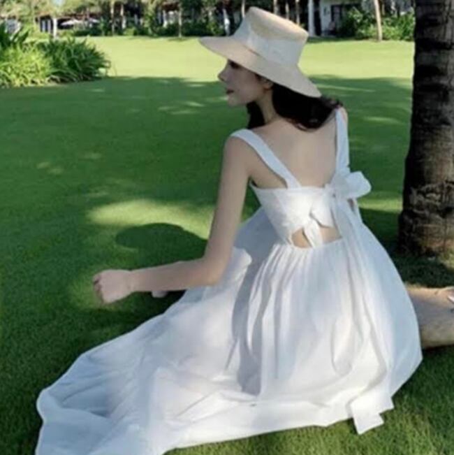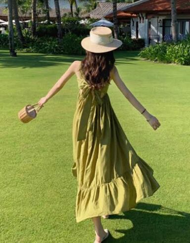 全2色 ワンピース バックコンシャス バックリボン バックシャン フレア ロング丈 ゆったり マーメイド フリル カジュアル ノースリーブ スクエアネック 無地 大人可愛い リゾート 夏