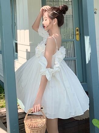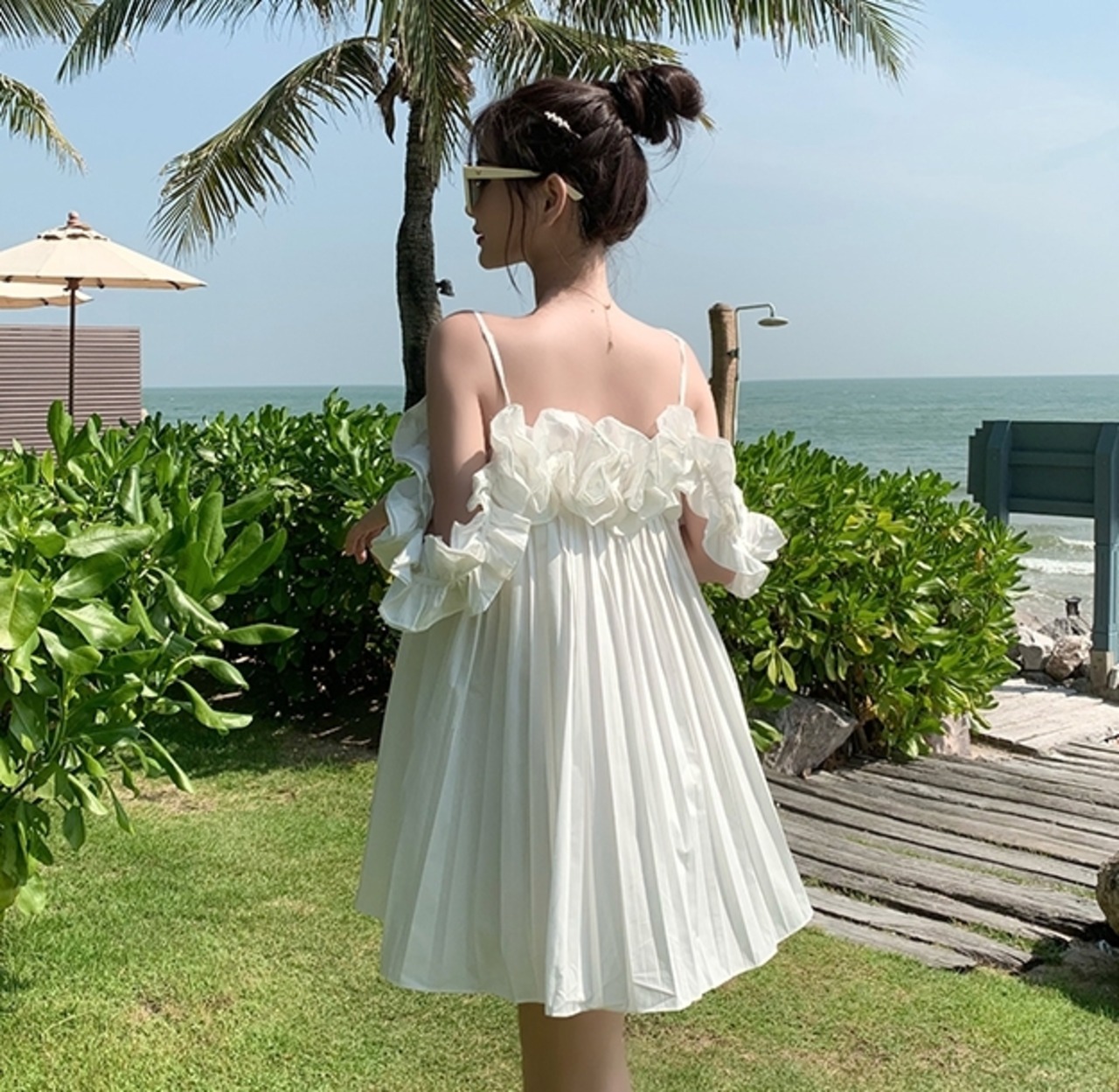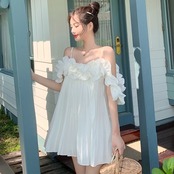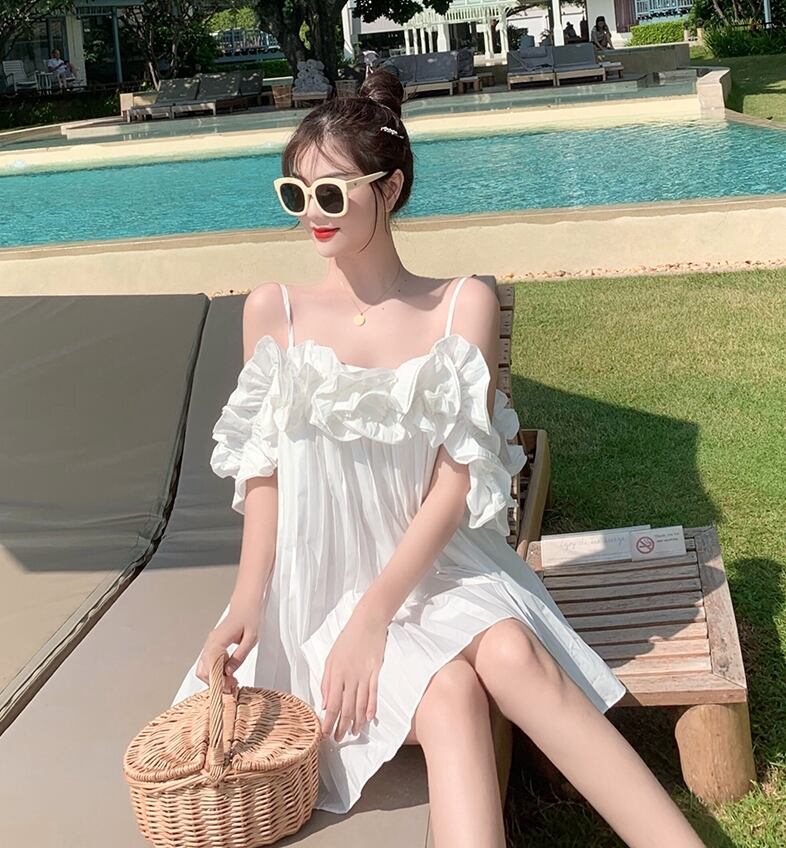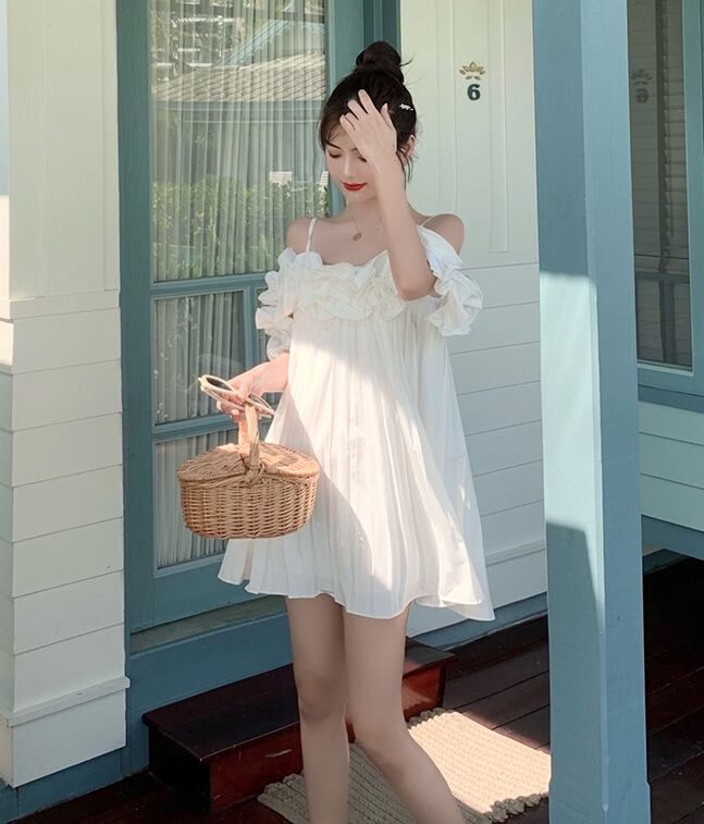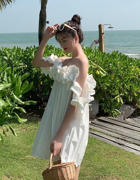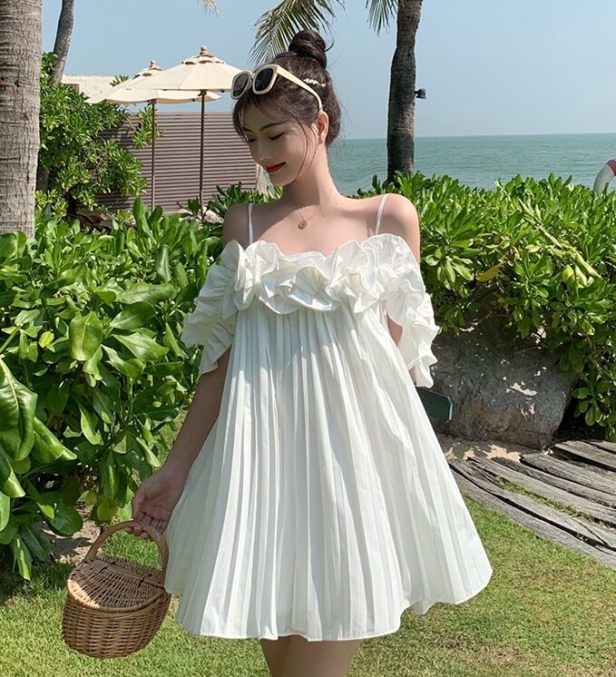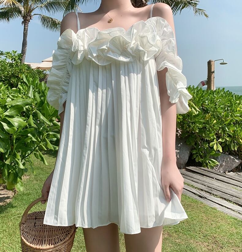 ワンピース キャミソールワンピ オフショルダー フリル ミニ丈 フレア ゆったり ガーリー 可愛い カジュアル デート 無地 リゾート フェミニン プリーツ 夏