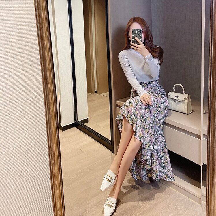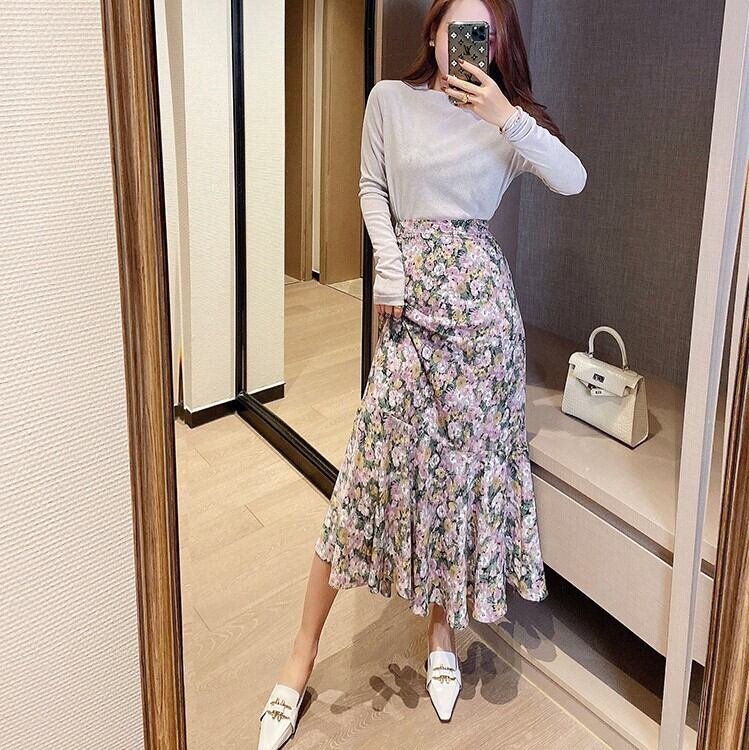 全2色 花柄スカート ロングスカート Aライン 切り替え フリル フェミニン きれいめ カジュアル 春 夏 お出かけ デート パープル ピンク