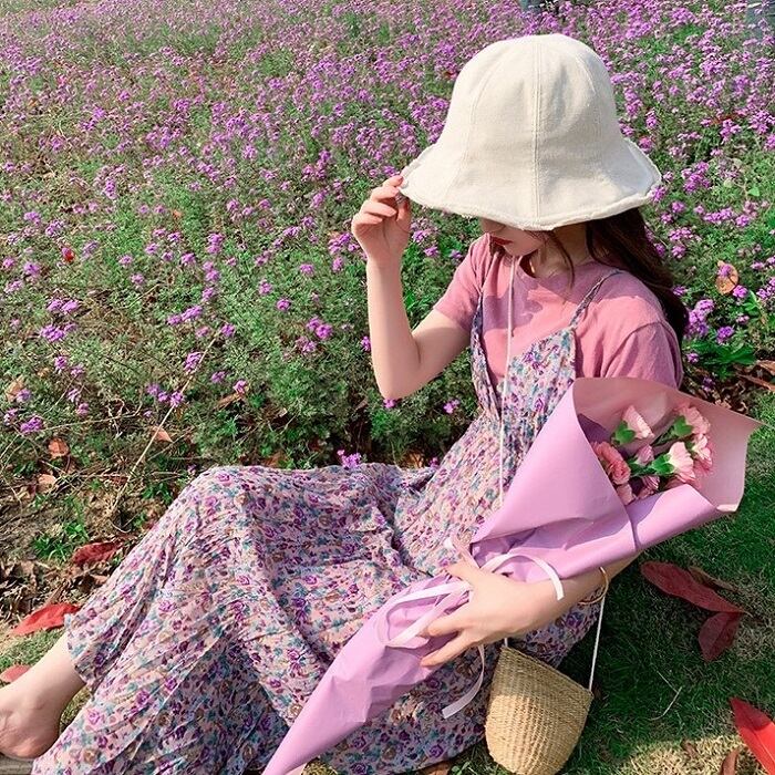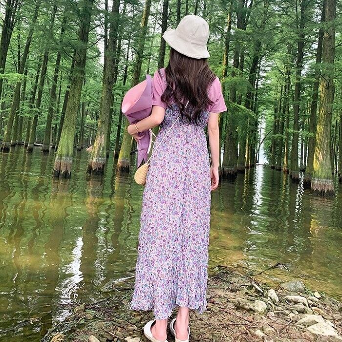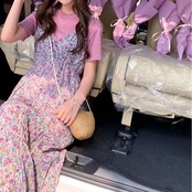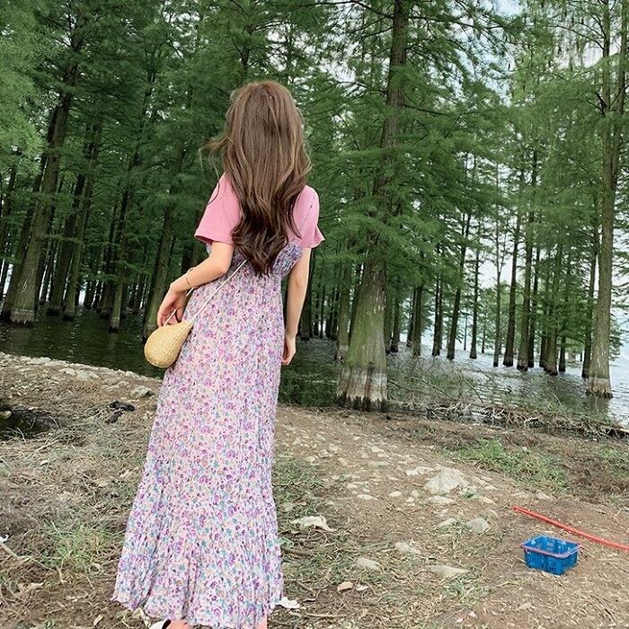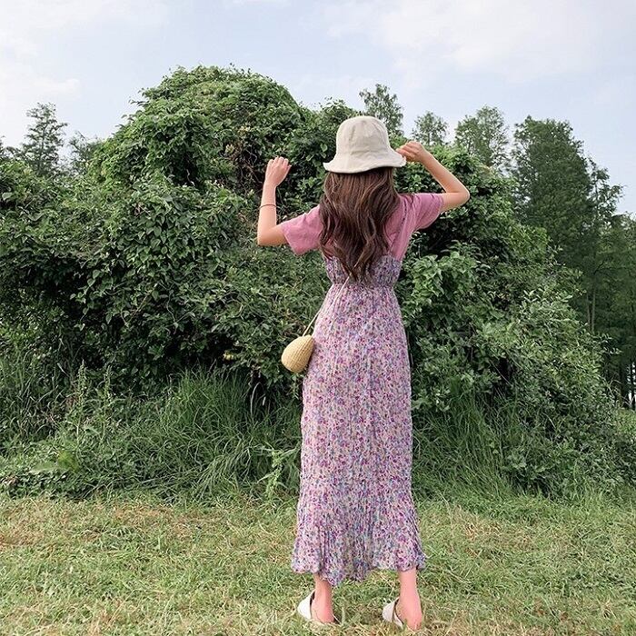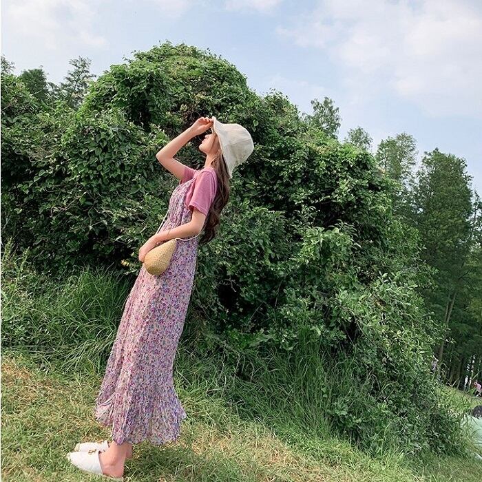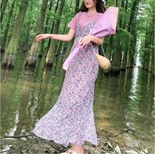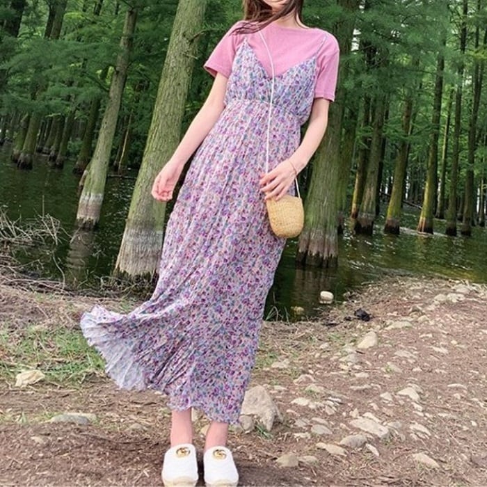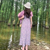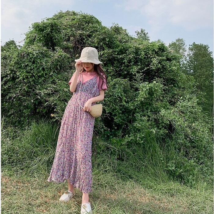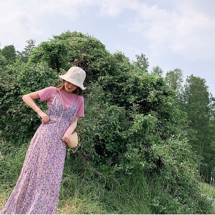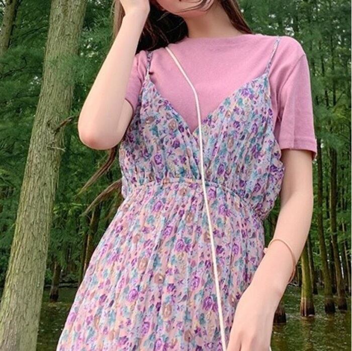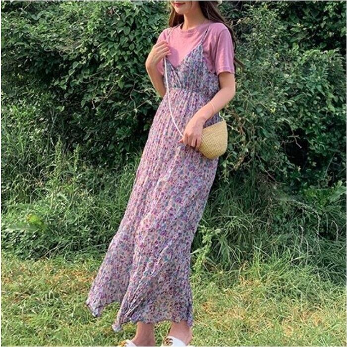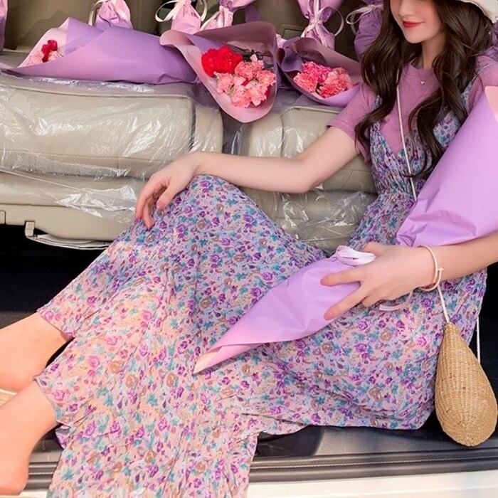 キャミソールドレス キャミワンピ ジャンパースカート 小花柄 ハイウエスト ロングスカート シフォン Aライン フェミニン きれいめ カジュアル 春 夏 お出かけ デート パープル
