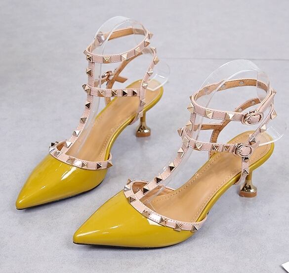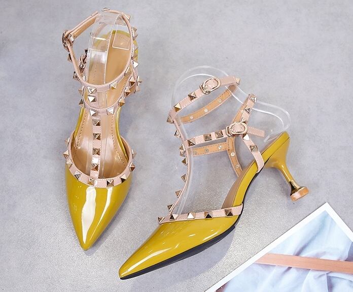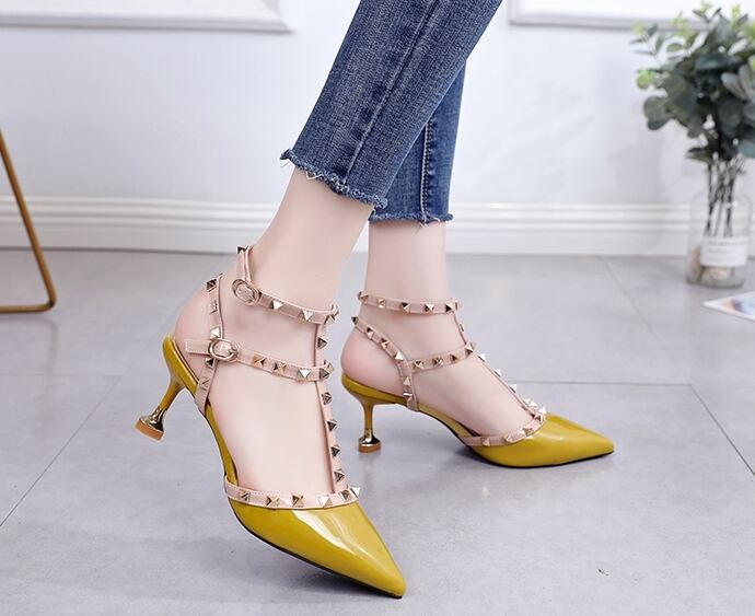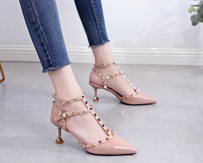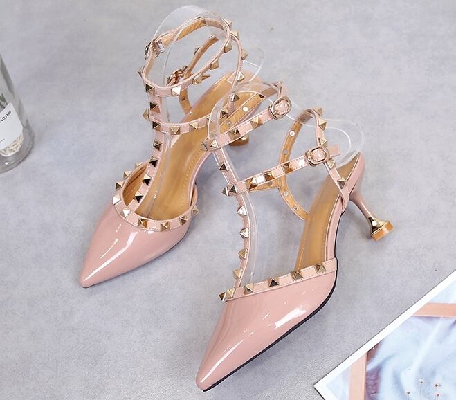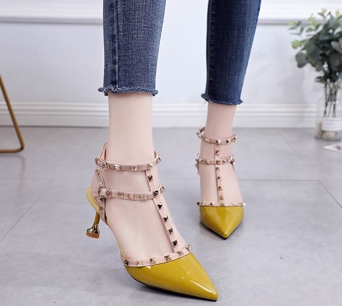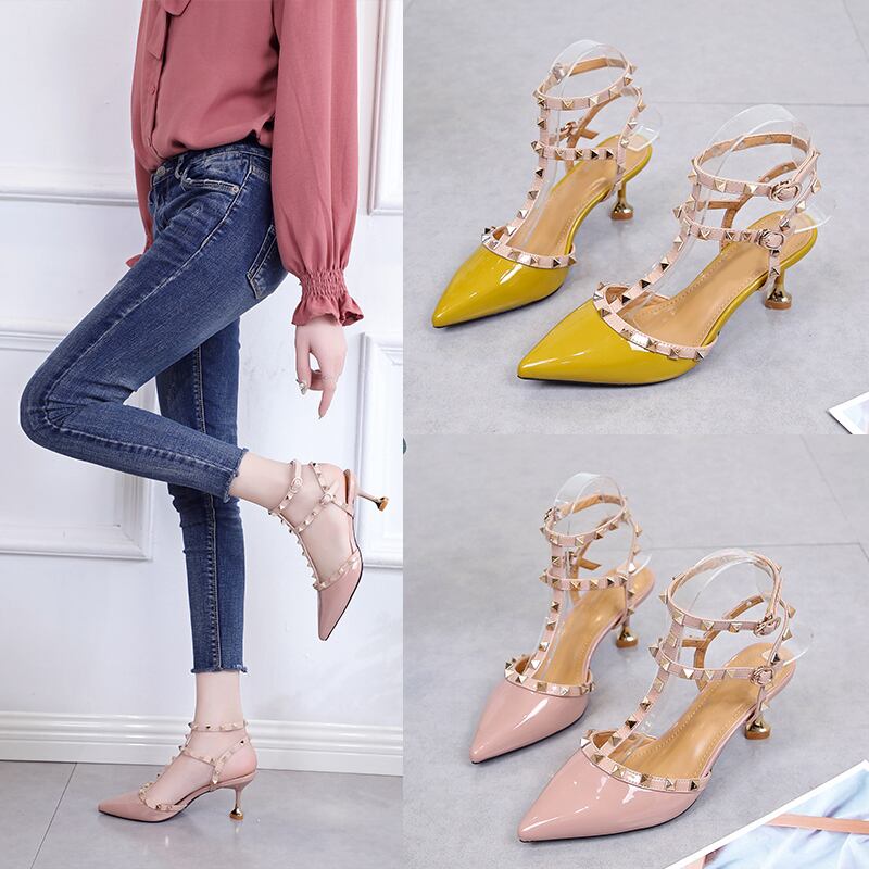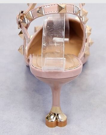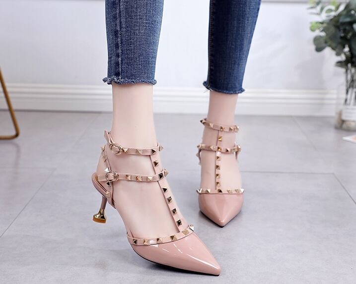 全2色 サンダル ミュール スタッズ ポインテッドトゥ アンクルストラップ ミドルヒール ハートヒール きれいめ カジュアル デート 女子会 春 夏