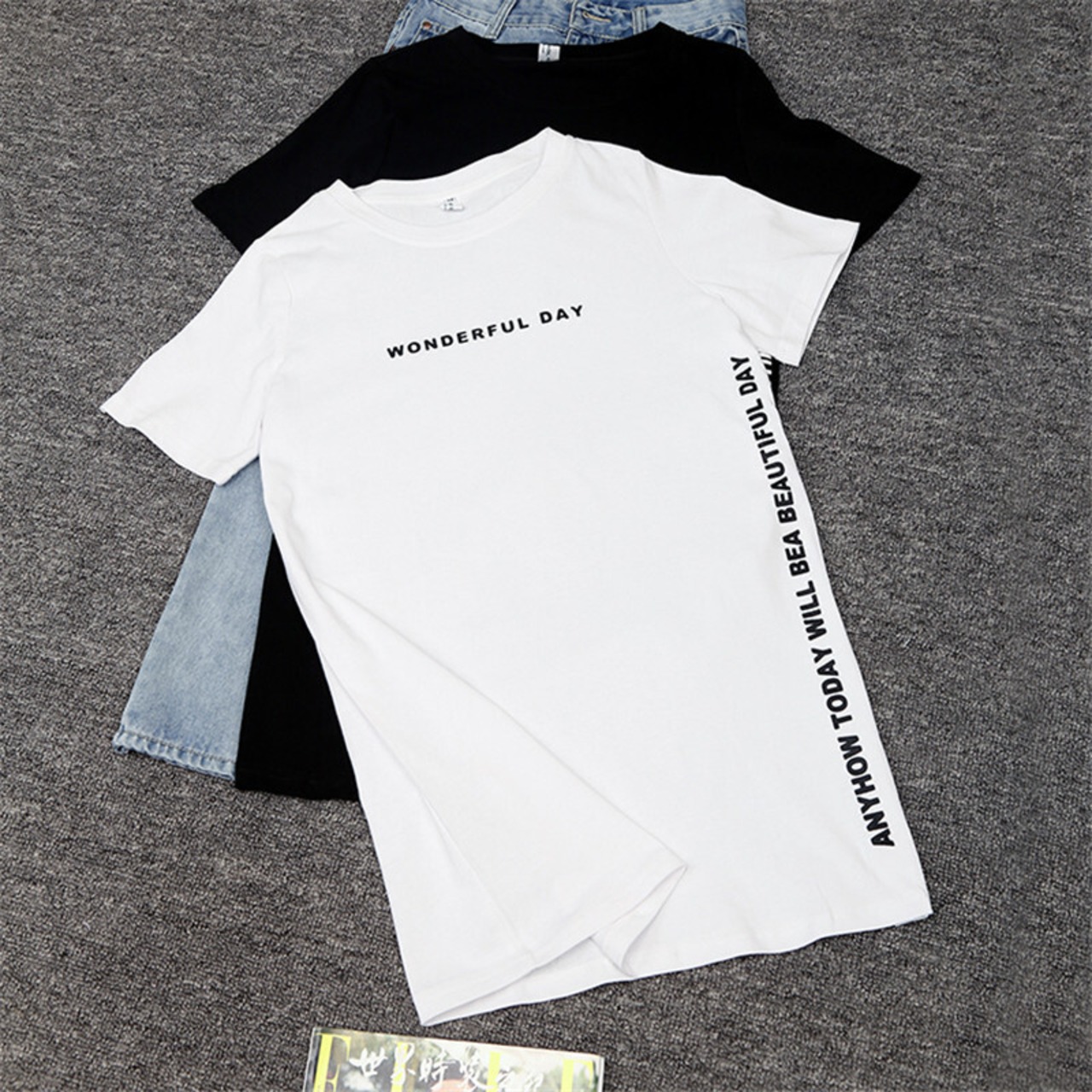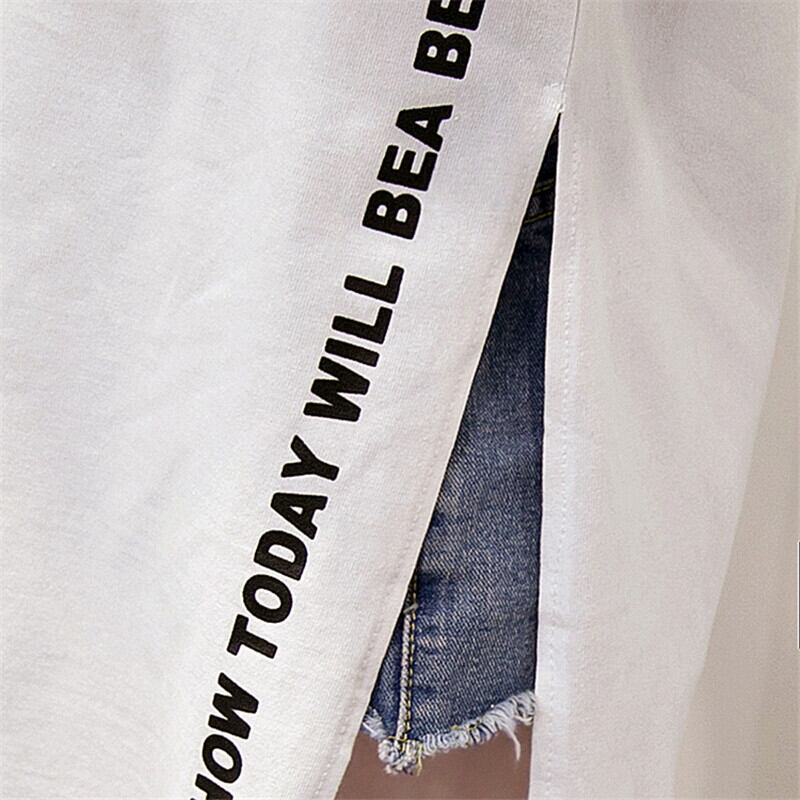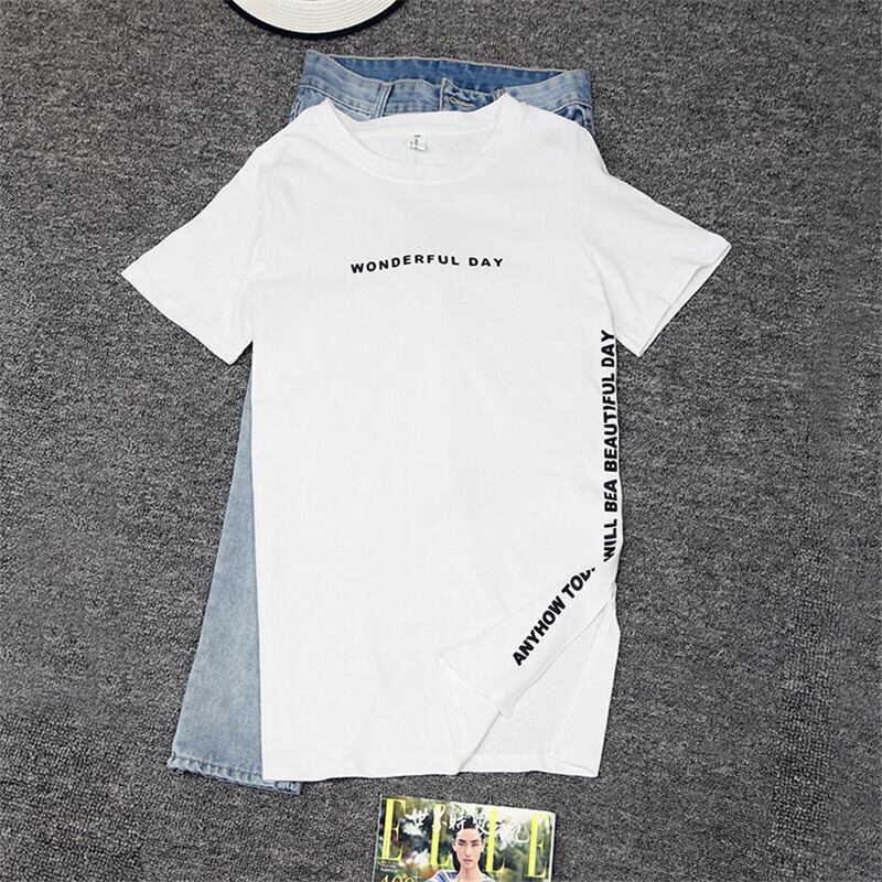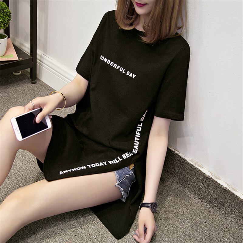 全2色 Tシャツ サイドスリット ロゴ入り ラウンドネック ロングTシャツ 半袖 シンプル カジュアル ベーシック ディリー ラフ お出かけ ゆったりめ 夏