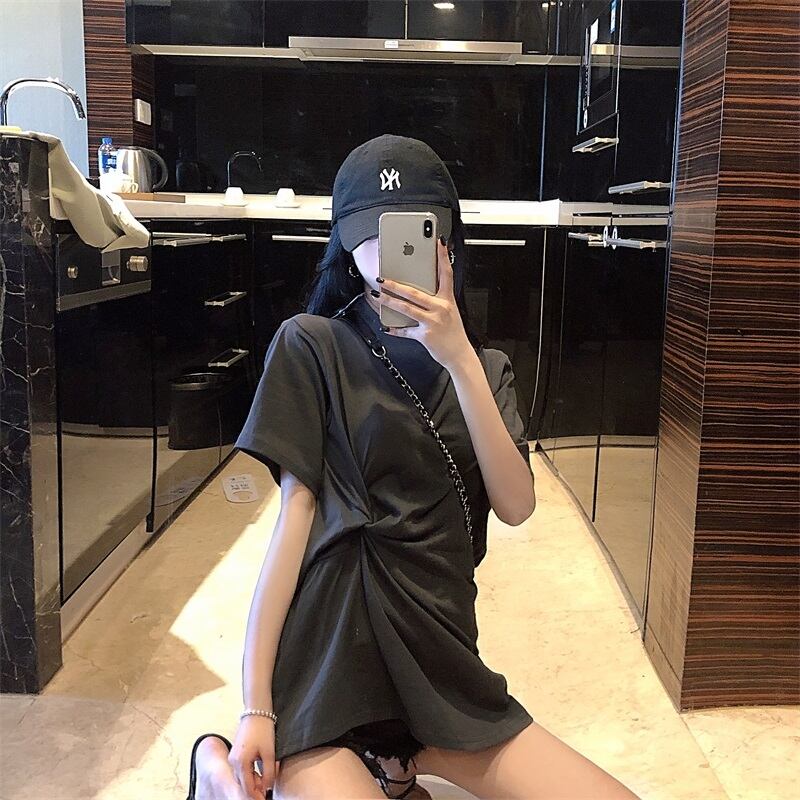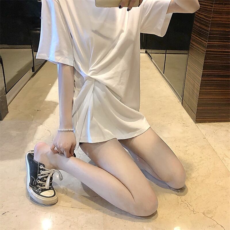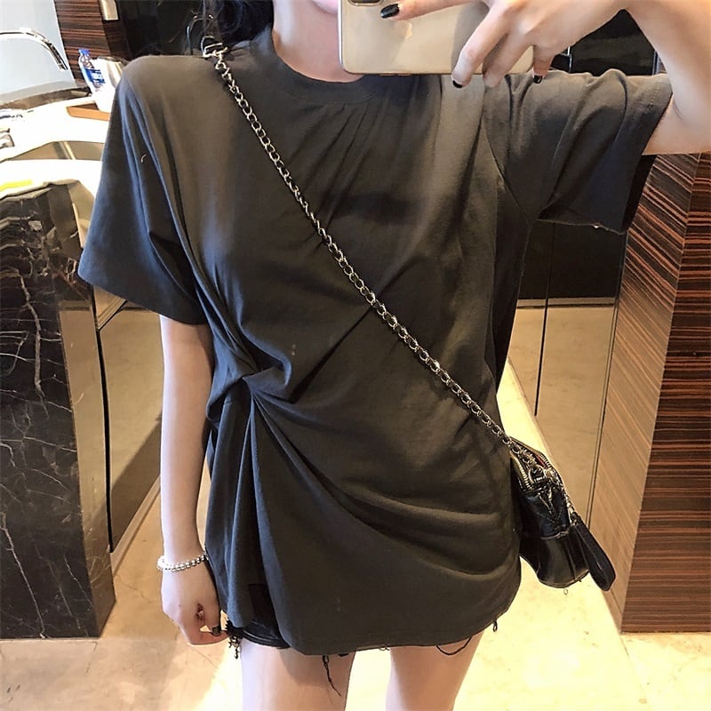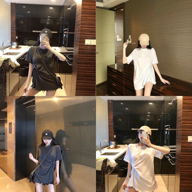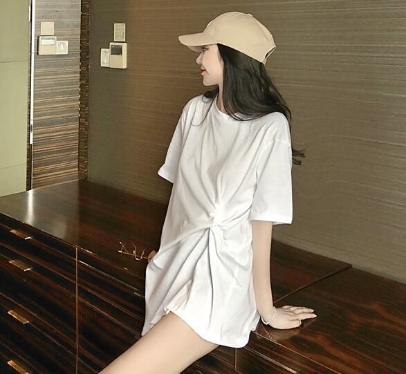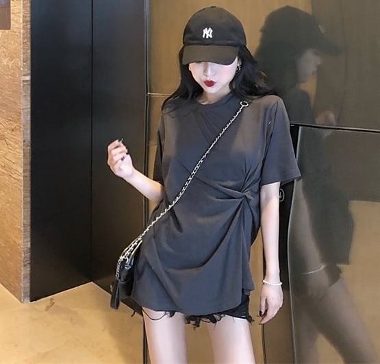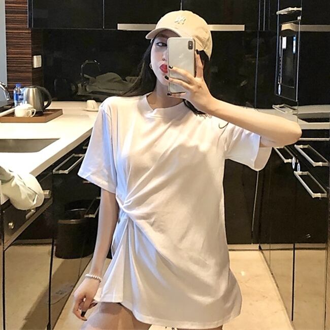 全2色 ロングTシャツ 前結び オーバーサイズ ゆったり シンプル 5分袖 カジュアル デイリー ベーシック ラフ お出かけ リラックシー 体型カバー 韓国ファッション 春 夏