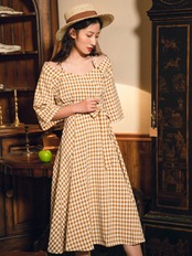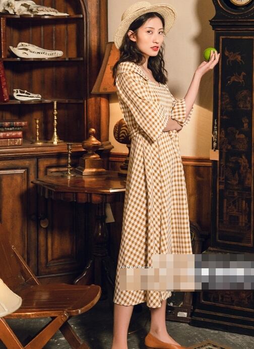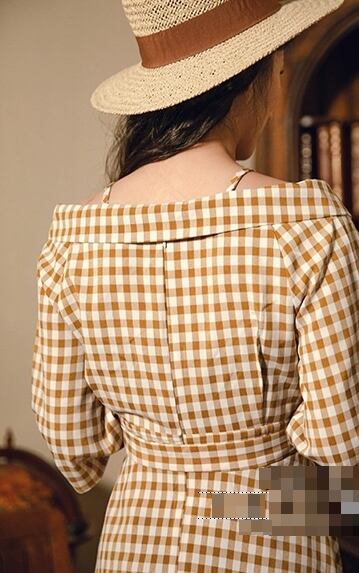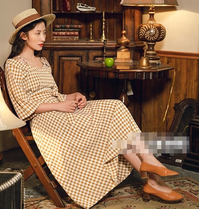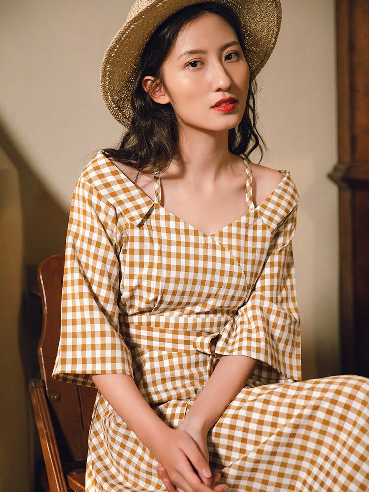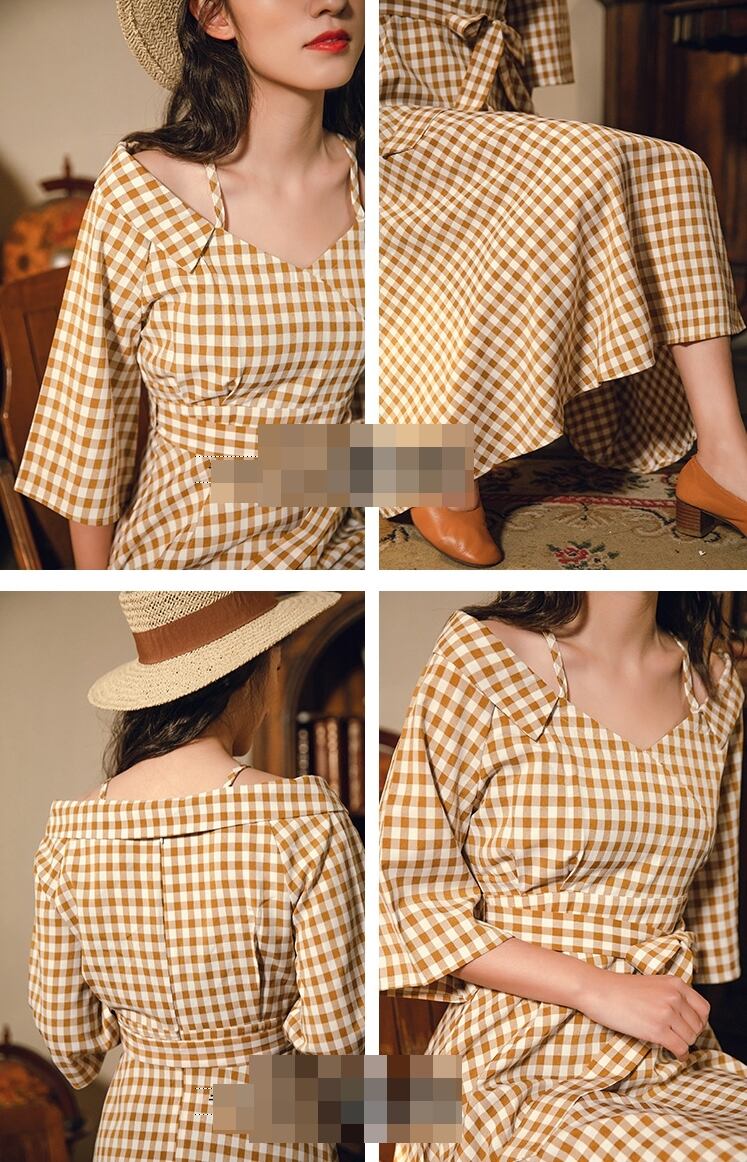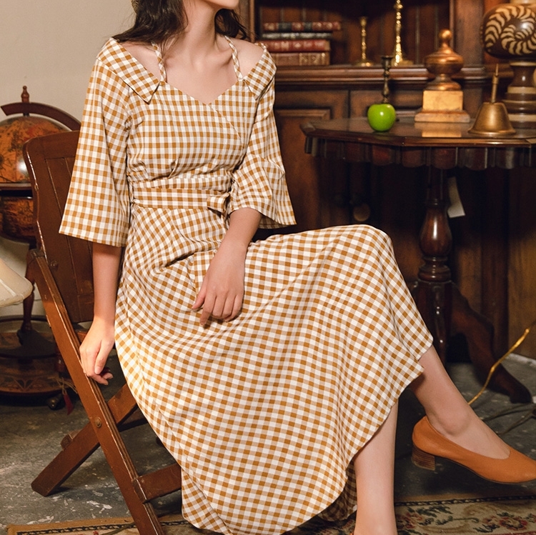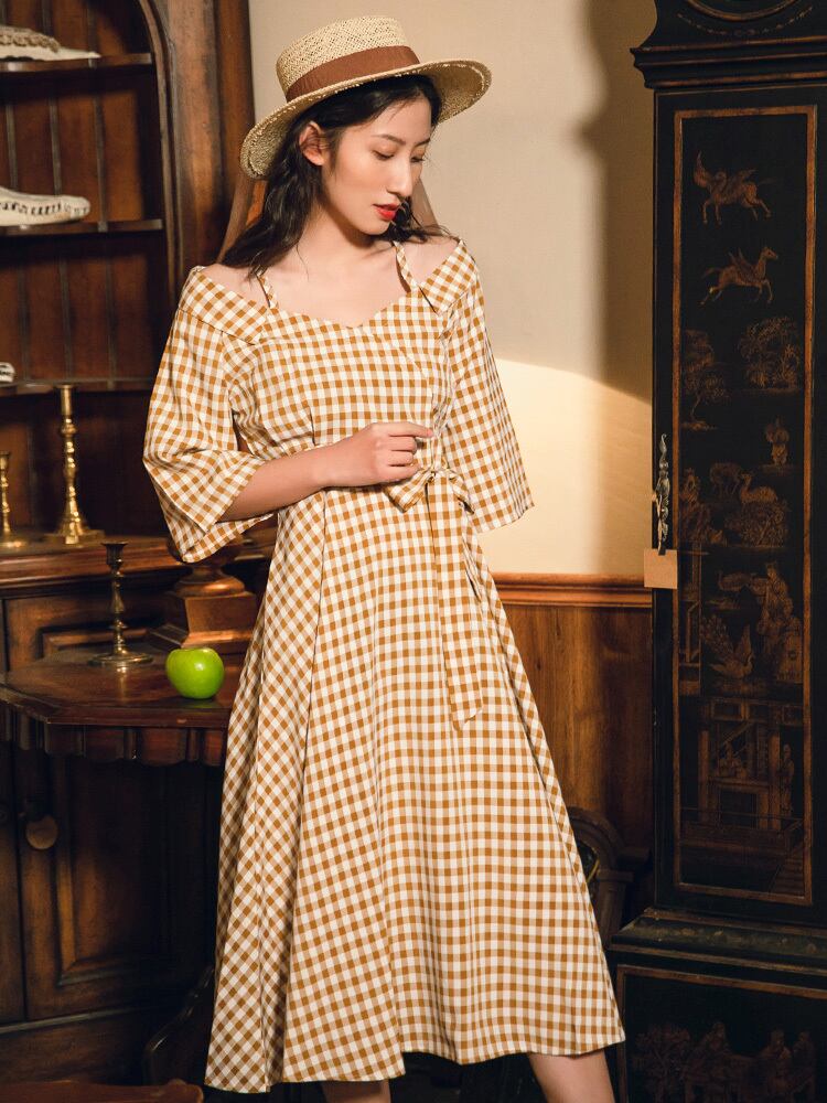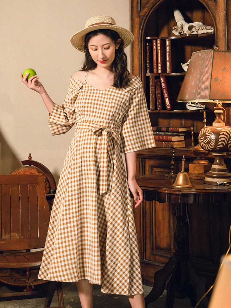 ワンピース チェック柄 ロング丈 オフショルダー ウエストリボン ハイウエスト 7分袖 フレア Aライン 大人可愛い レトロ カジュアル きれいめ 女子会 お出かけ 春 夏