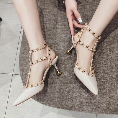 全4色 サンダル ミュール スタッズ ポインテッドトゥ アンクルストラップ ミドルヒール ハートヒール 大人可愛い きれいめ カジュアル デート 女子会 春 夏