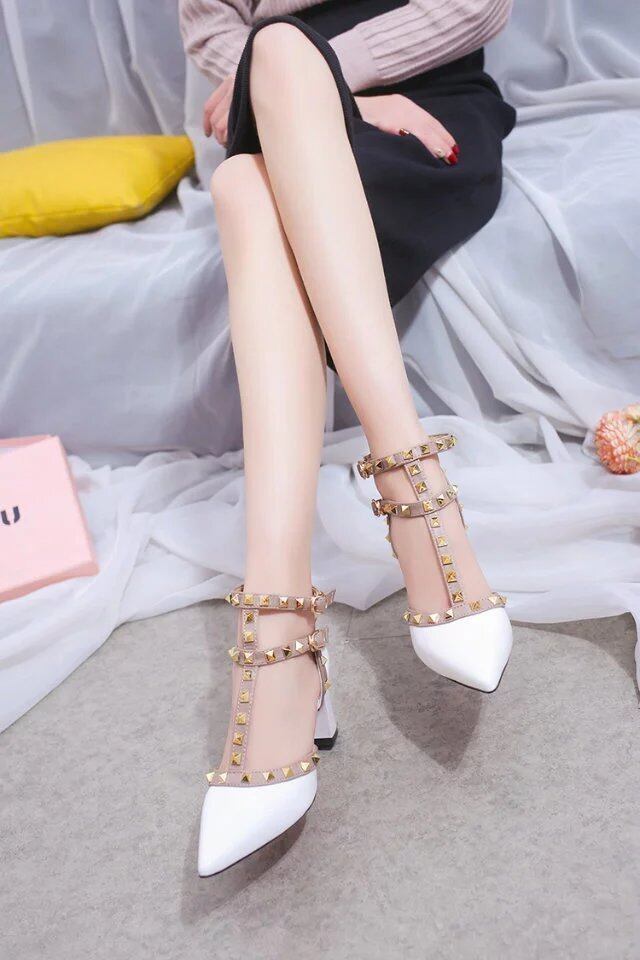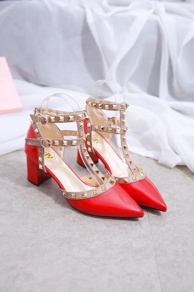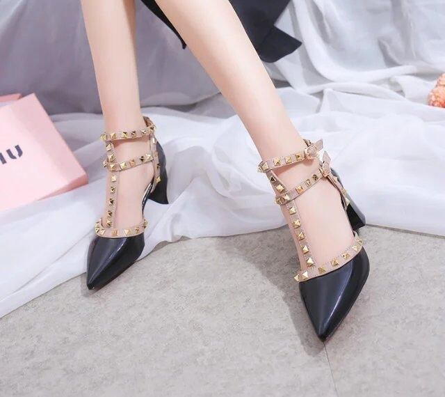 全4色 サンダル ミュール スタッズ ポインテッドトゥ アンクルストラップ ミドルヒール 可愛い ガーリー きれいめ カジュアル デート 女子会 春 夏