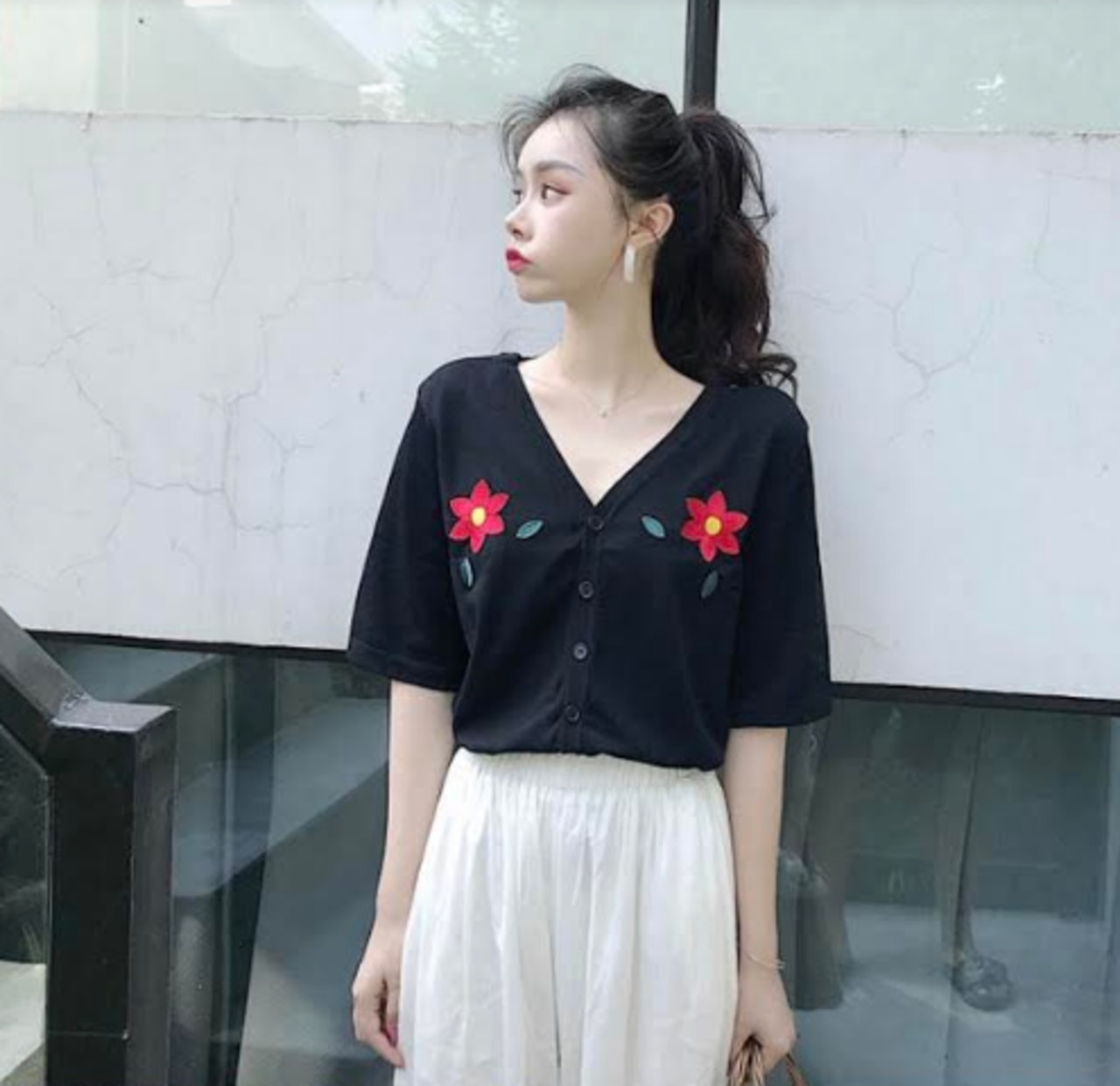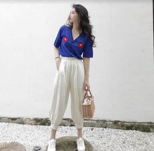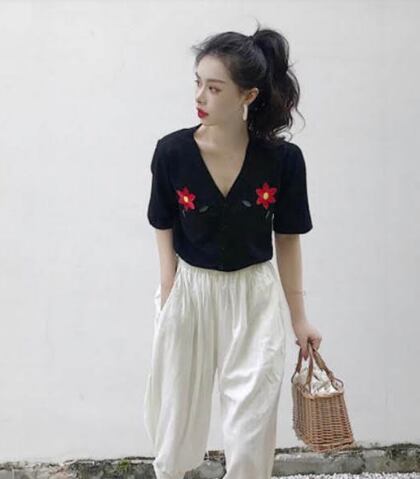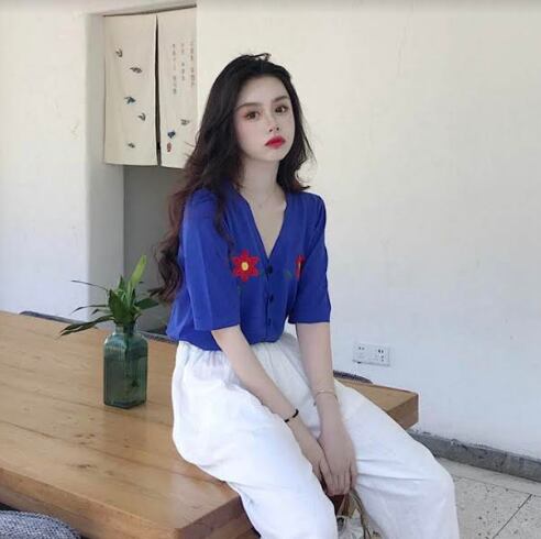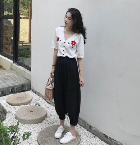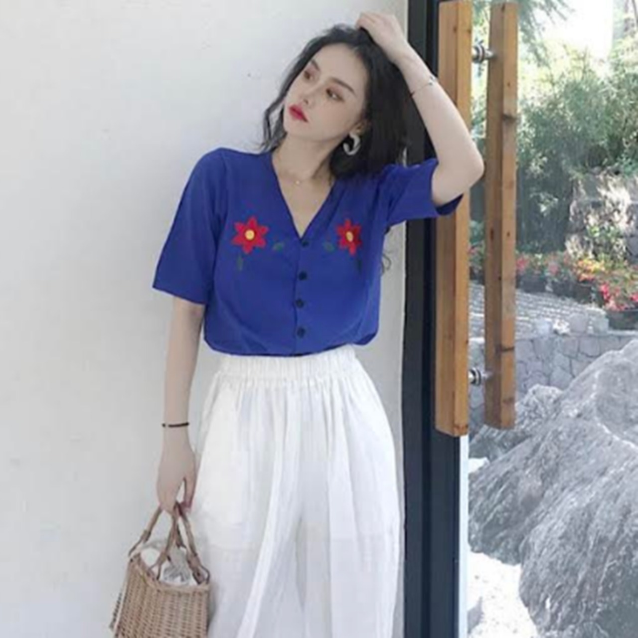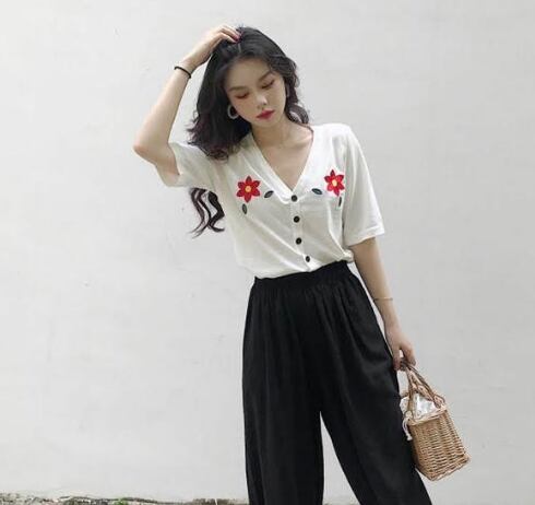 全3色 セットアップ ツーピース 刺繍 トップス ジョガーパンツ 8分丈 フロントボタン 5分袖 Vネック 花柄 ハイウエスト ウエストゴム 大人可愛い カジュアル お出かけ リラックシー 韓国ファッション 春 夏